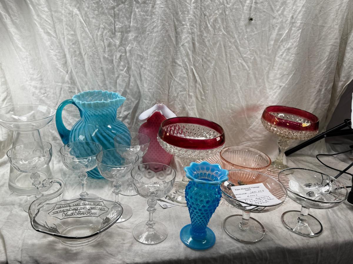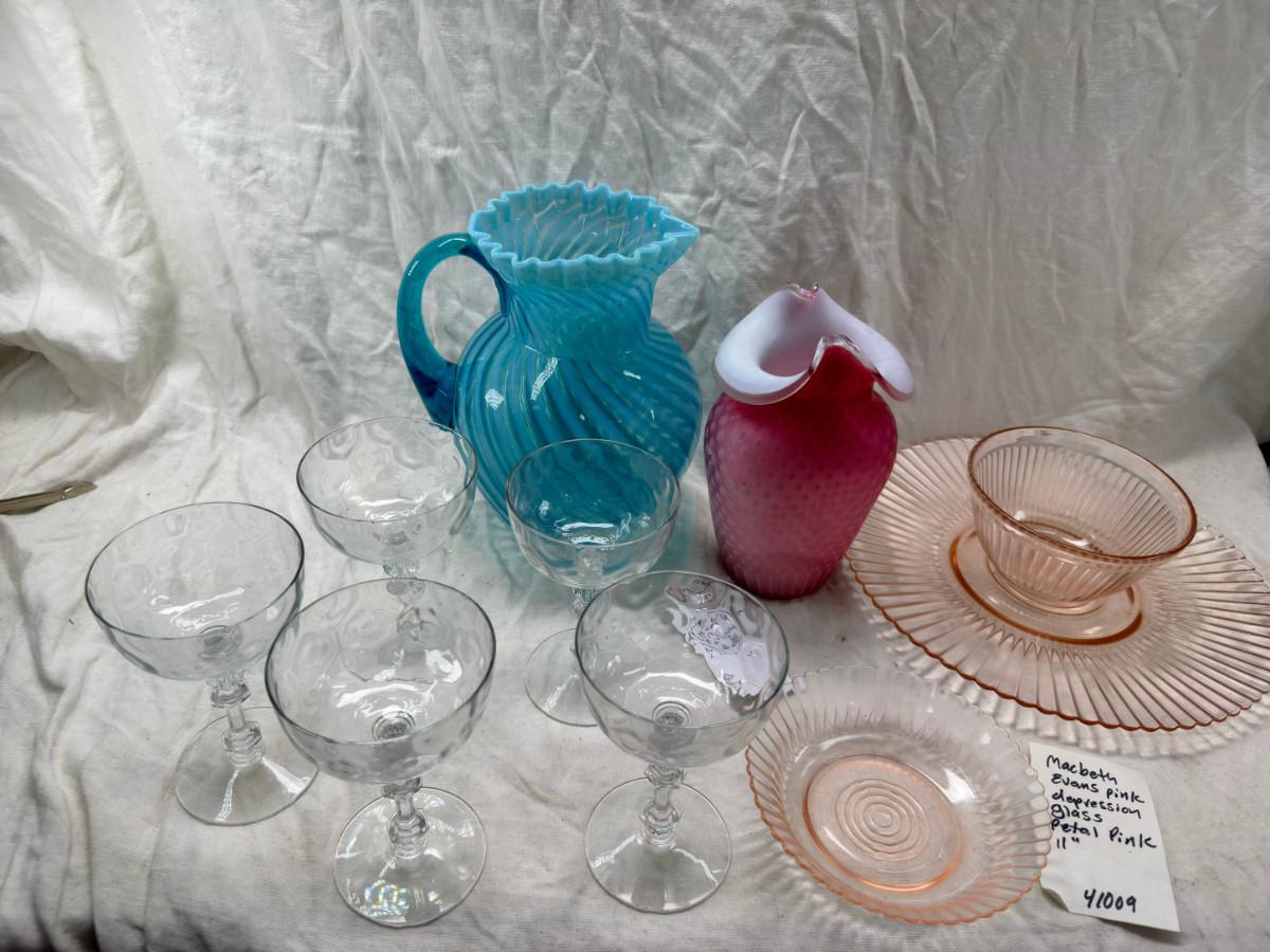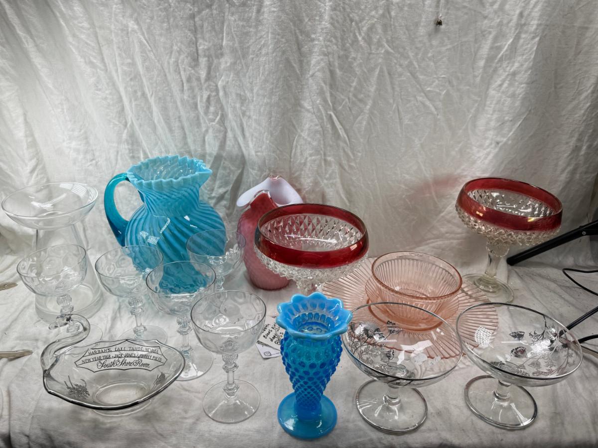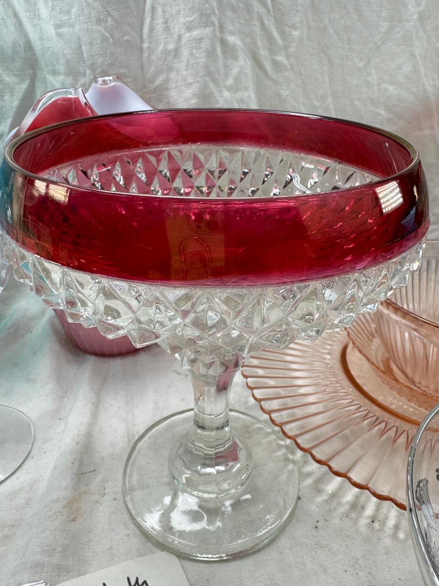 Silver overlay swan from Las Vegas, 2 compote glasses, Fenton hobnail bud vase, Quilted over lay vase ( small chip) 4 crystal wine glasses, Petal pink bowl and centerpiece plate, 2 large cranberry and quilted compote glasses. Large striped glass pitcher has a crack so just for display.