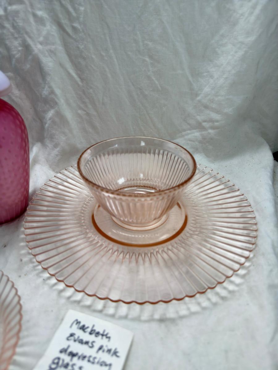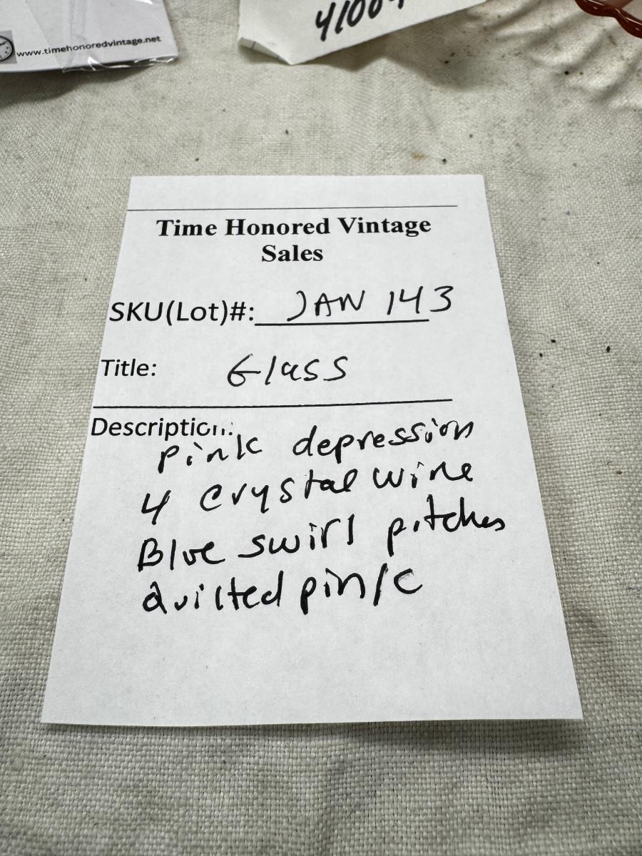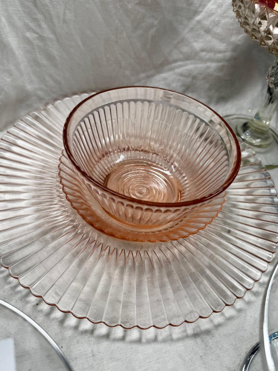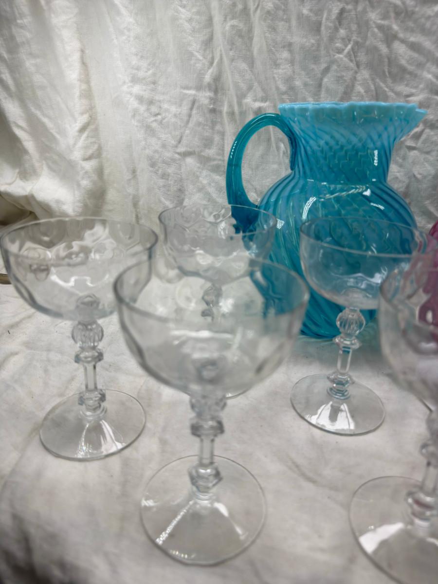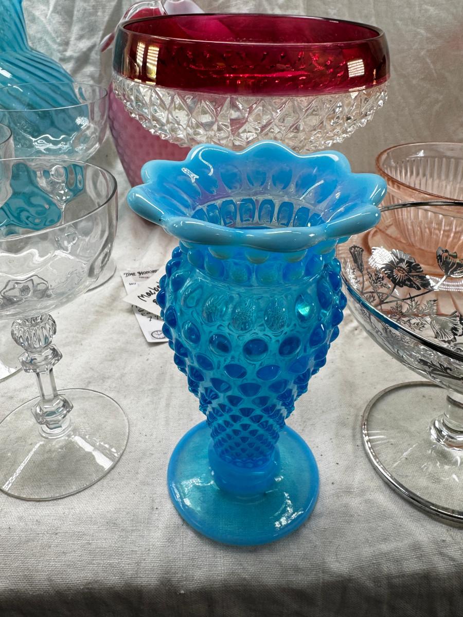 Silver overlay swan from Las Vegas, 2 compote glasses, Fenton hobnail bud vase, Quilted over lay vase ( small chip) 4 crystal wine glasses, Petal pink bowl and centerpiece plate, 2 large cranberry and quilted compote glasses. Large striped glass pitcher has a crack so just for display.