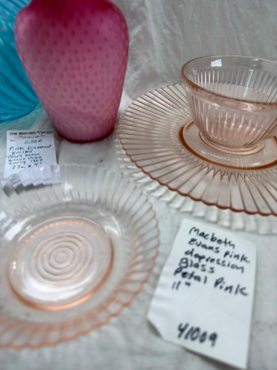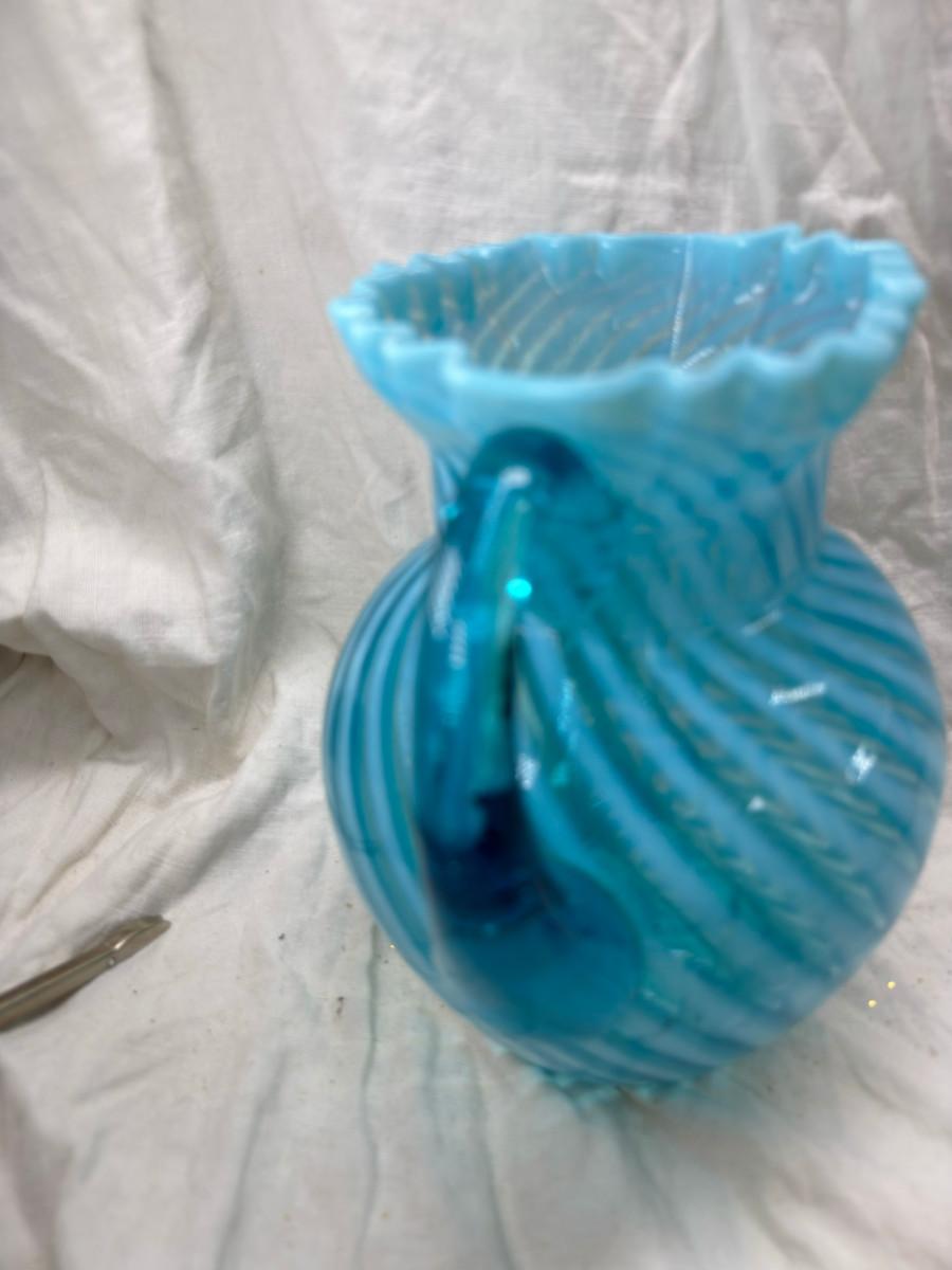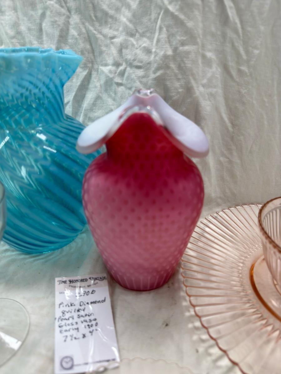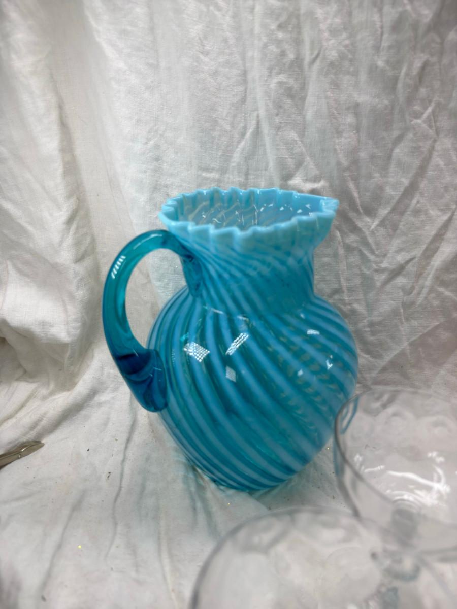 Silver overlay swan from Las Vegas, 2 compote glasses, Fenton hobnail bud vase, Quilted over lay vase ( small chip) 4 crystal wine glasses, Petal pink bowl and centerpiece plate, 2 large cranberry and quilted compote glasses. Large striped glass pitcher has a crack so just for display.