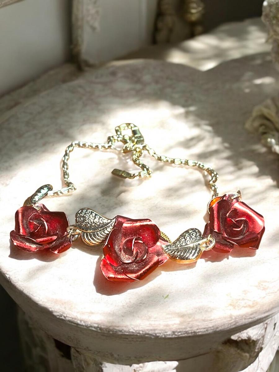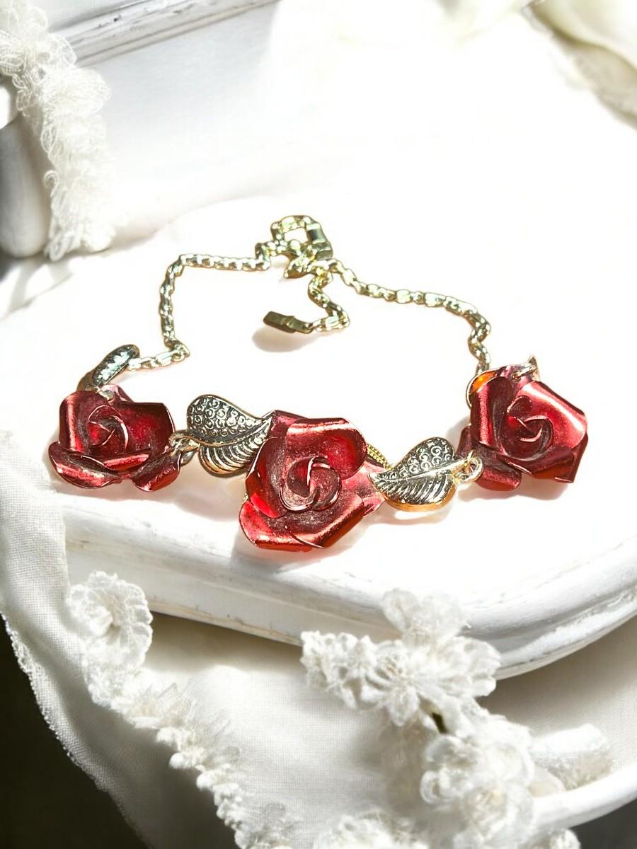 Condition: Some of the red enamel on the roses shows light wear, consistent with age, but the necklace still presents beautifully and lays well when worn.
