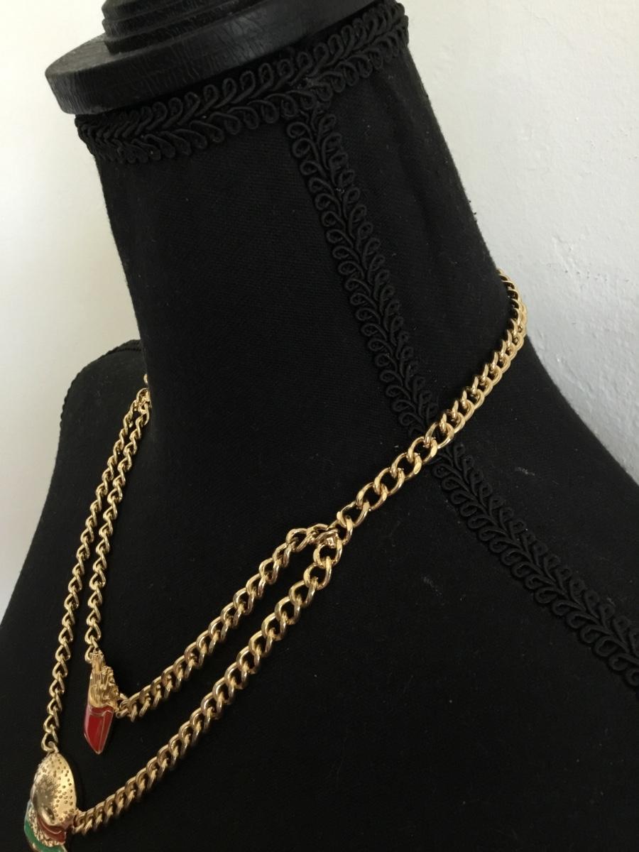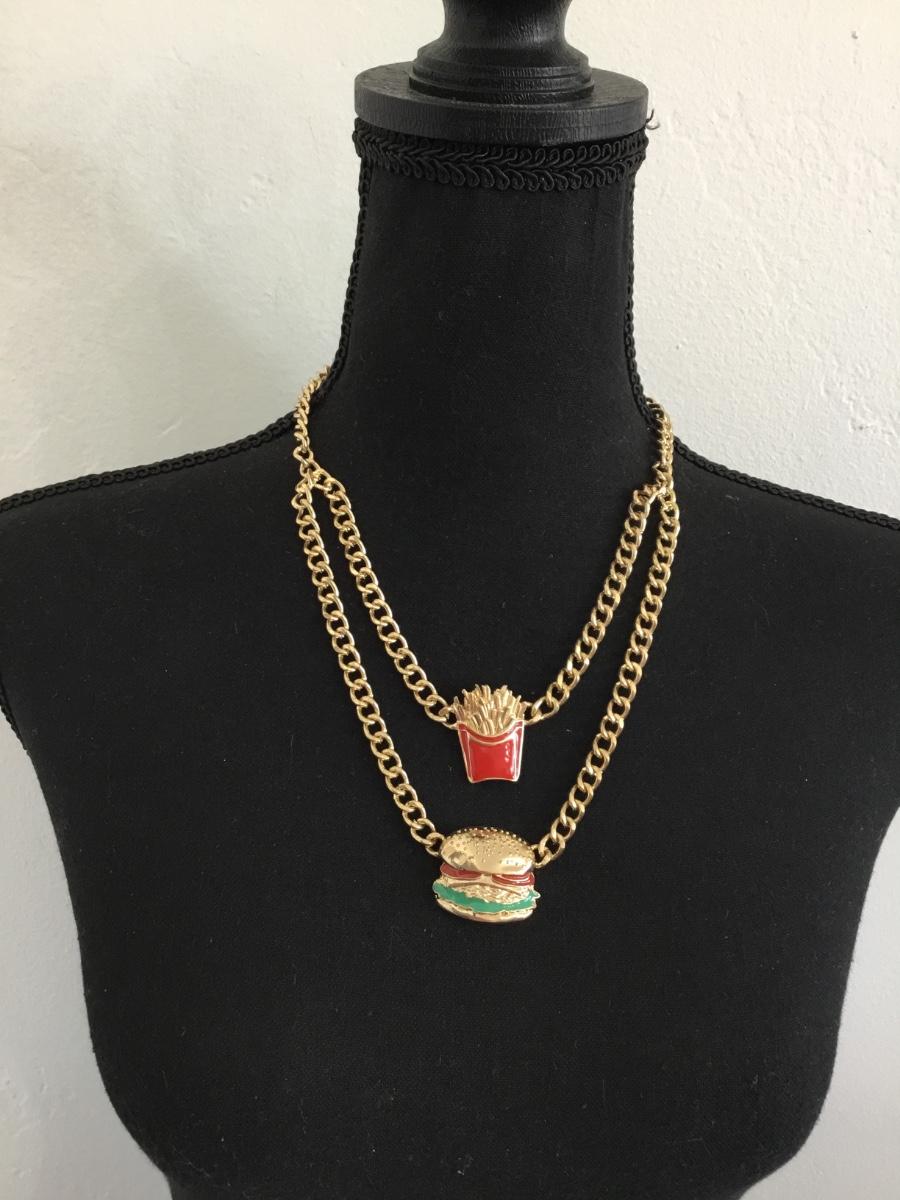 Mid century, gold tone, enamel, french fries, and hamburger statement necklace