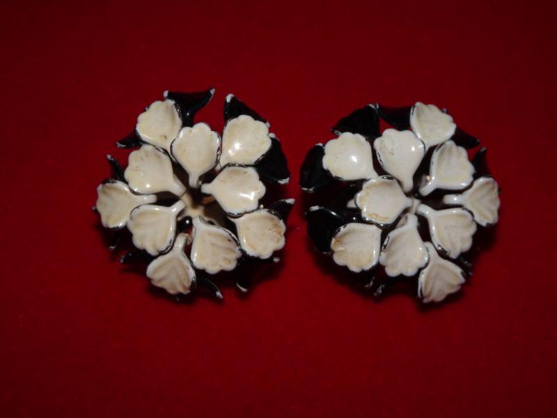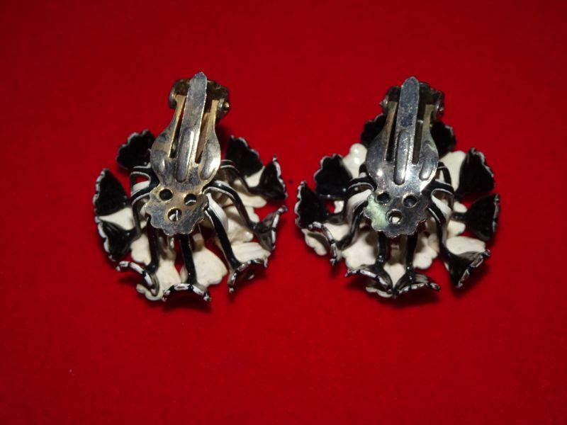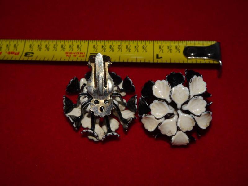 Mid Century Hand Painted Black & White Flower Clip On Earrings, WOW!