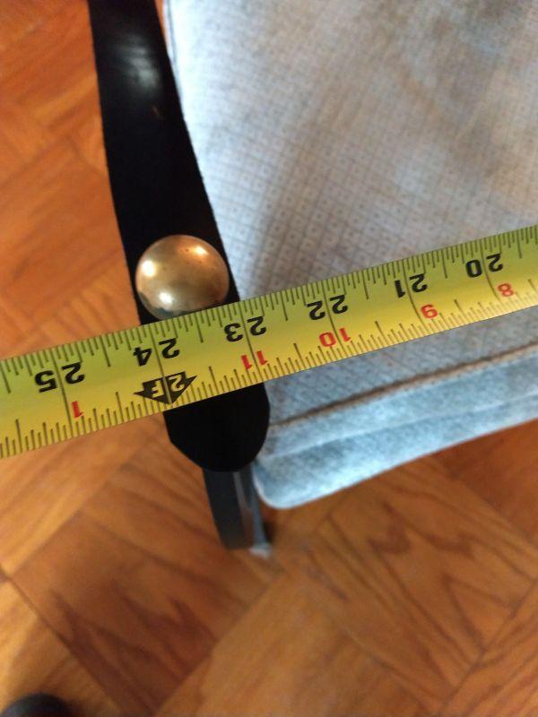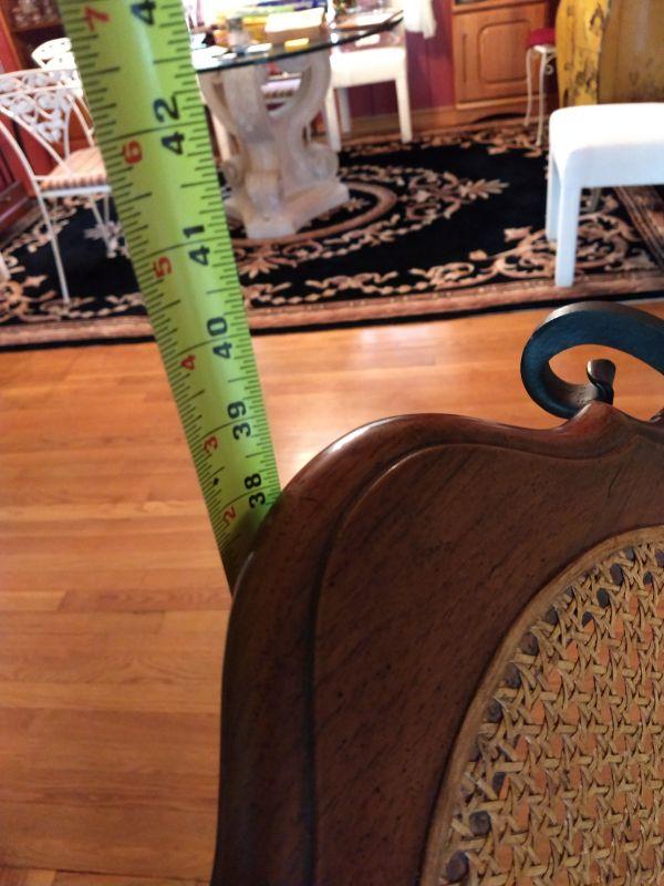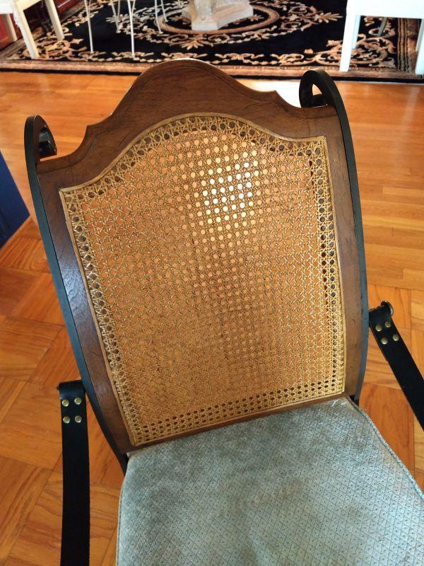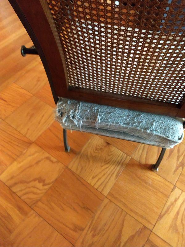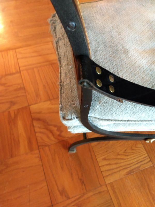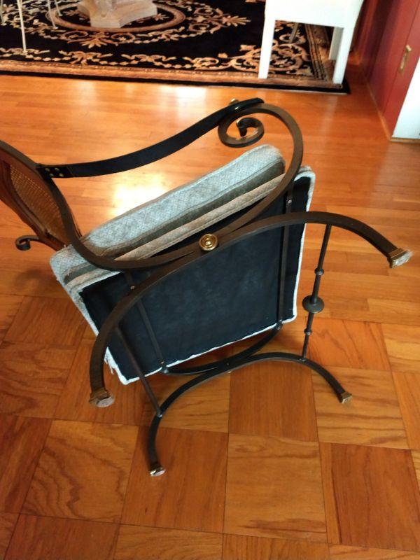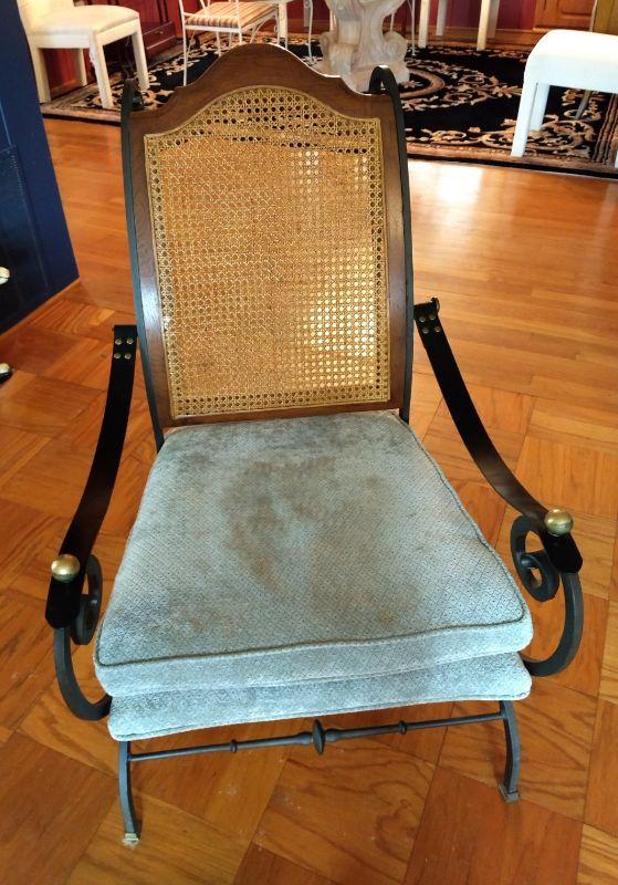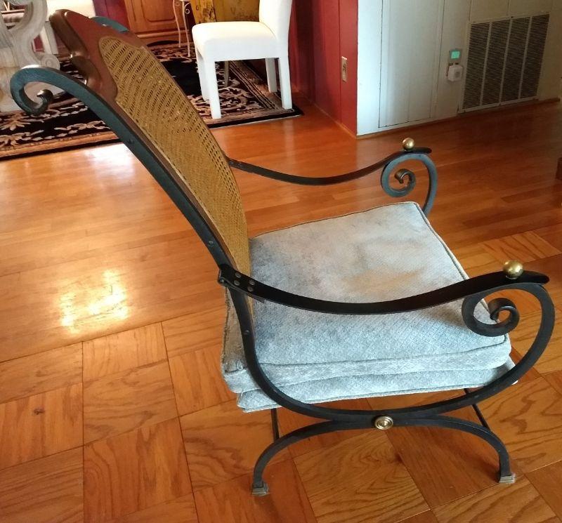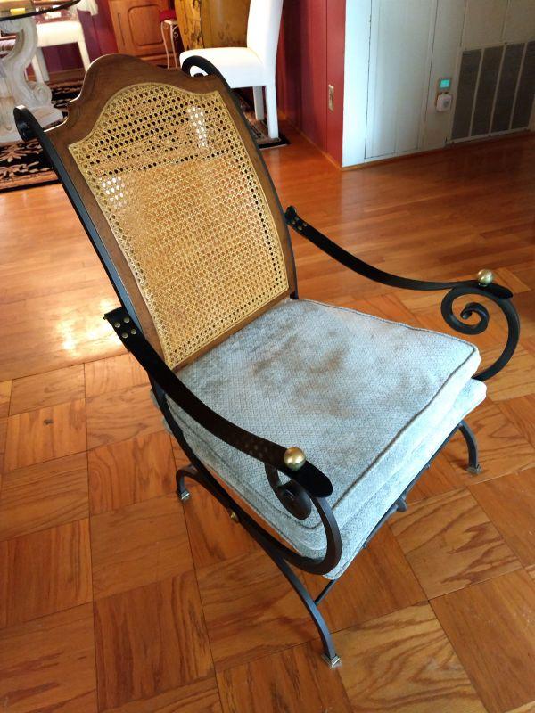 Mid Century Heavy Wrought Iron Cane Back Chair with Leather Strap Arms the seat cushion has been damaged on the backside as shown