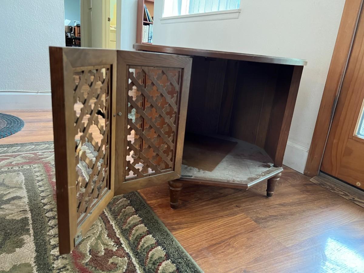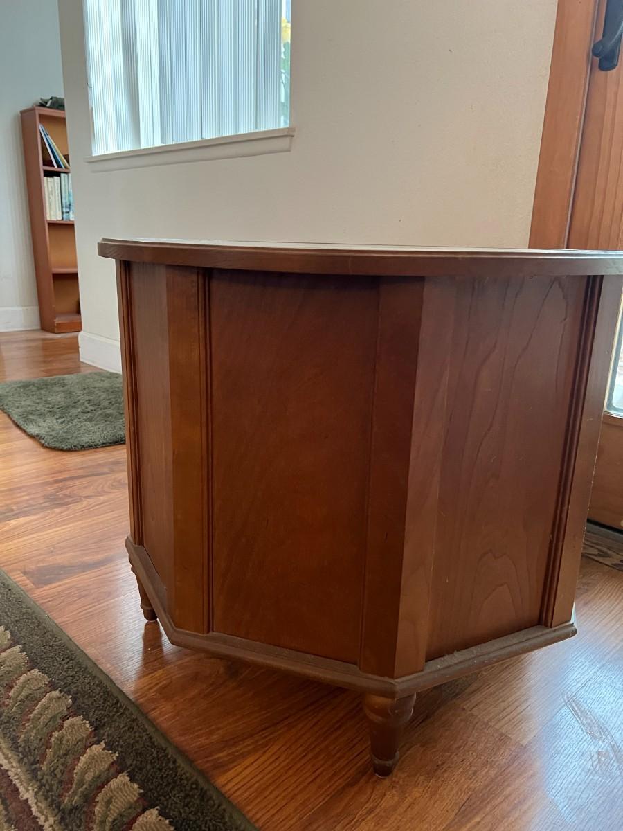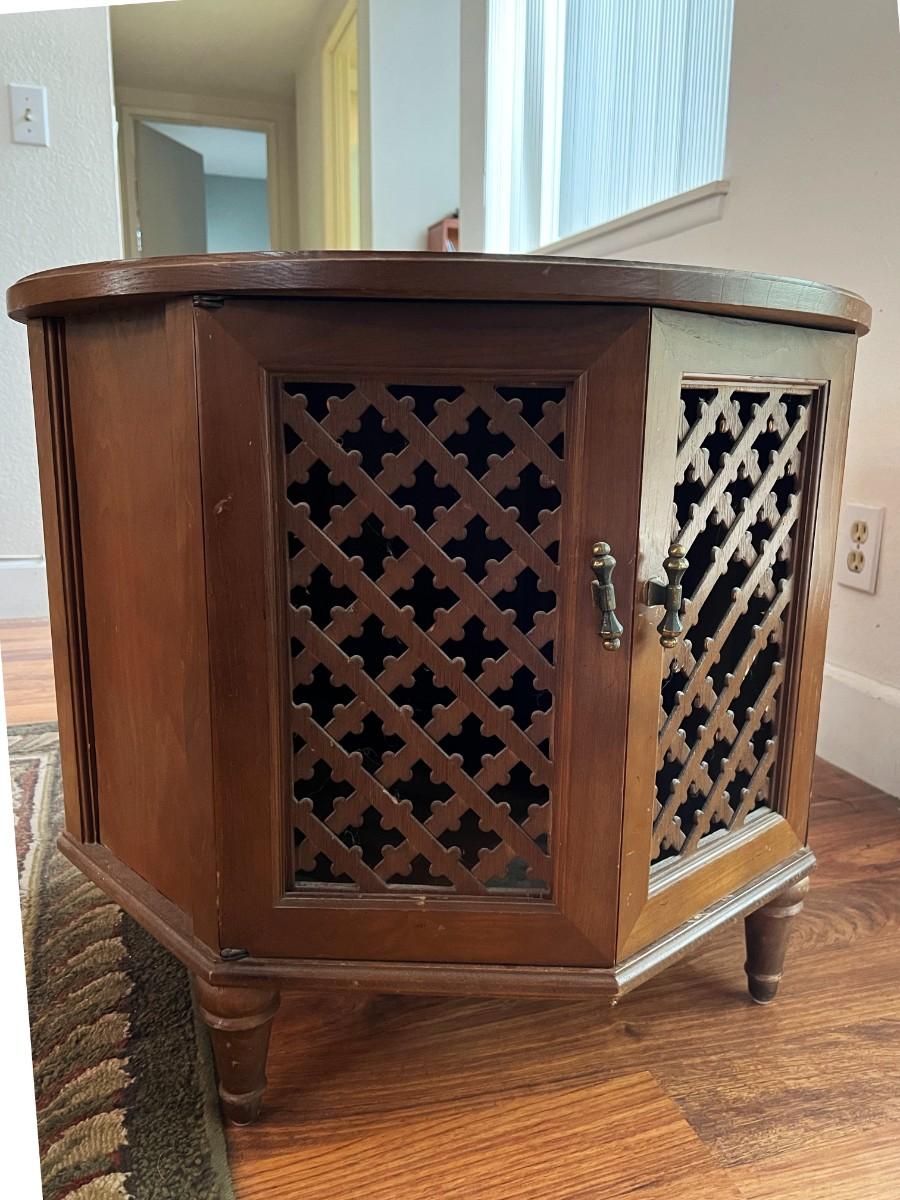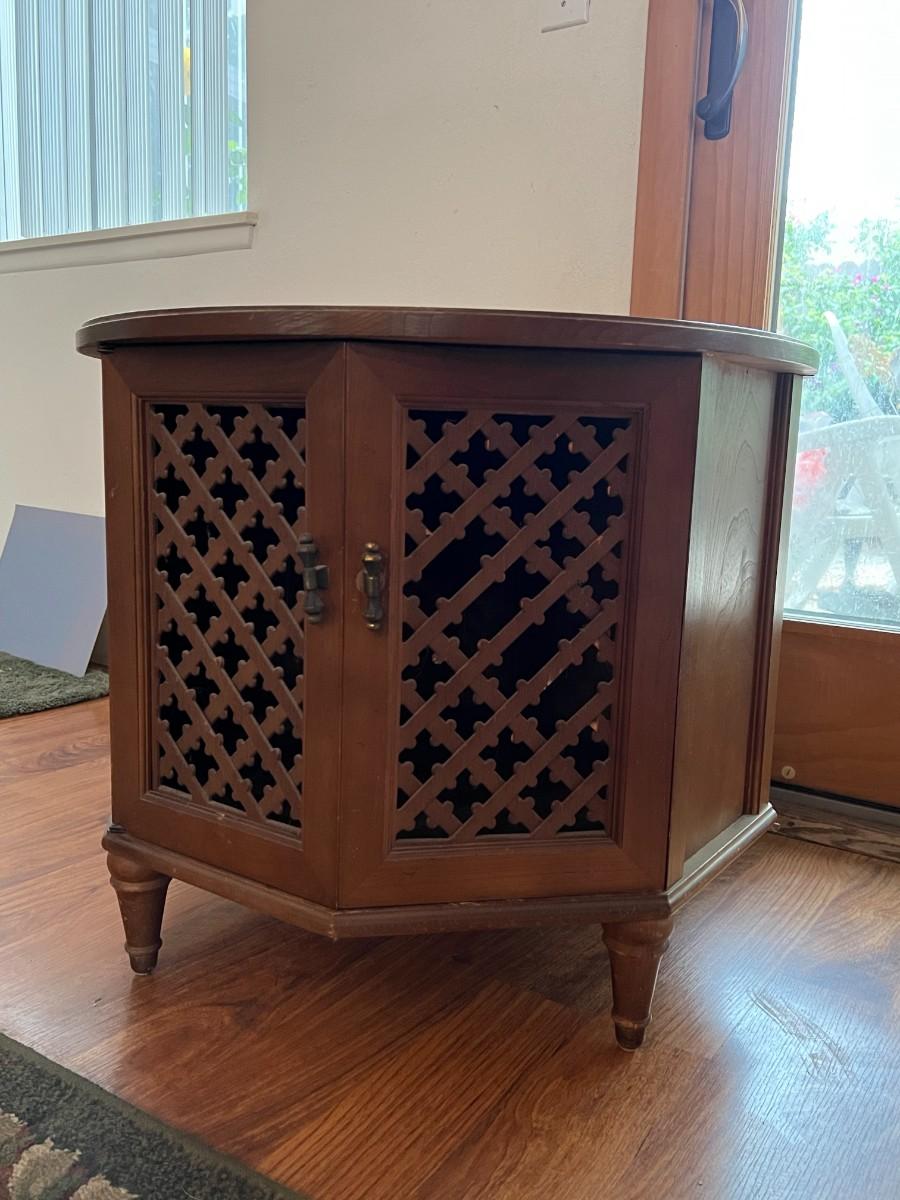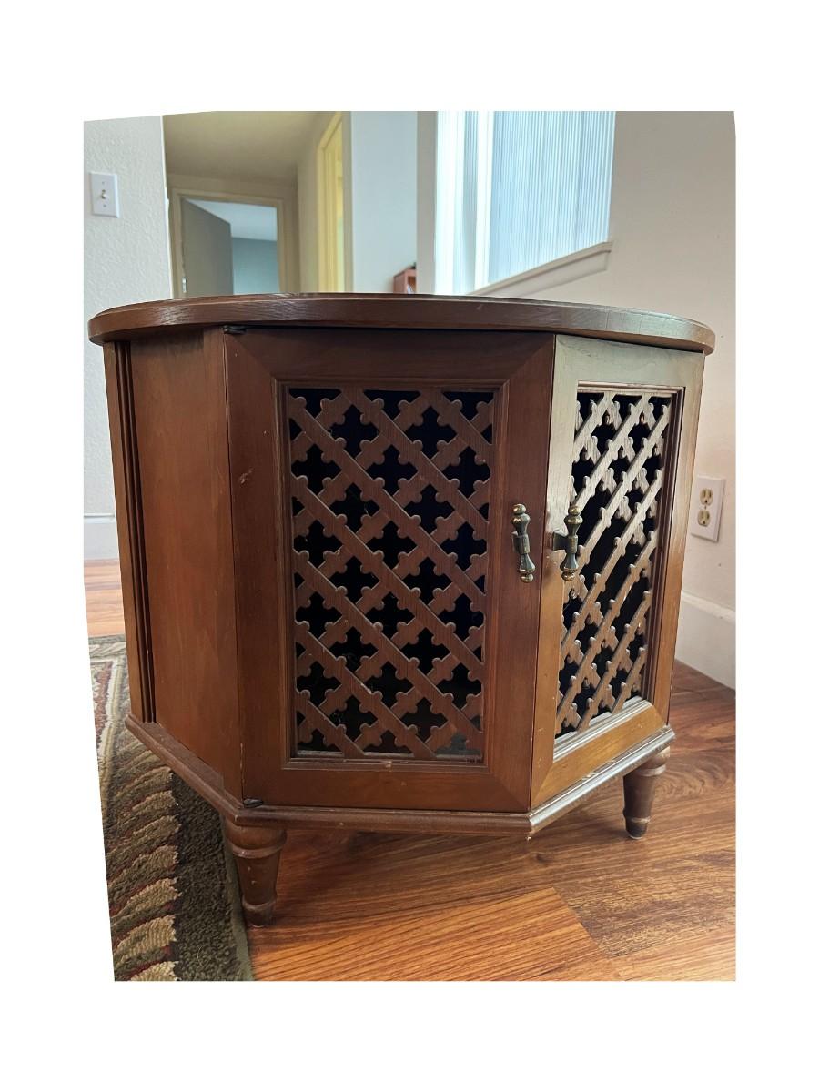 Mid Century Hexagon Side Round Top Side Table with Open Lattice Door. Great for refinishing. There is a lattice piece missing on the door as seen in pictures. A little over 2' wide and about 21" tall. ITEM IS CURRENTLY IN ORANGE; pickup will be coordinated within two weeks of auction close, no pickup date set.