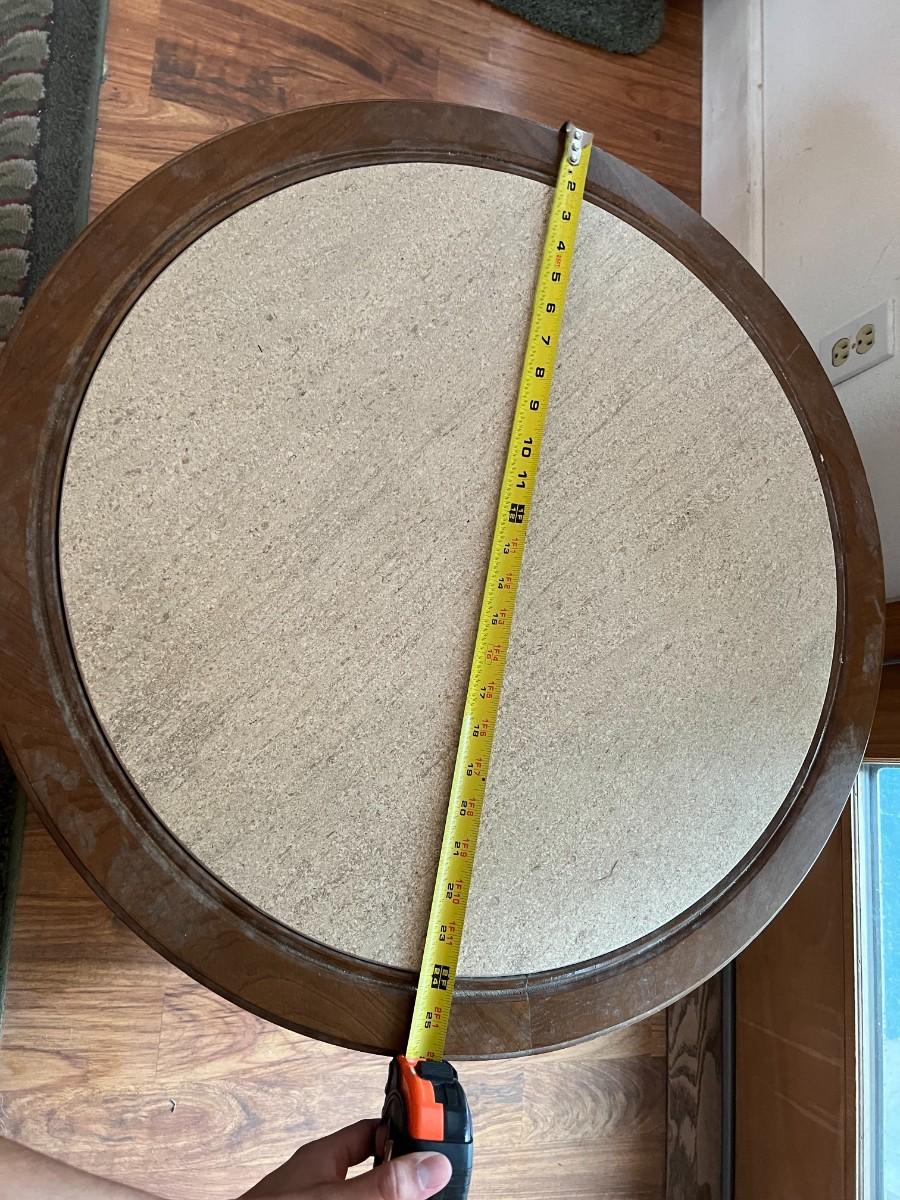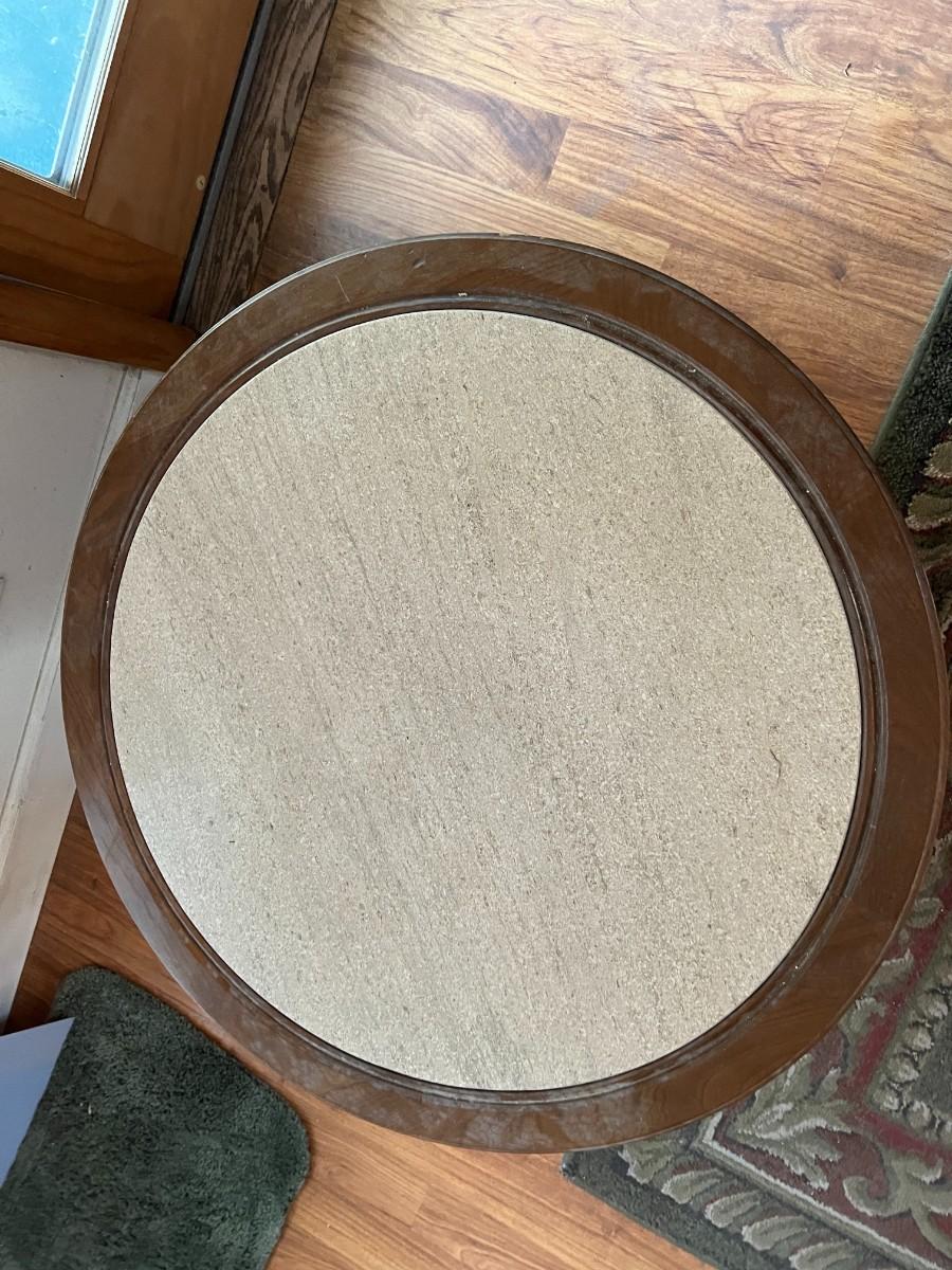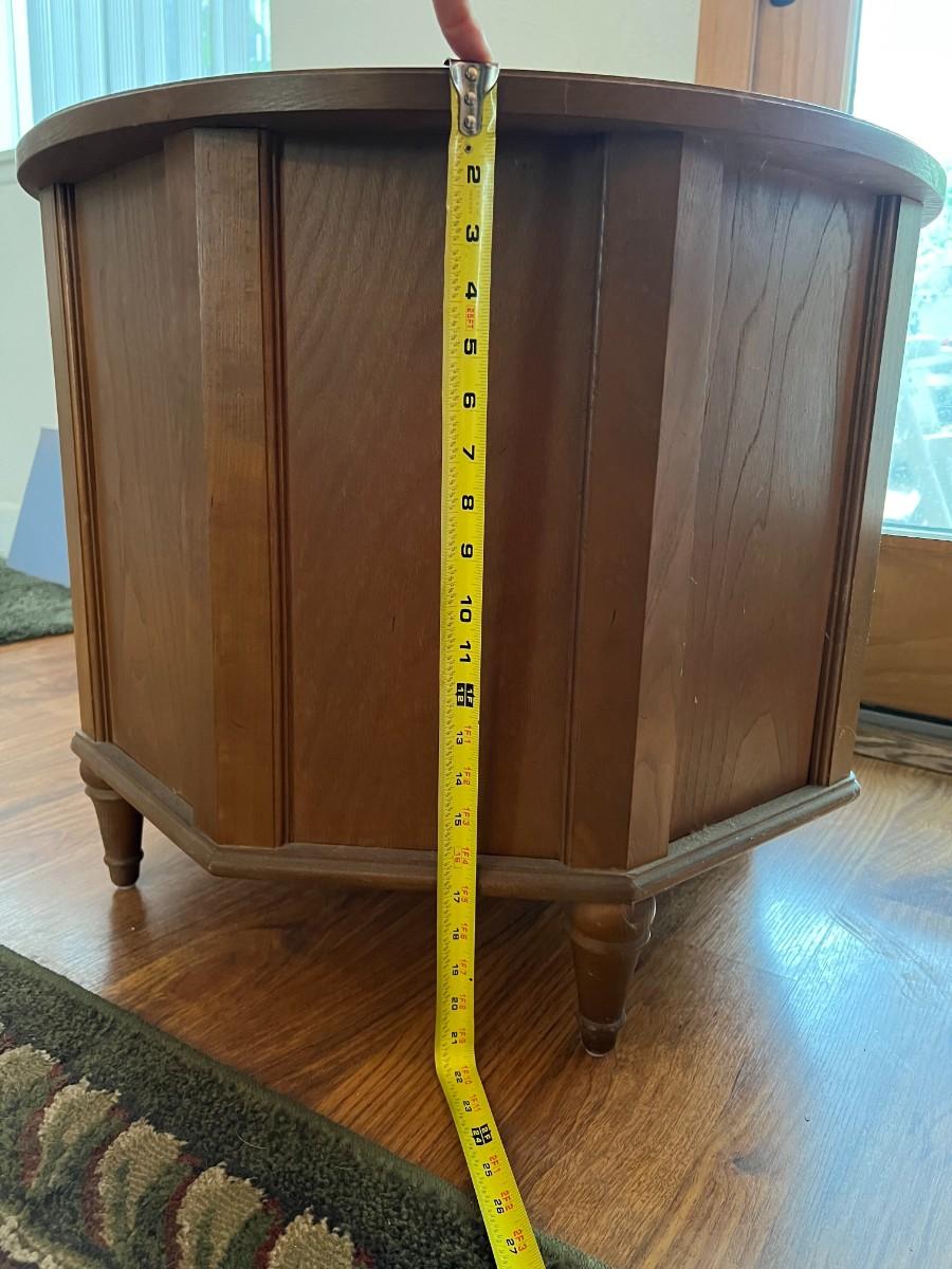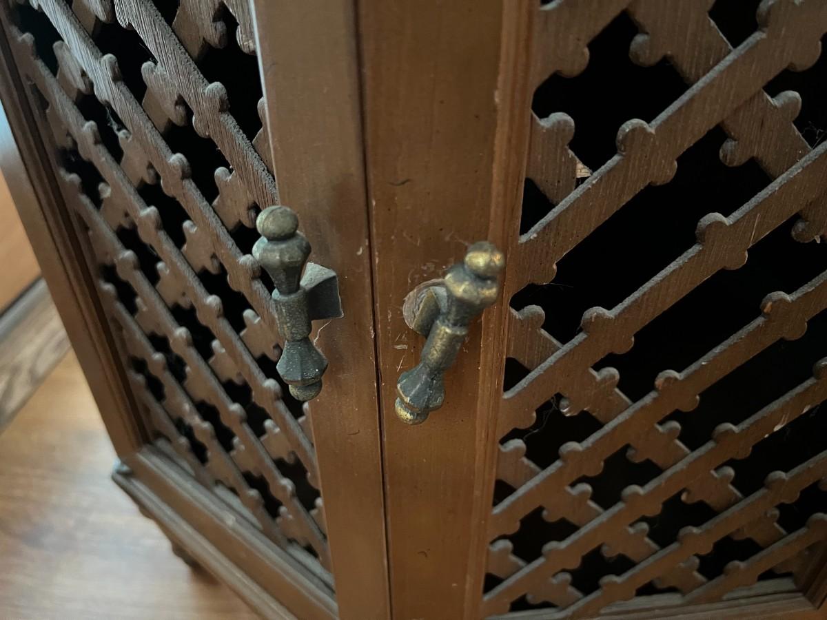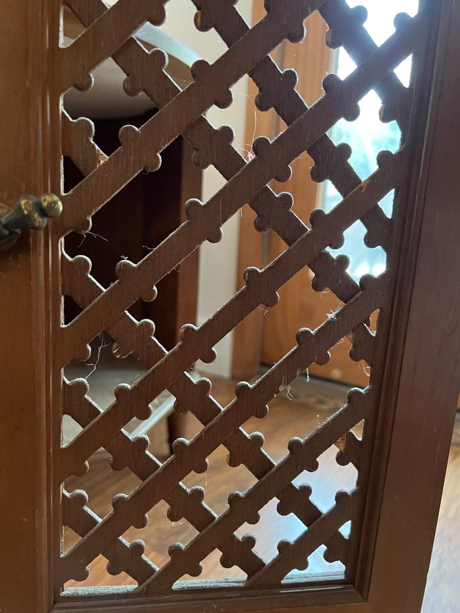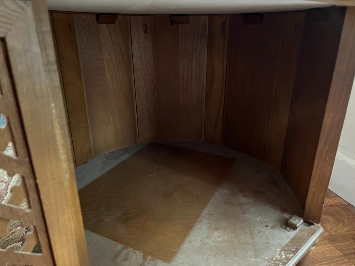 Mid Century Hexagon Side Round Top Side Table with Open Lattice Door. Great for refinishing. There is a lattice piece missing on the door as seen in pictures. A little over 2' wide and about 21" tall. ITEM IS CURRENTLY IN ORANGE; pickup will be coordinated within two weeks of auction close, no pickup date set.