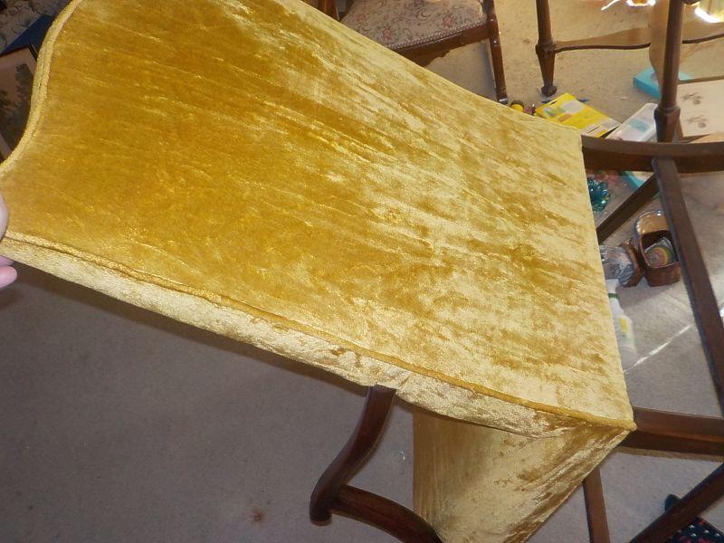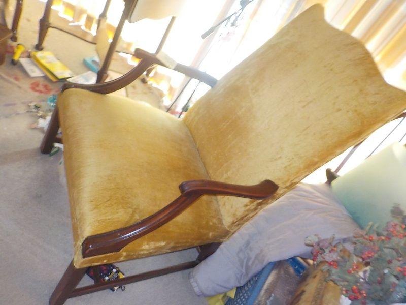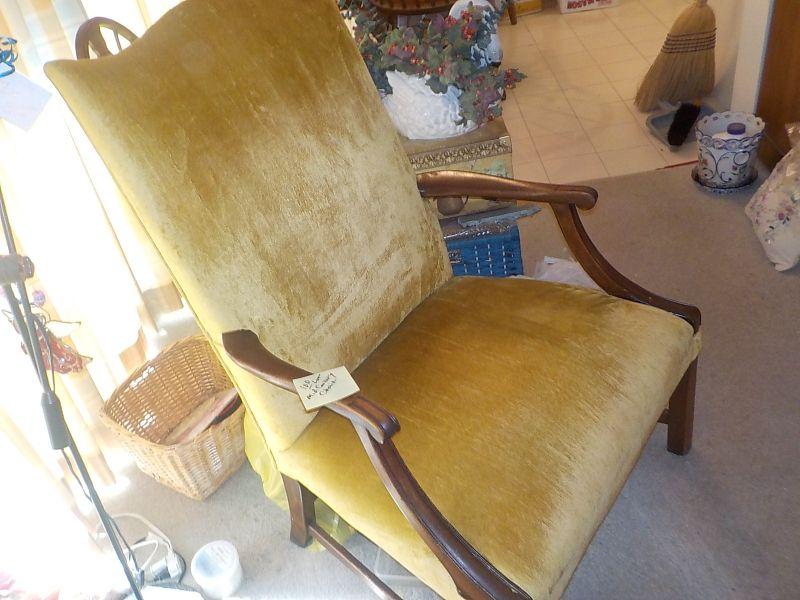 Mild yellow gold color with high back and arms. No weakness in chair solid and no stains or fur. None smoker. sz 36 x 25 x 24.