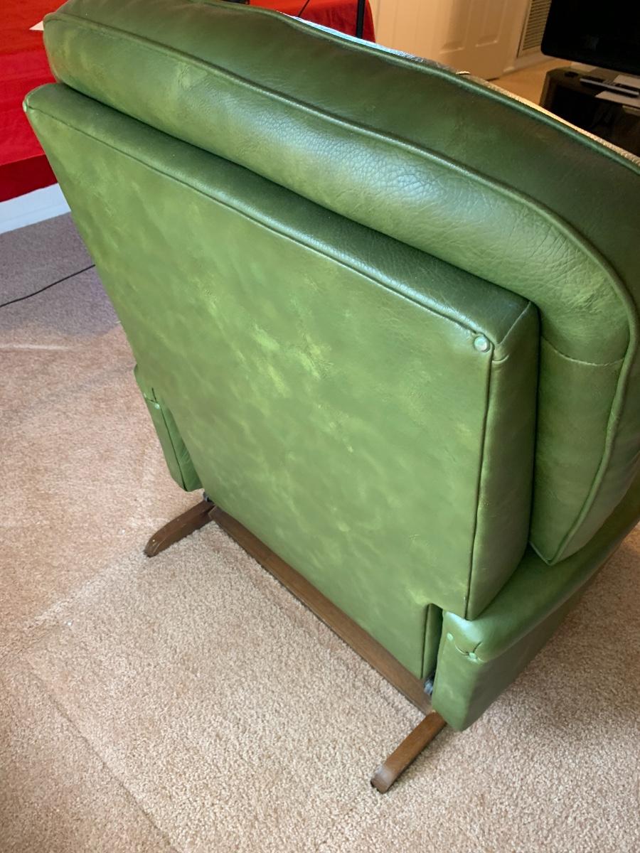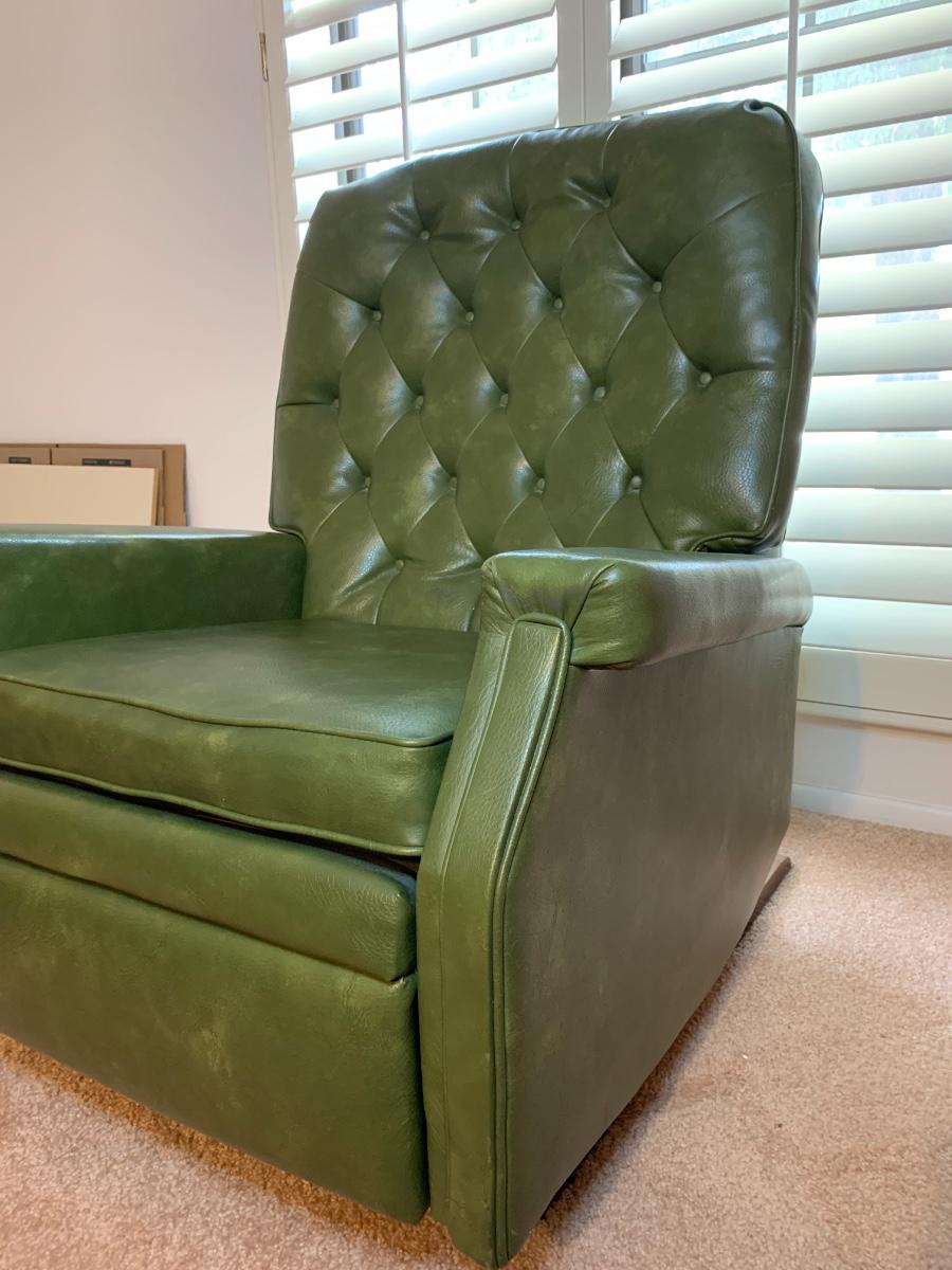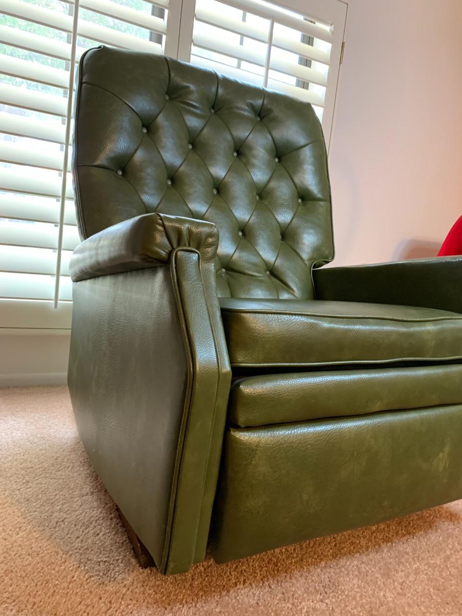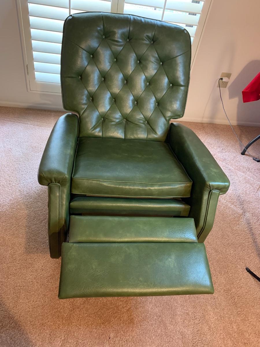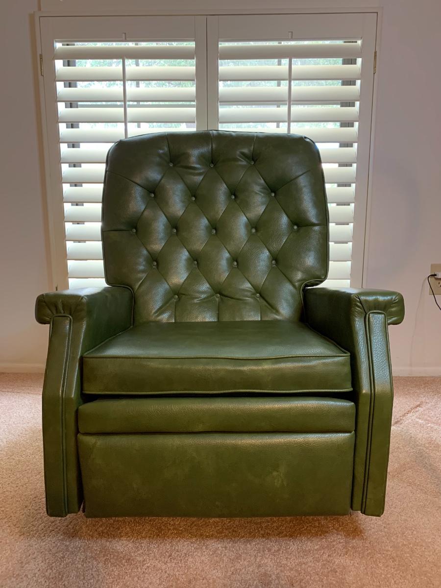 Mid Century Green Tufted back Leather Recliner. Back Height: 38”. Back Width: 29”. Seat Height 18” . Seat Depth 20”. Chair Depth Total 27”. In Excellent condition.