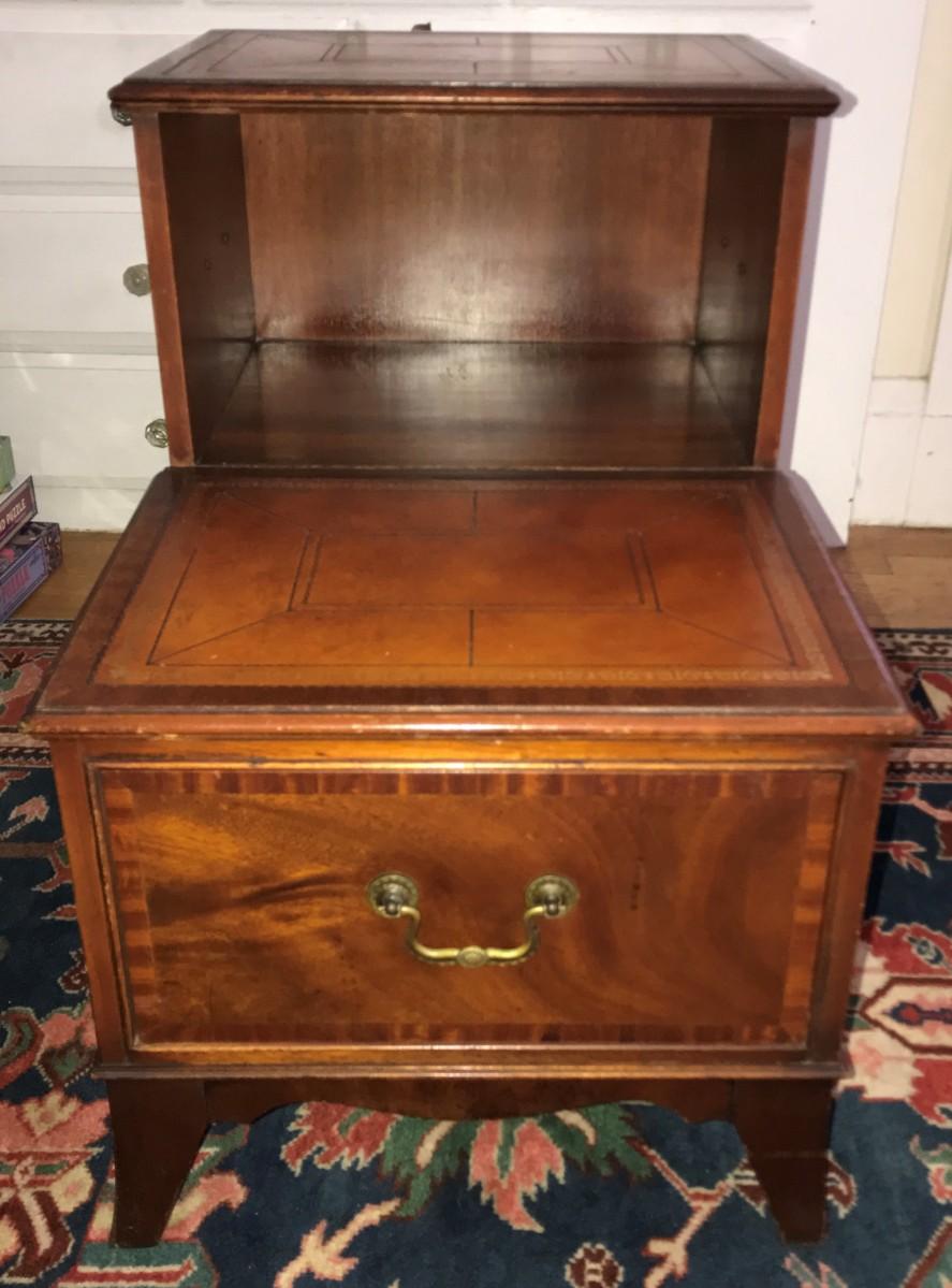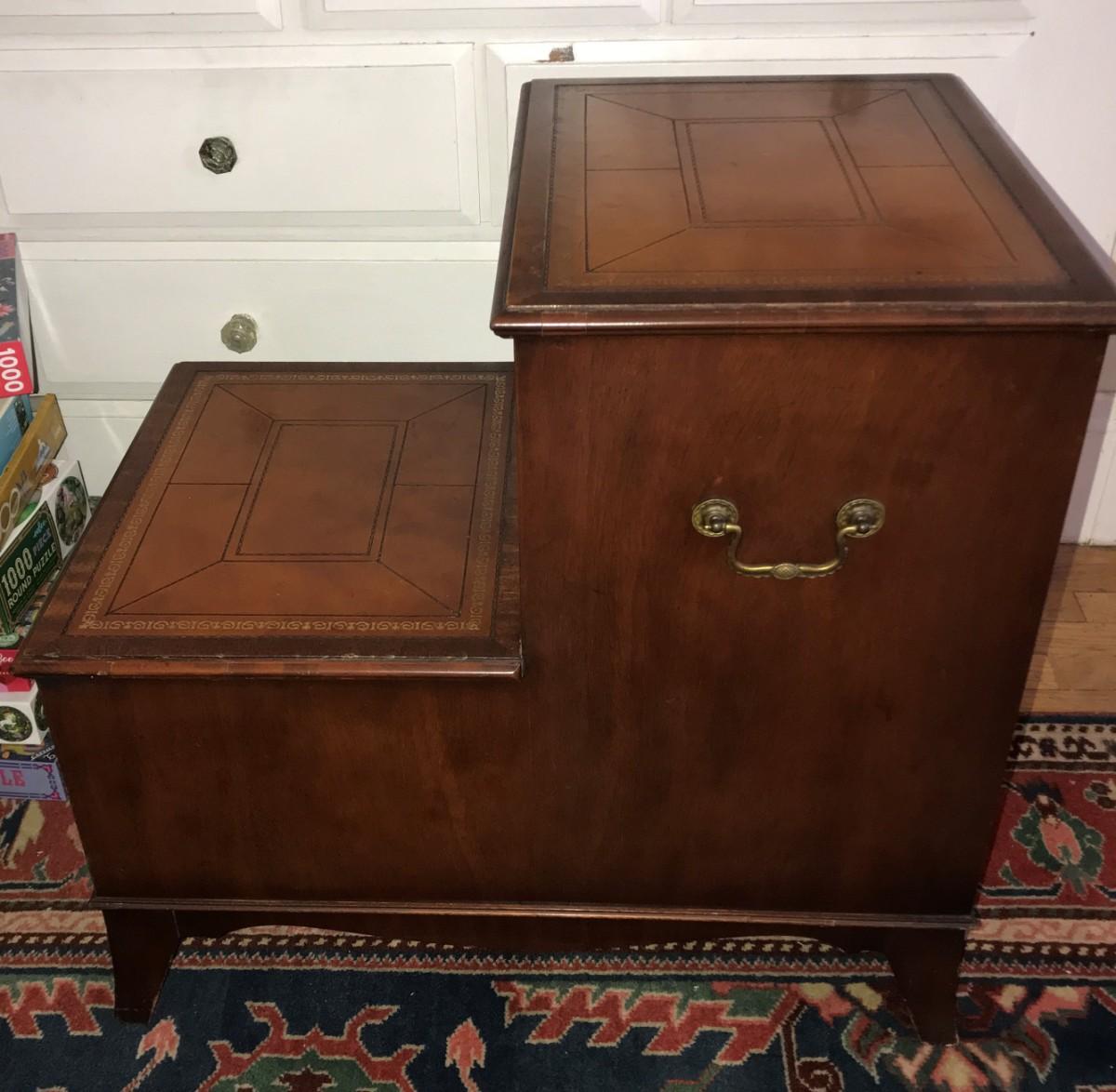 Antique flamed mahogany side table/ end table, step table by Heritage Henredon. Having tooled leather top with gold leaf accents, and a single dovetail drawer with brass handles, circa 1950's. Well cared for ~ Great condition !