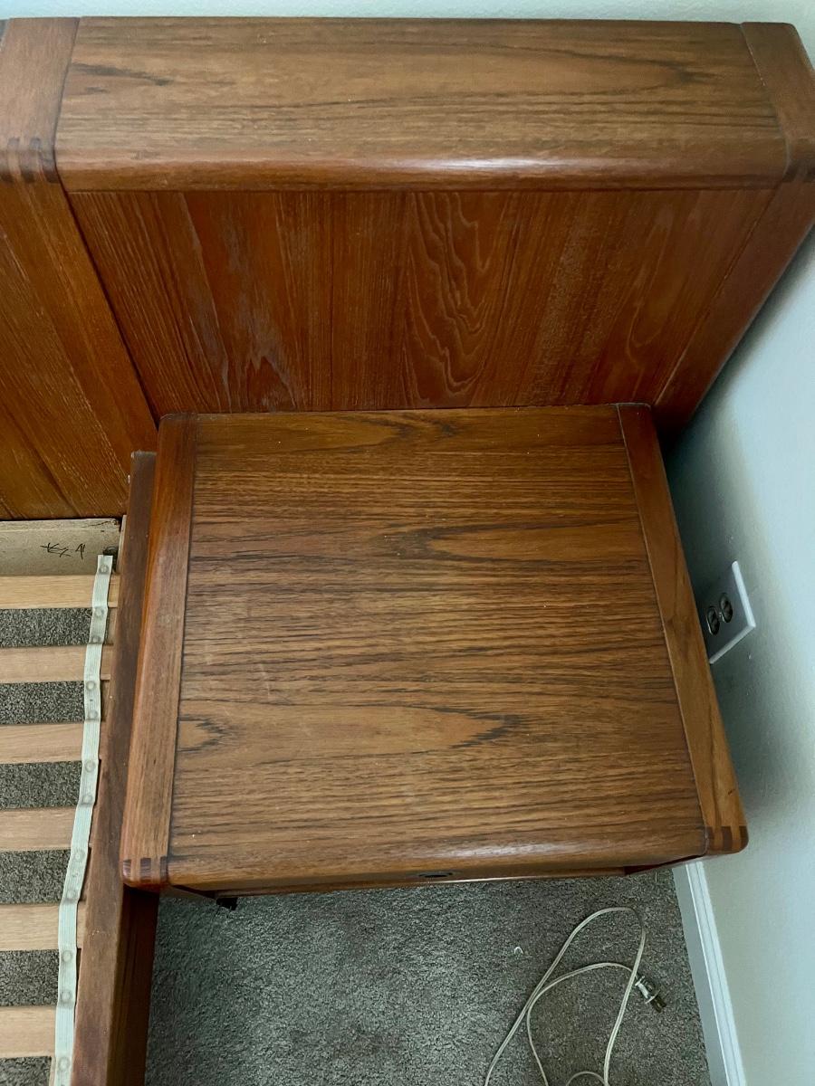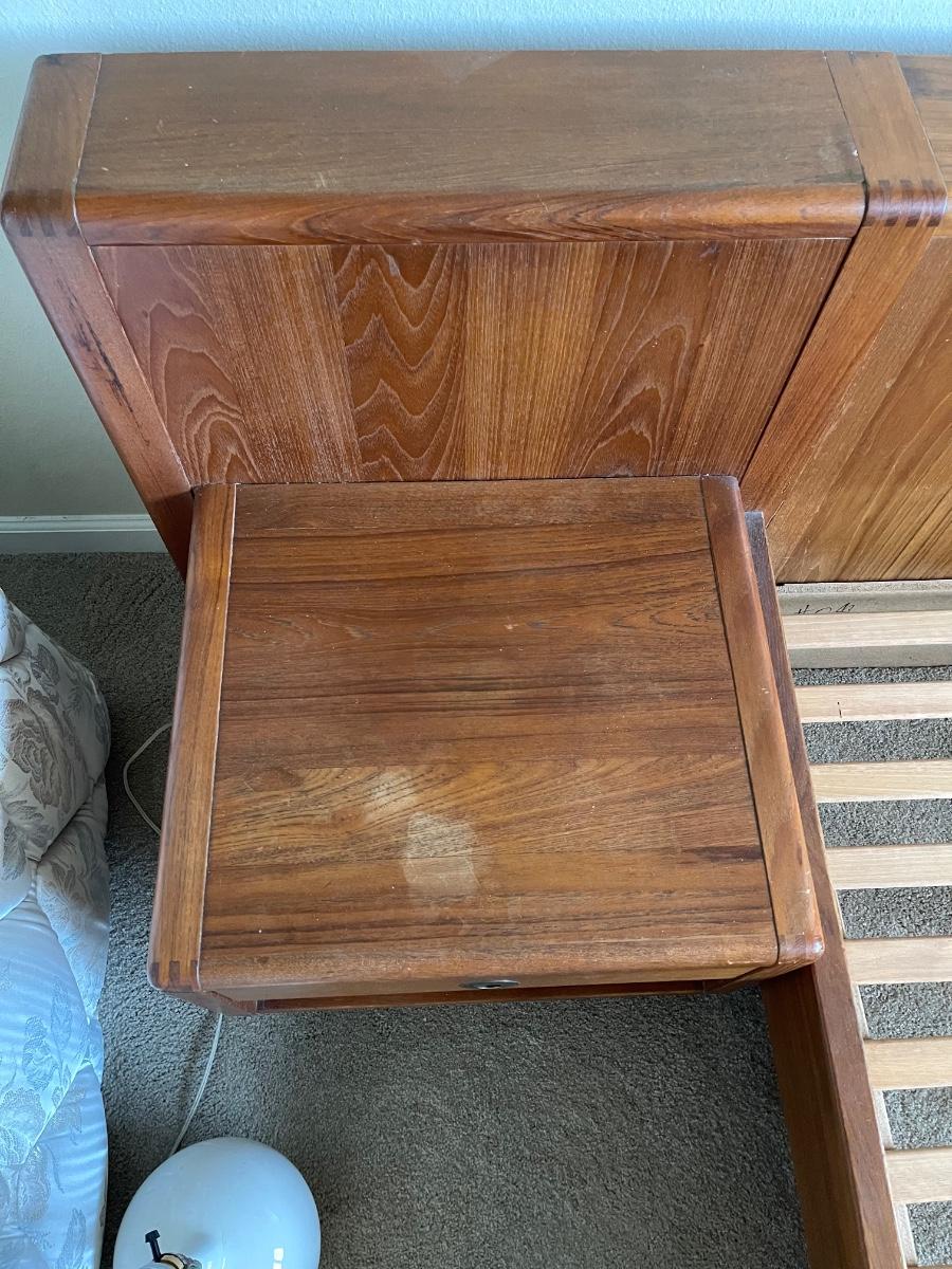 Danish Modern style platform / floating bed with integral nightstands and headboard. Simple, solid construction. It is in very good condition, except for a water stain on top of one of the nightstands.