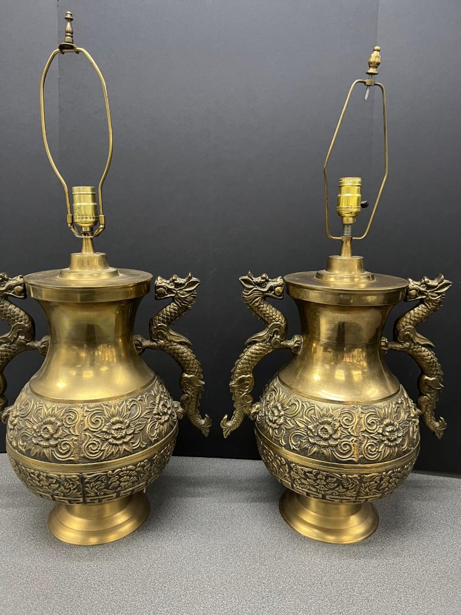 Beautiful Asian brass lamps with dragon handles and intricate repousse' design. 1960s
