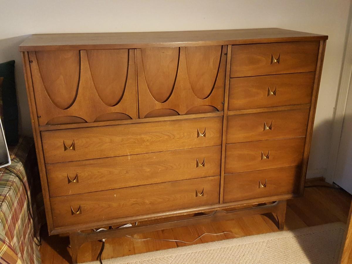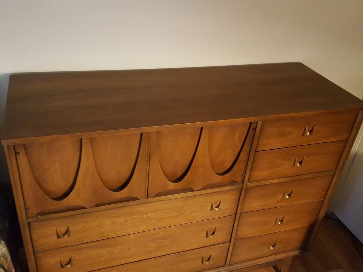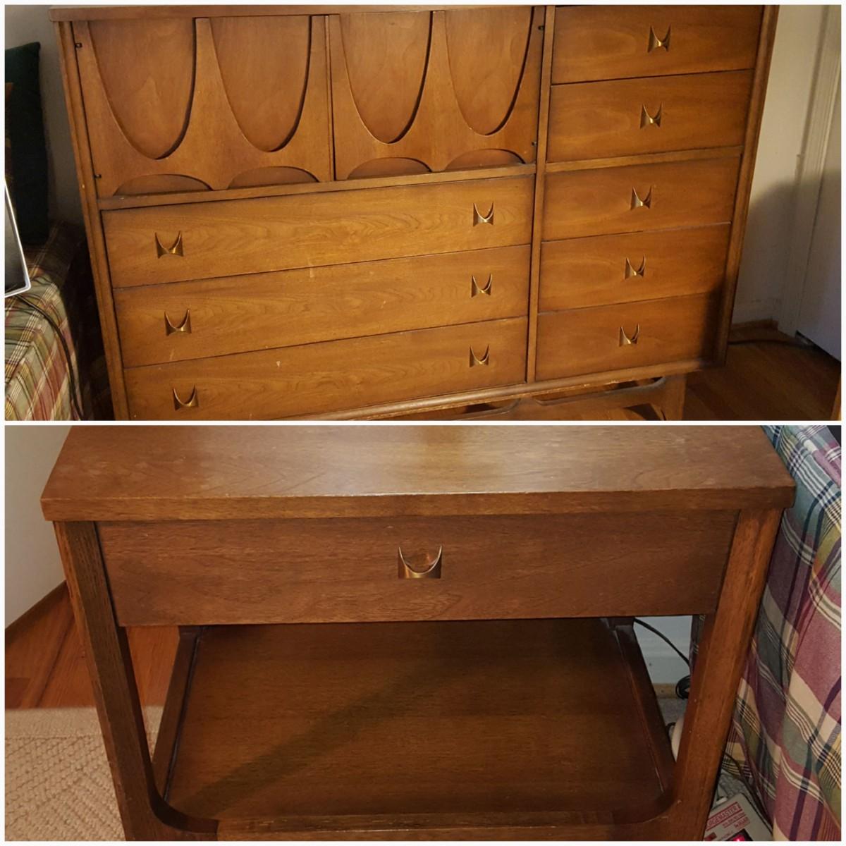 Mid Century Modern Broyhill Magna Walnut Highboy Bedroom Dresser & Night table
