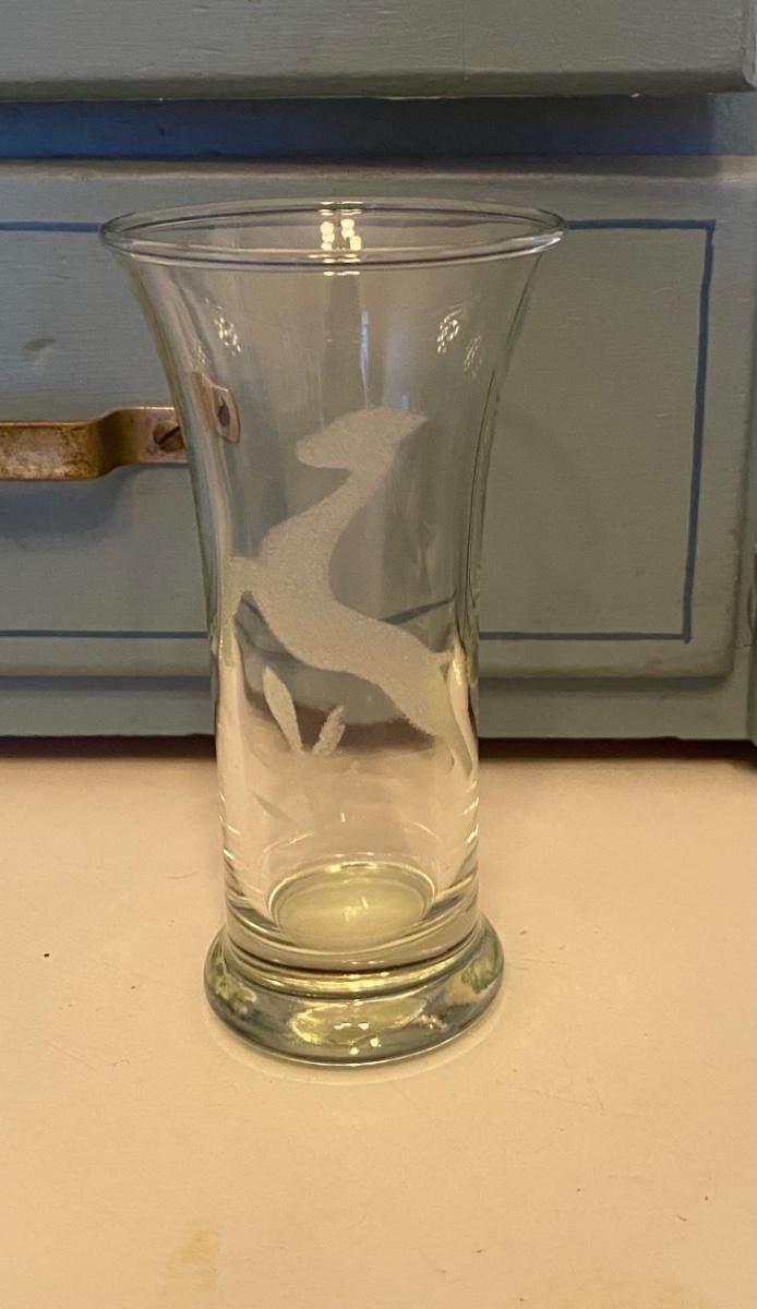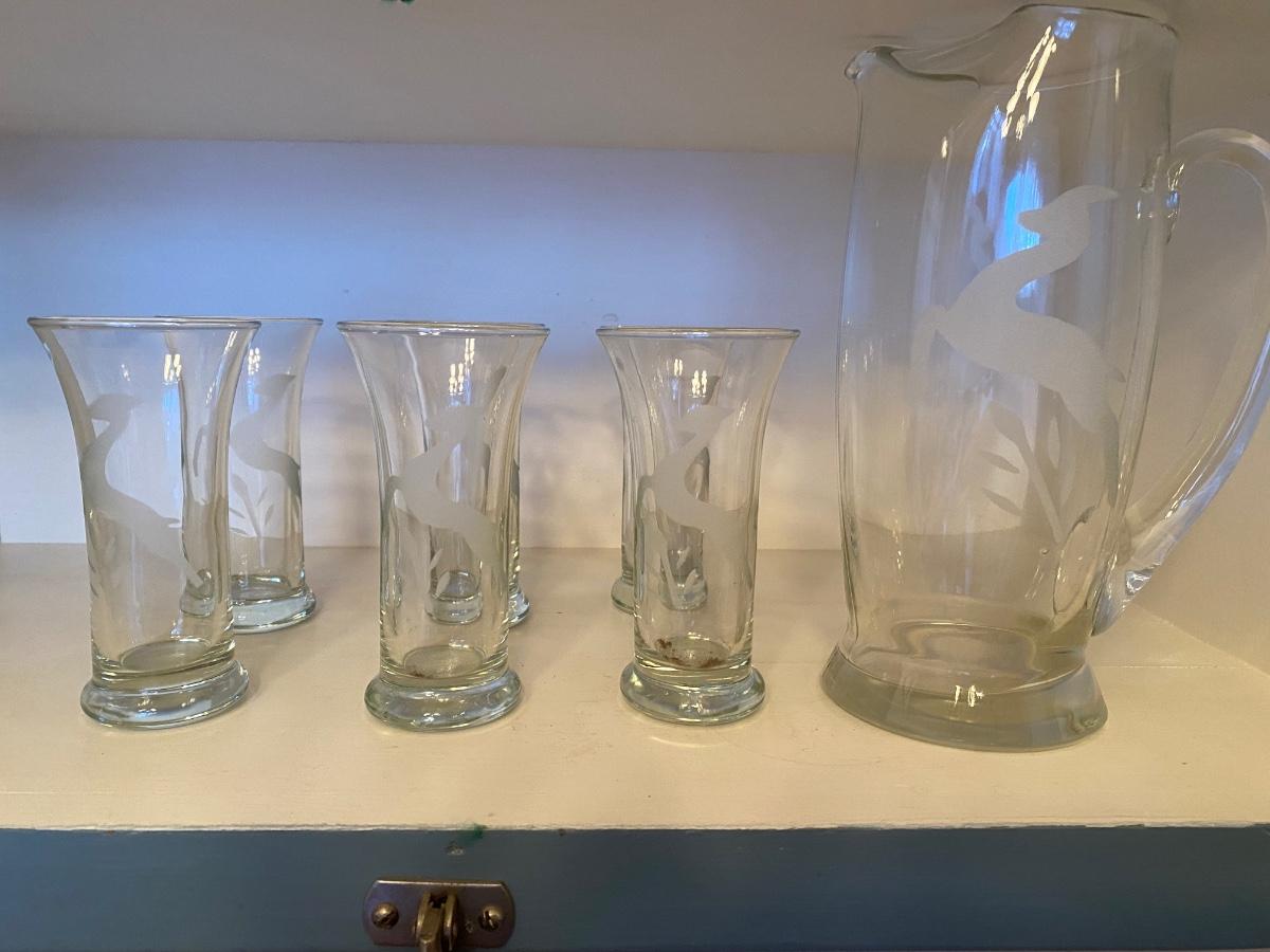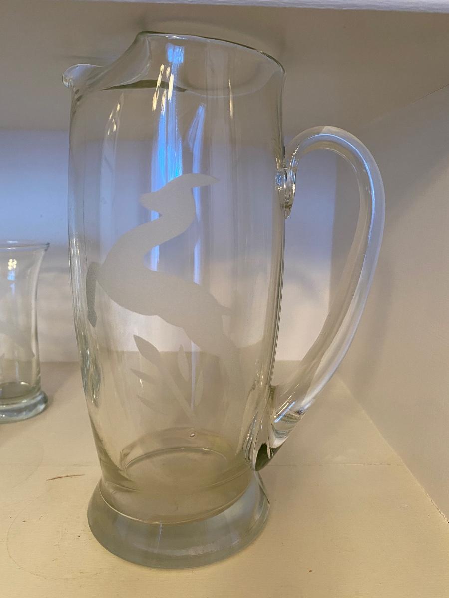 Mid Century Modern cocktail set. Pitcher and 6 glasses, with delicate 'prancing fawn' etched image. Dimensions: pitcher, 5"Dia x 8"H; 6 glasses, 2.5"Dia x 4.8"H. Excellent.