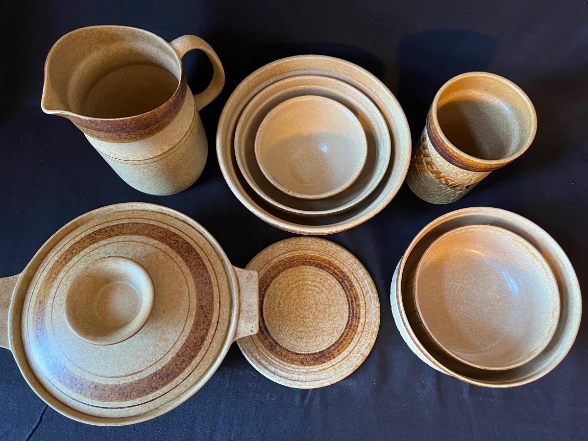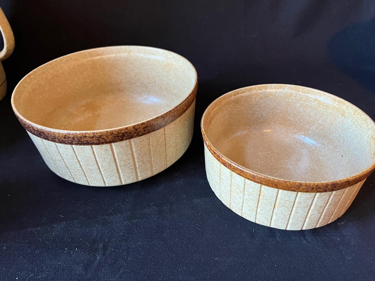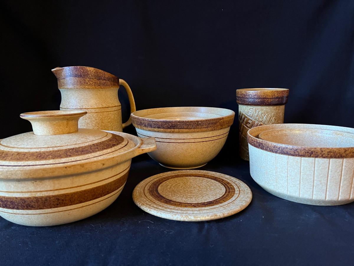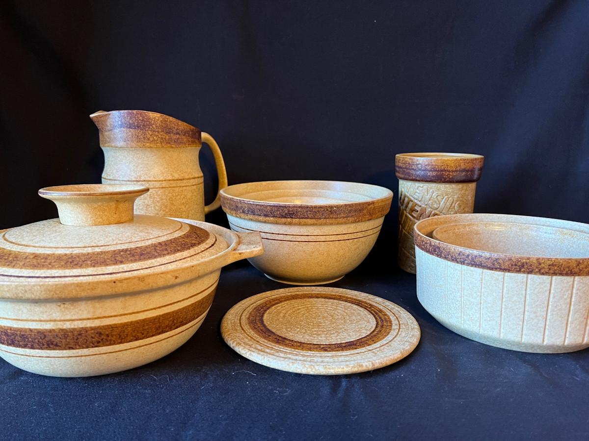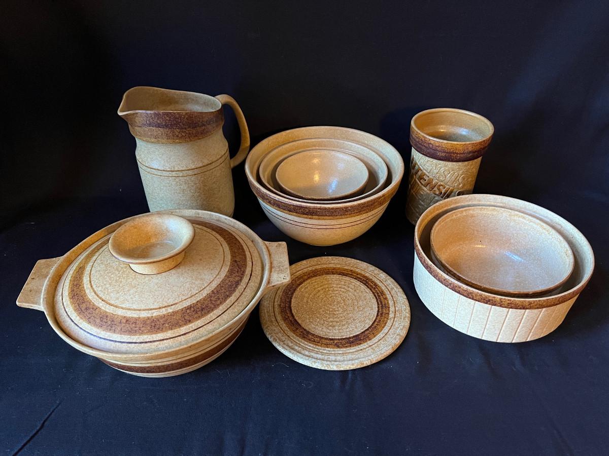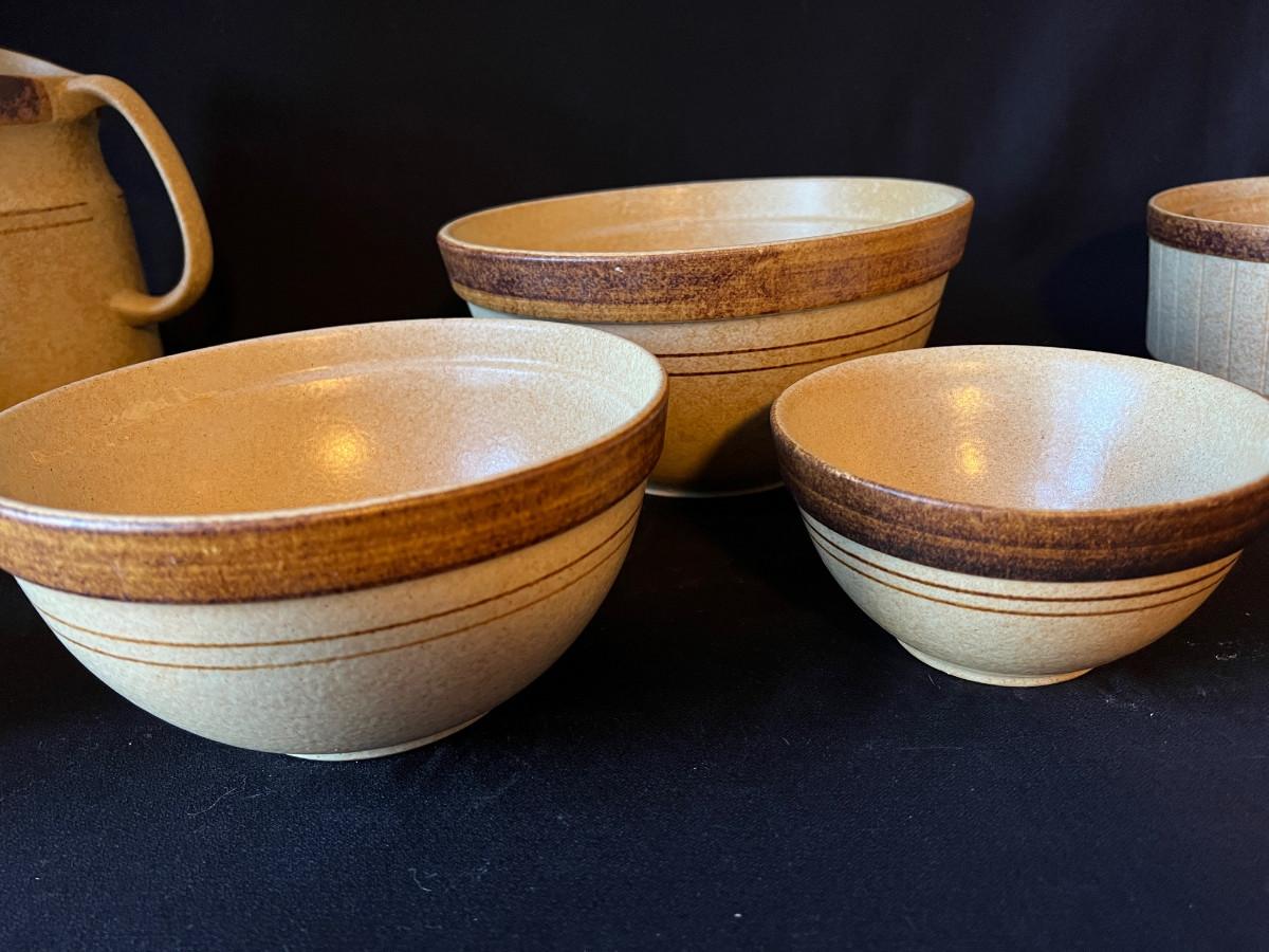Mid Century Modern pottery kitchen set. 10 pcs. Pretty darn cool ! Made by Pottery Craft in USA, Treasure Craft. Pieces include covered casserole, pitcher, 3-piece mixing bowl set, 2-piece serving bowls, utensils crock and a trivet. Sizes indicated in photos.