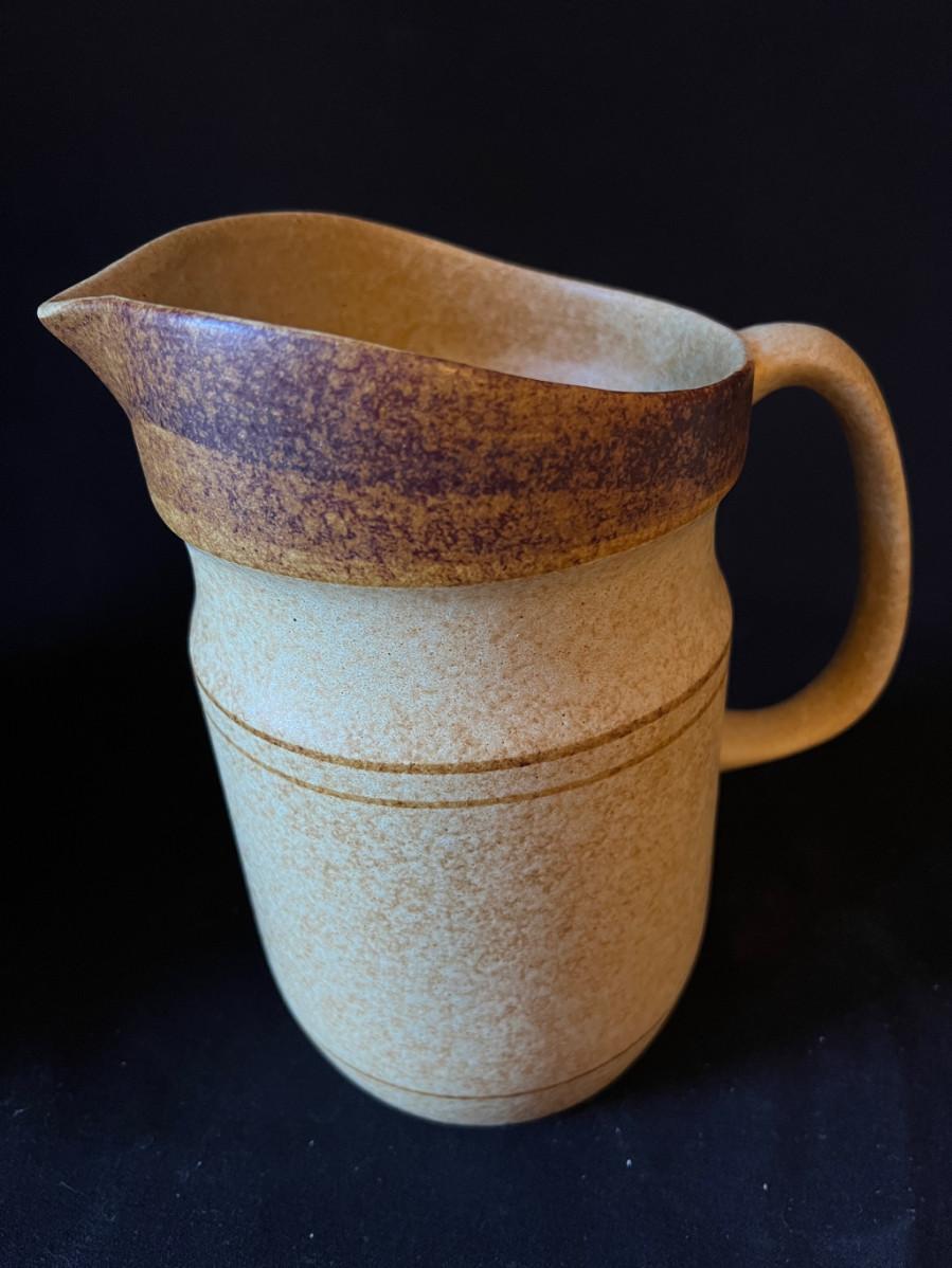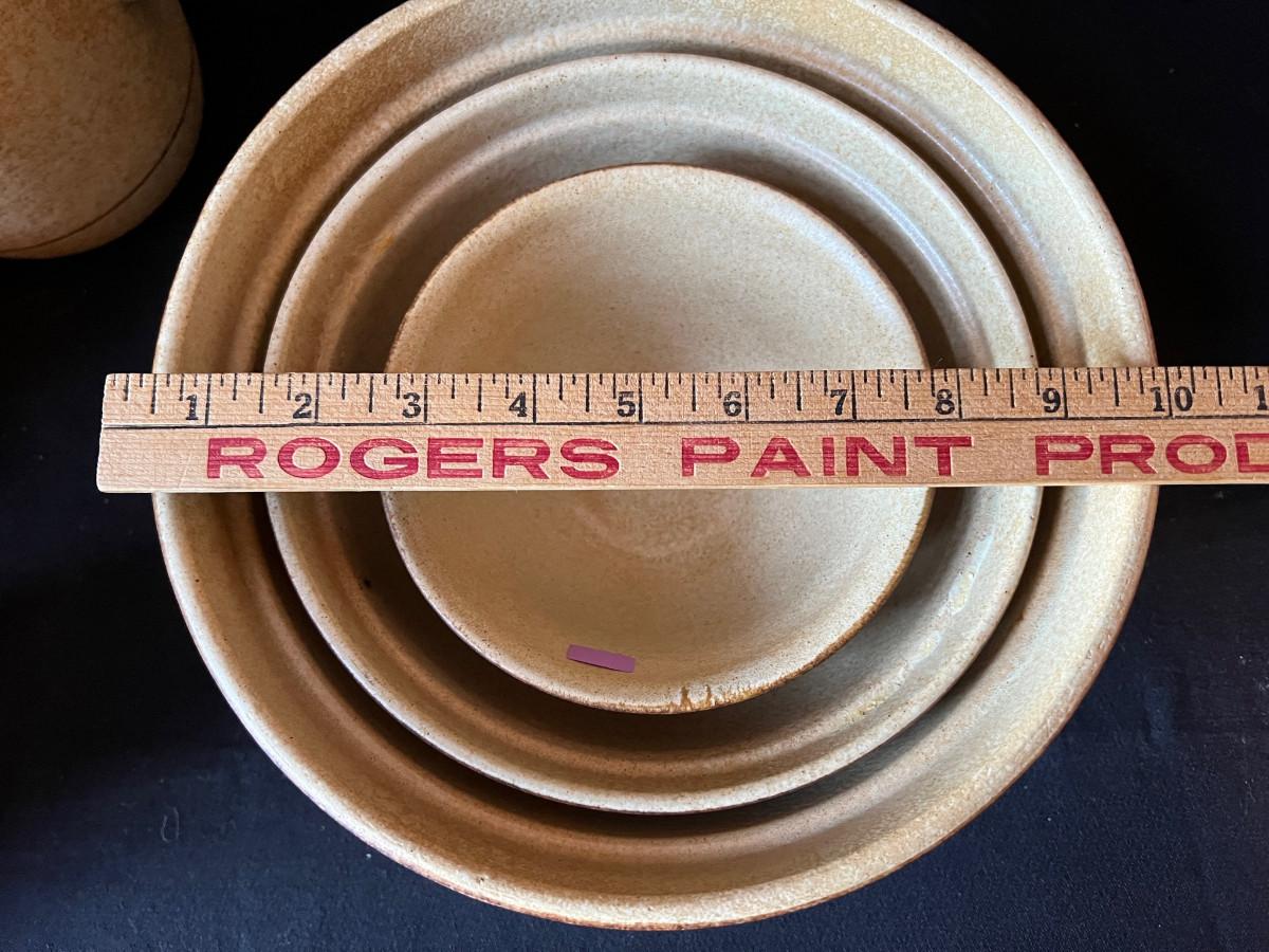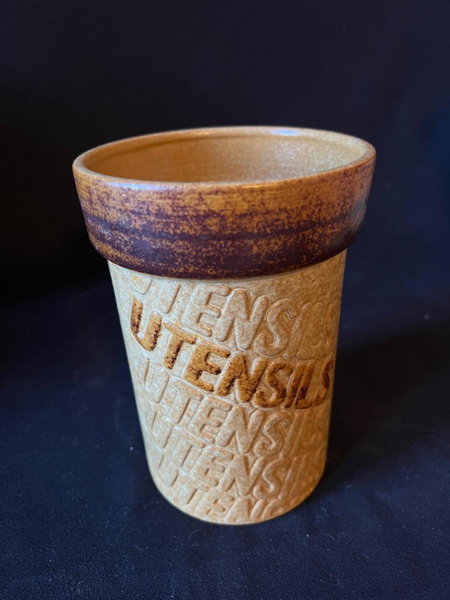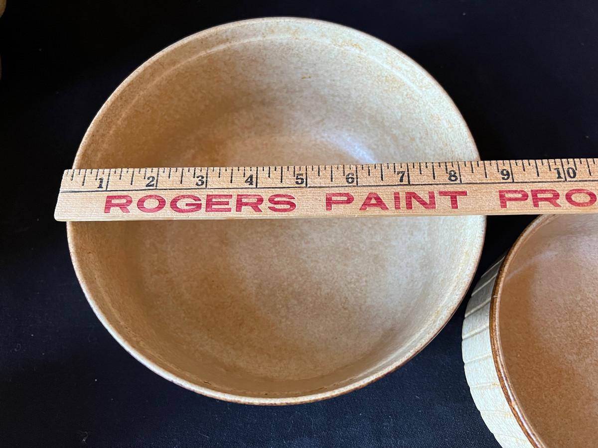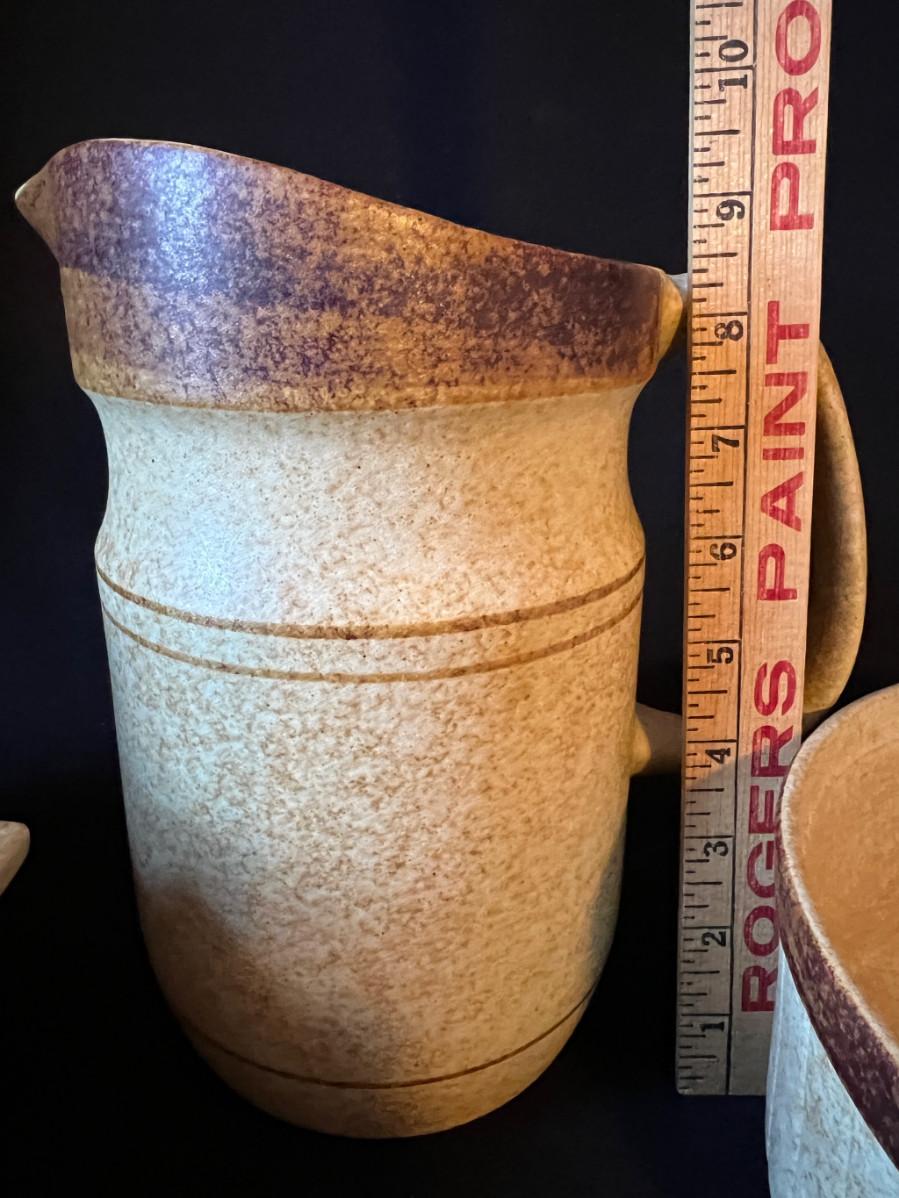 Mid Century Modern pottery kitchen set. 10 pcs. Pretty darn cool ! Made by Pottery Craft in USA, Treasure Craft. Pieces include covered casserole, pitcher, 3-piece mixing bowl set, 2-piece serving bowls, utensils crock and a trivet. Sizes indicated in photos.