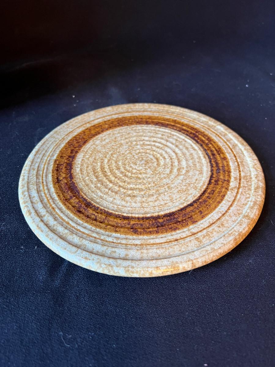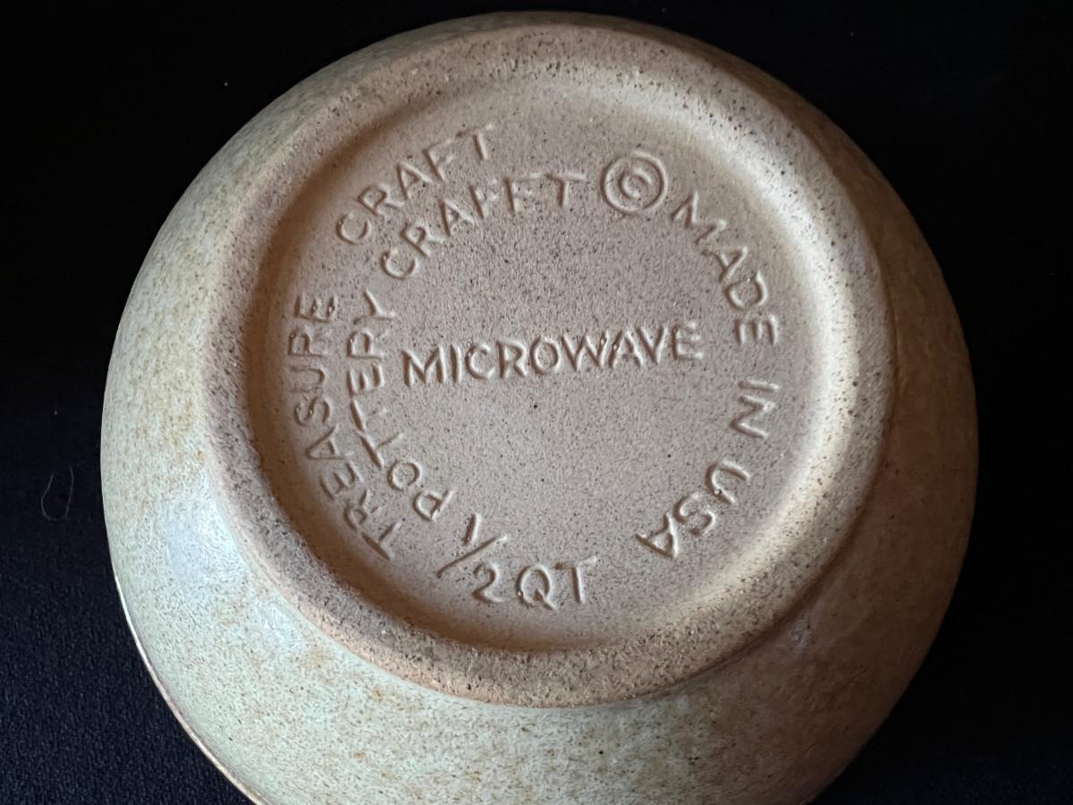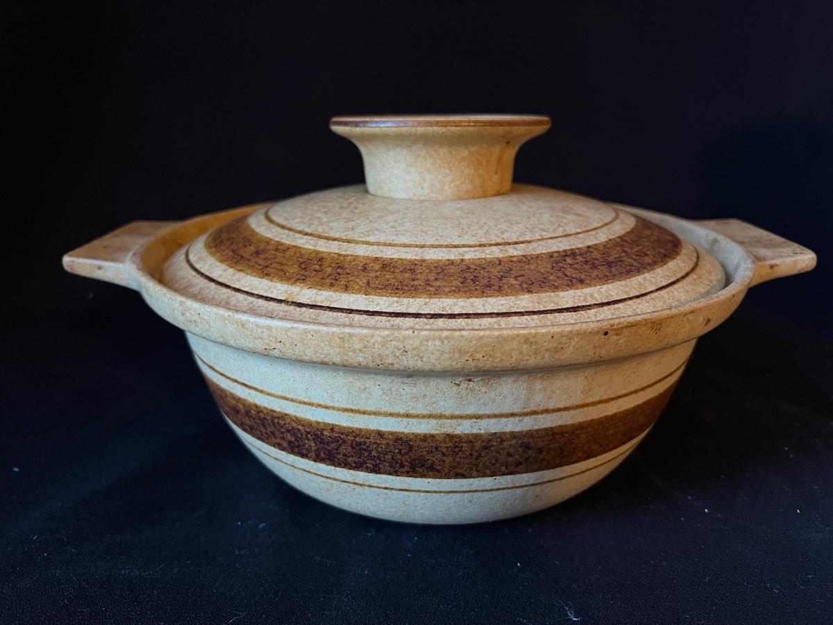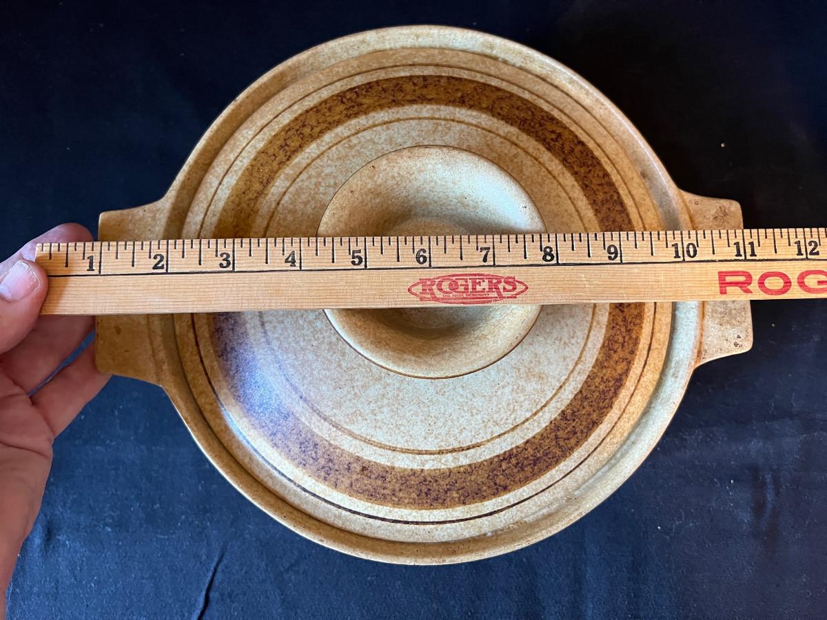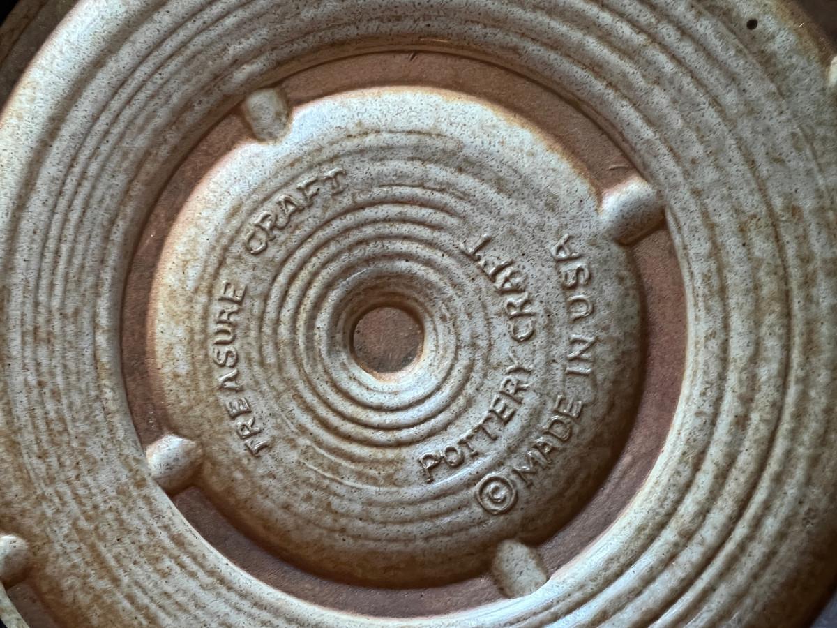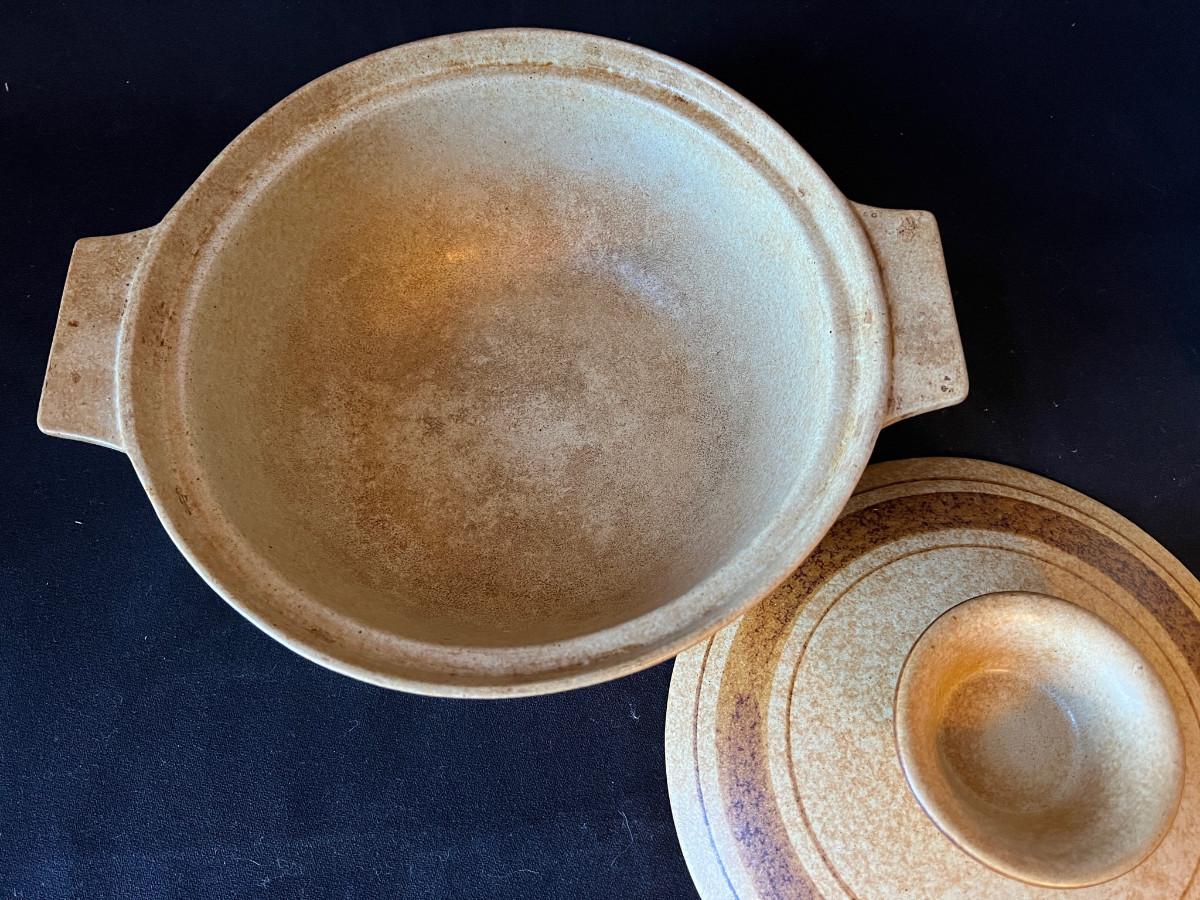 Mid Century Modern pottery kitchen set. 10 pcs. Pretty darn cool ! Made by Pottery Craft in USA, Treasure Craft. Pieces include covered casserole, pitcher, 3-piece mixing bowl set, 2-piece serving bowls, utensils crock and a trivet. Sizes indicated in photos.