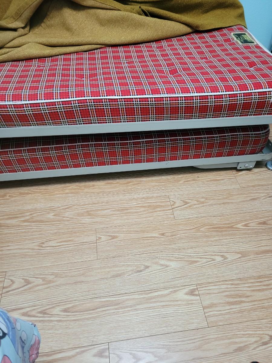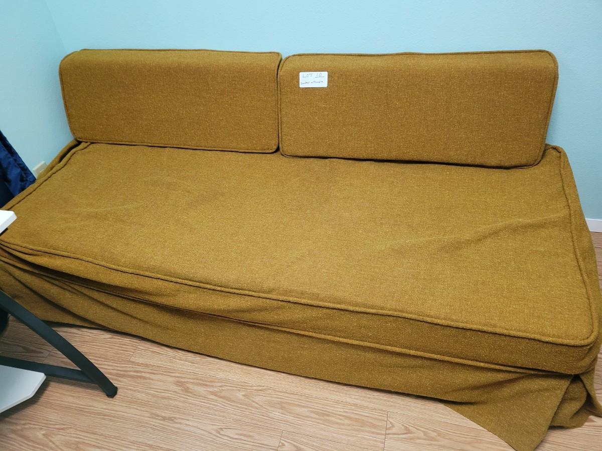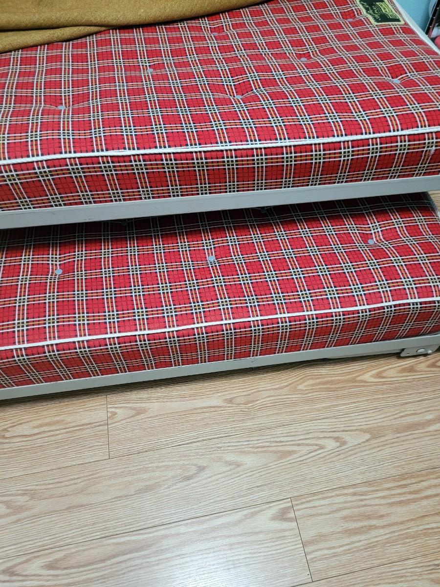 Metal frame day bed with roll out trundle that lifts up. Has a cover and backing pillows for sitting. Mattresses look original but are clean and in good shape. comes with sheets and pads. Frame is 79x35x16 It is heavy bring help to load it.