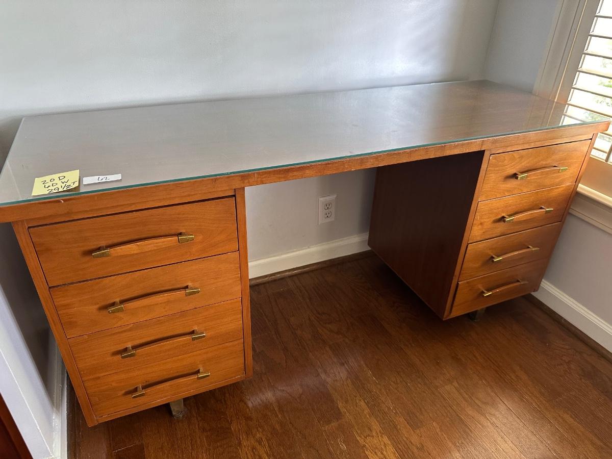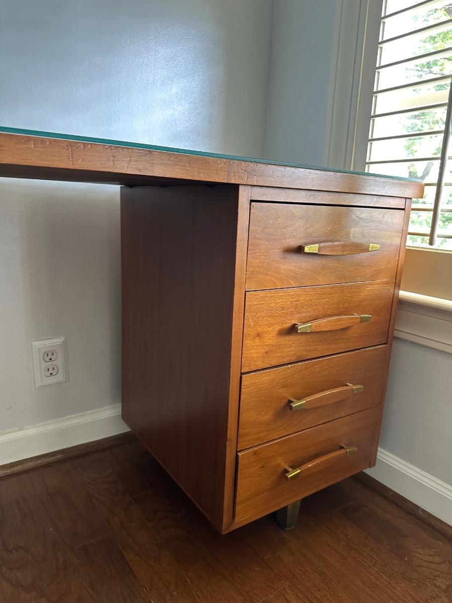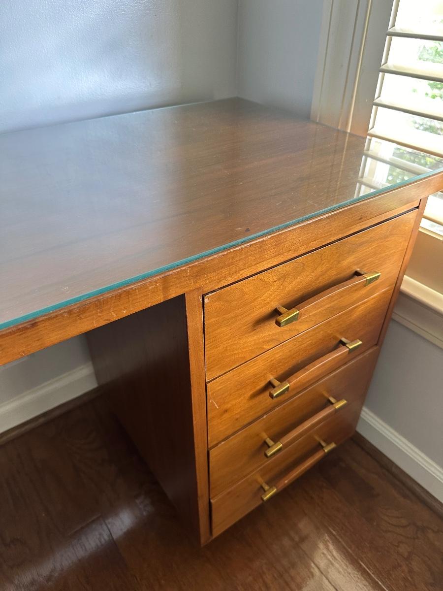 MID CENTURY MODERN DESK 60" WIDE 29 1/2 TALL 20" DEEP HAS GLASS FOR TOP, SOME SCRATCHES AND DENTS ON TOP