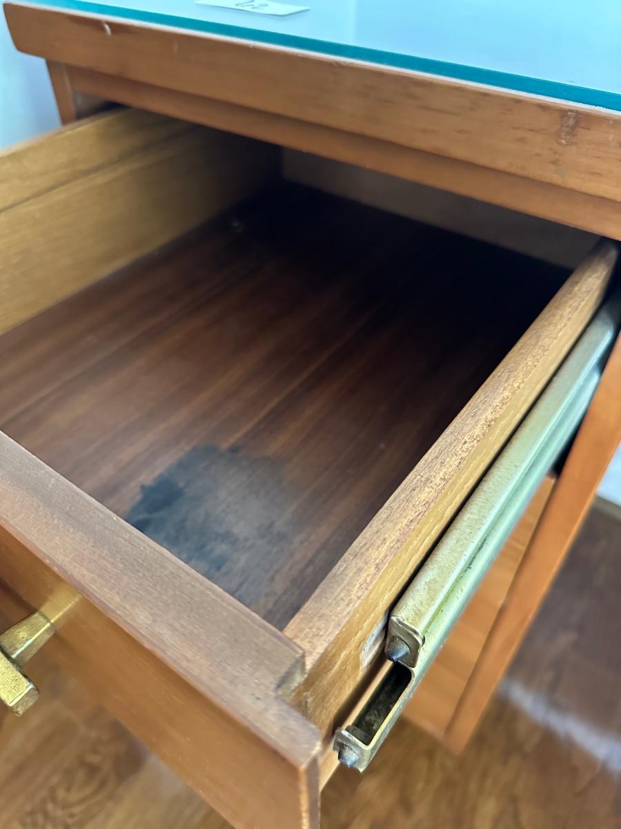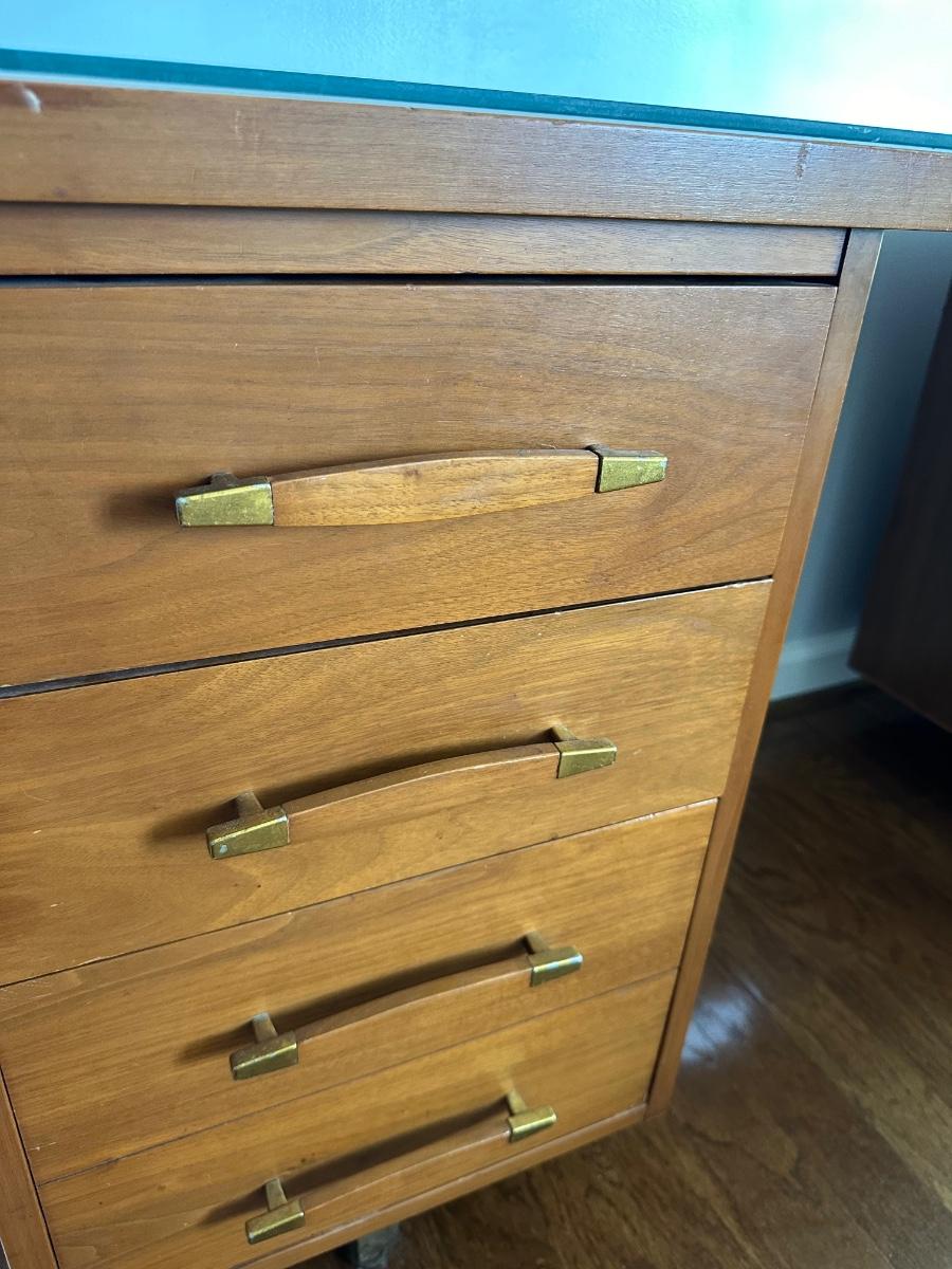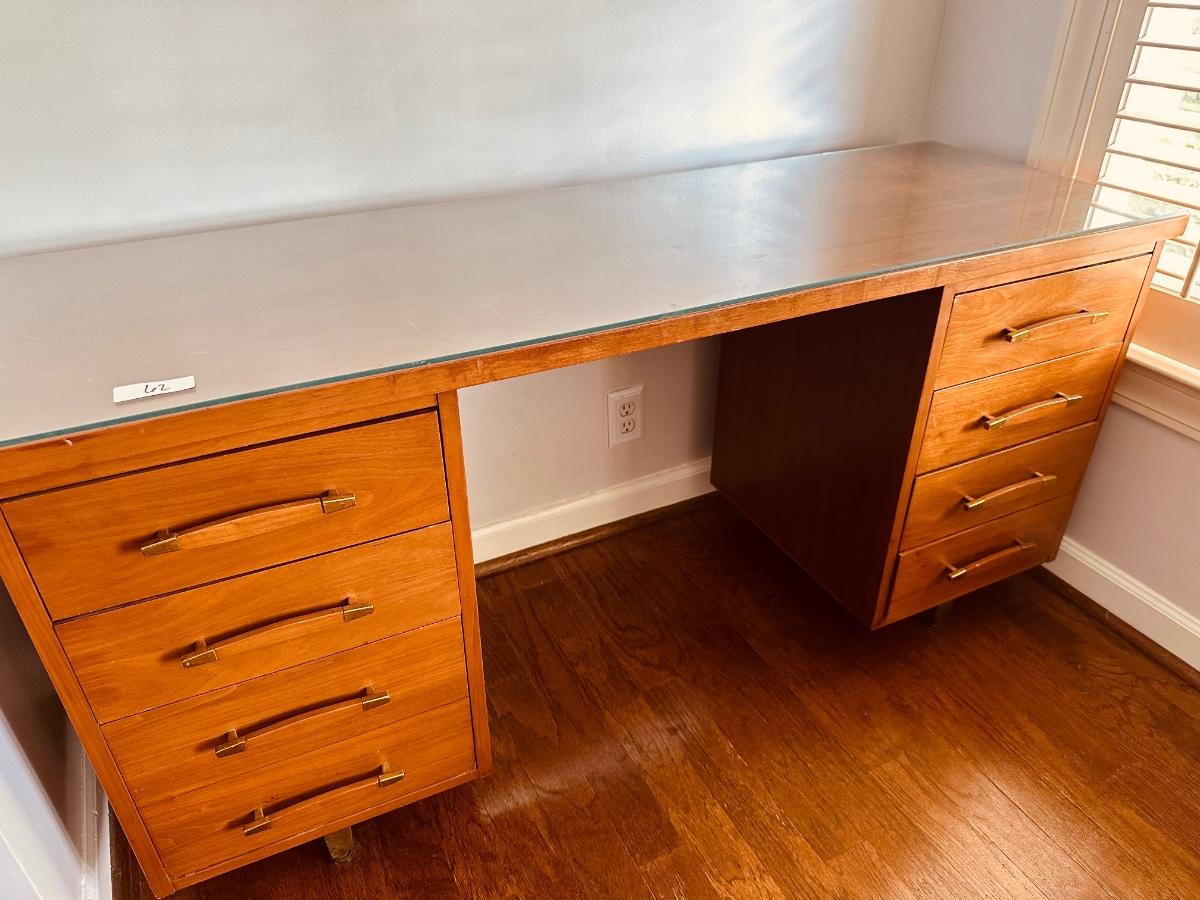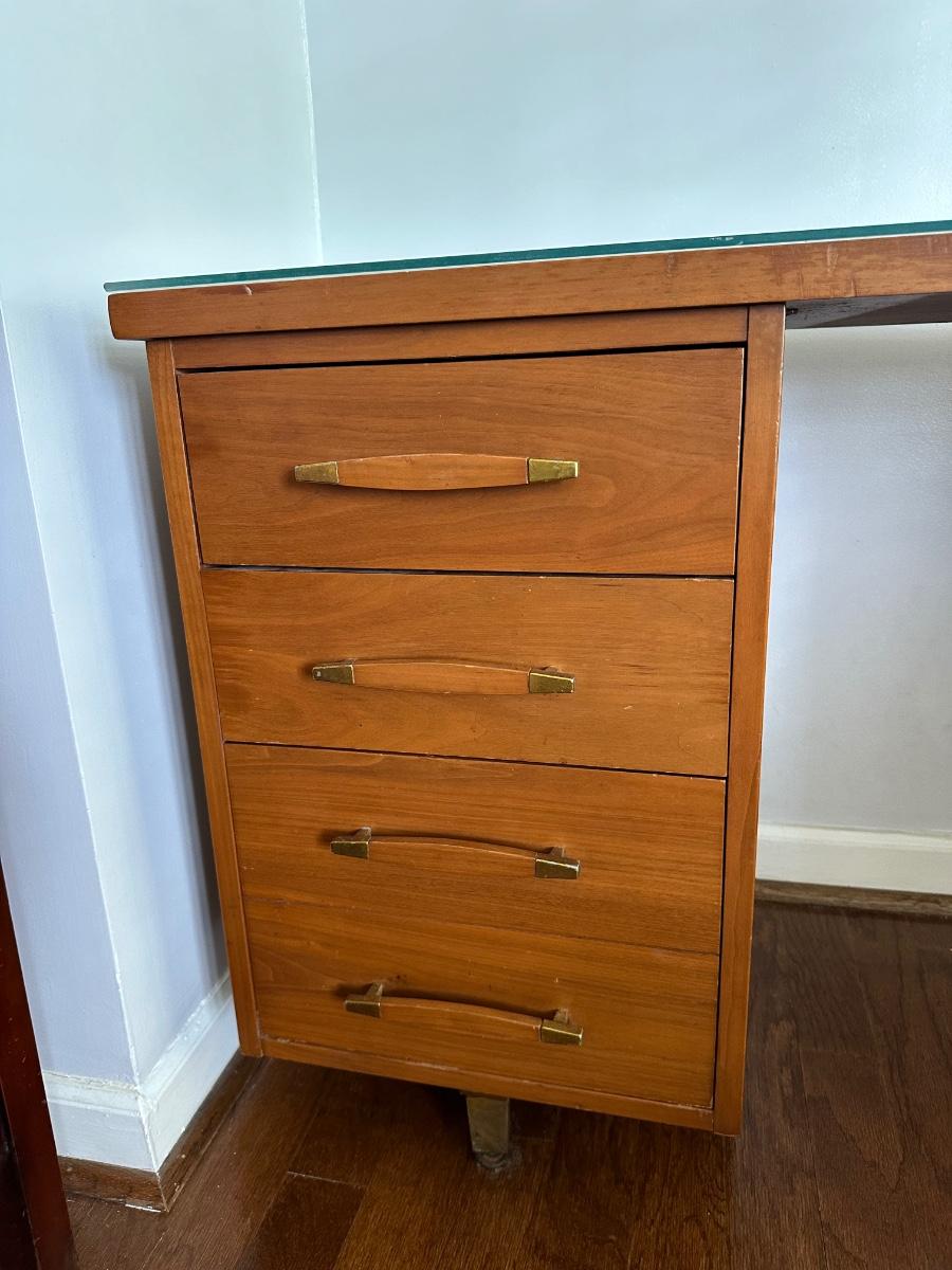 MID CENTURY MODERN DESK 60" WIDE 29 1/2 TALL 20" DEEP HAS GLASS FOR TOP, SOME SCRATCHES AND DENTS ON TOP
