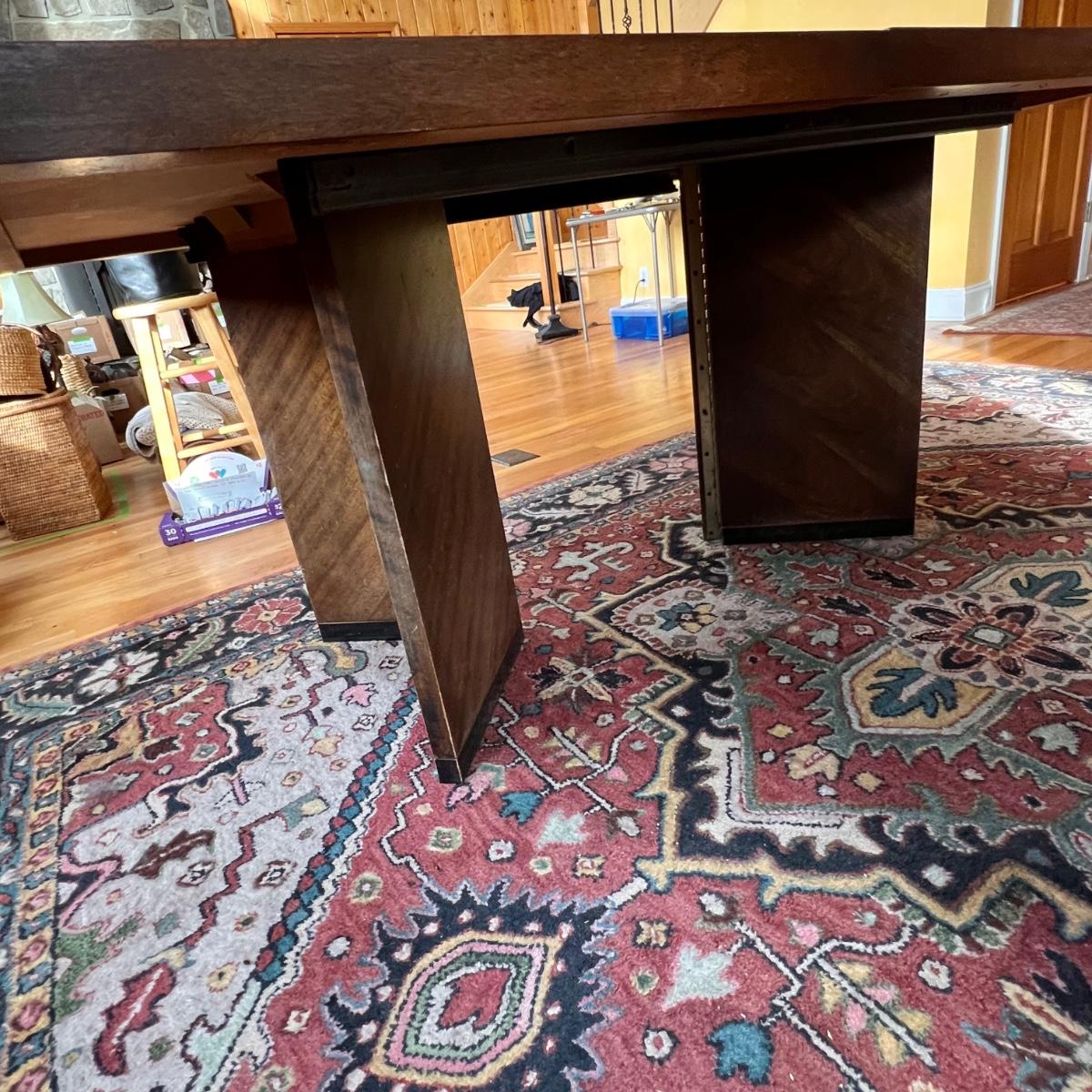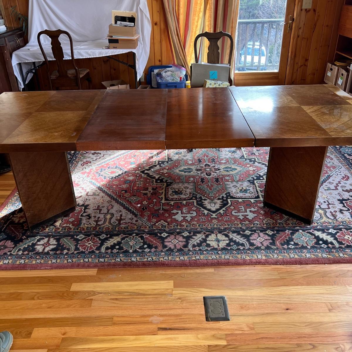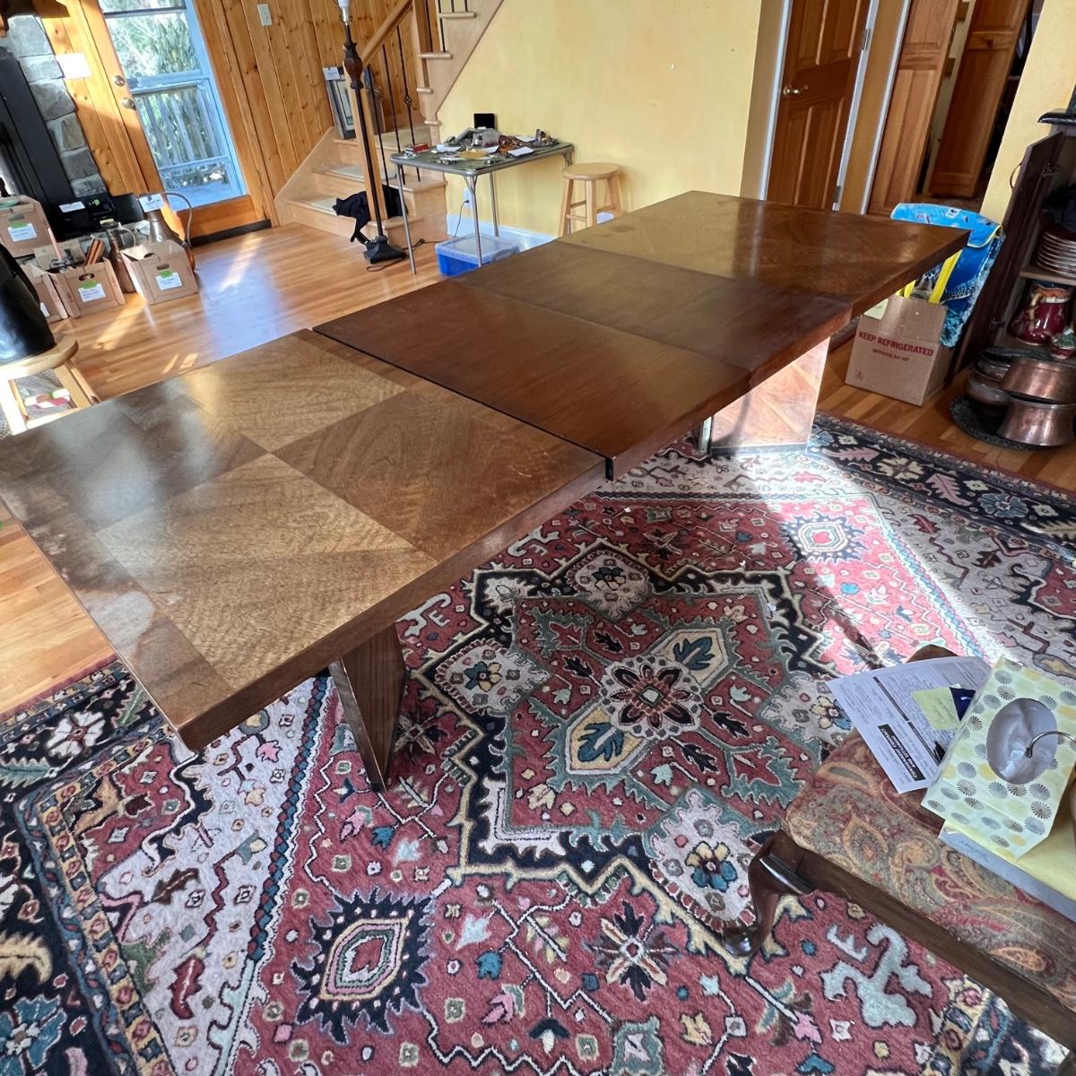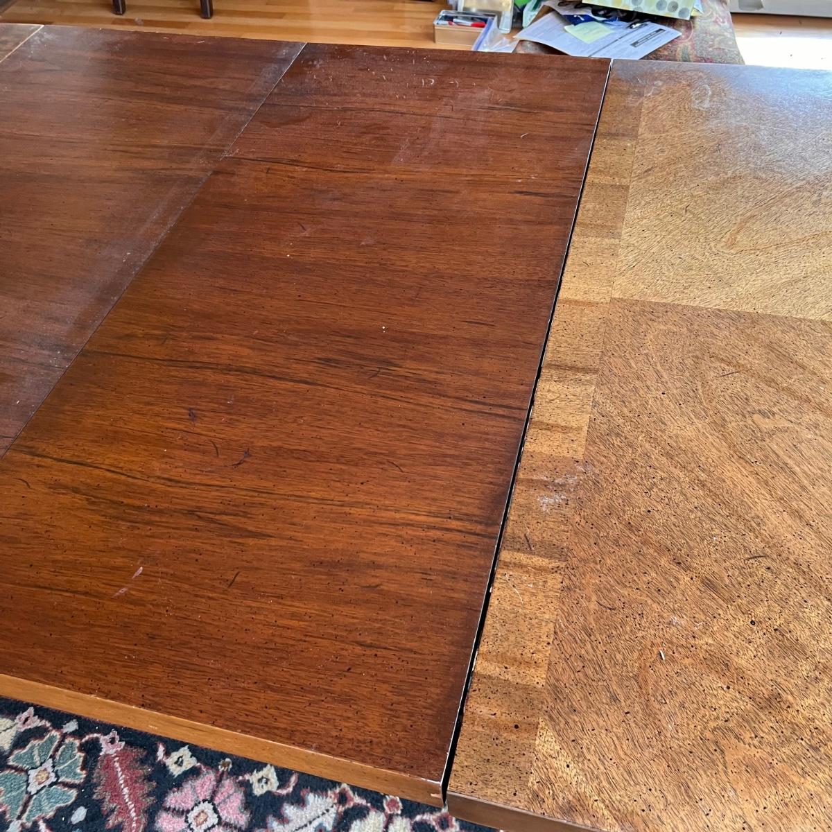This gorgeous MCM table comes with two leaves which add 18” (per leaf) in length. Possibly walnut, it is solid wood, and the leaves slide in/out smoothly. Note that the leaves are a darker color, it’s possible the table has had some sun bleaching and does have very light areas that need some touch up. No mfg label found.