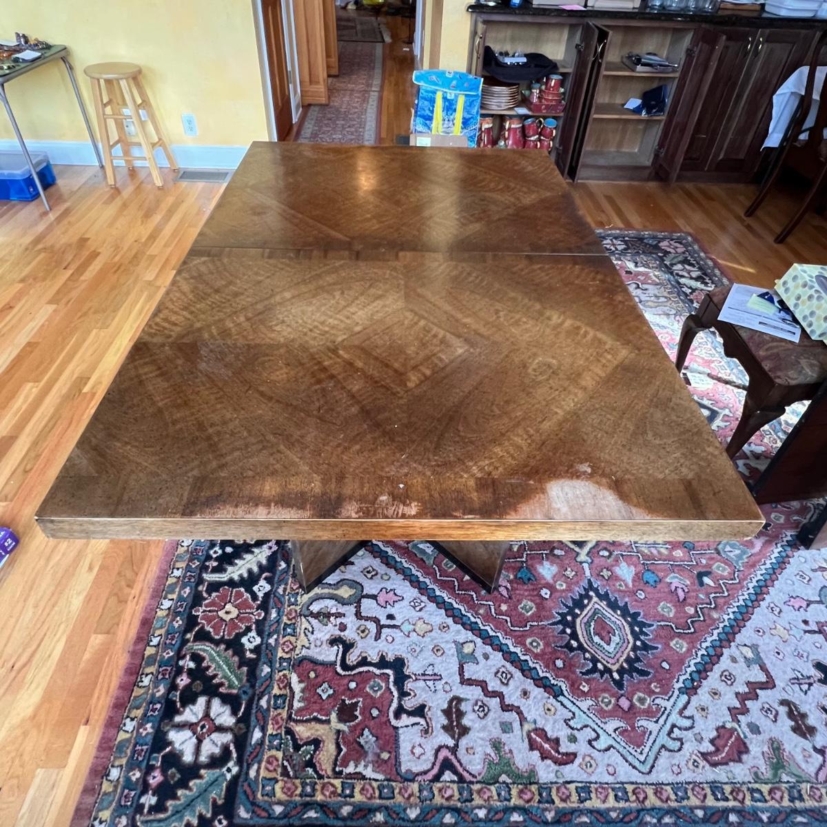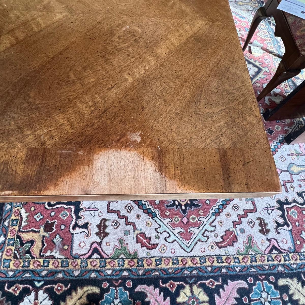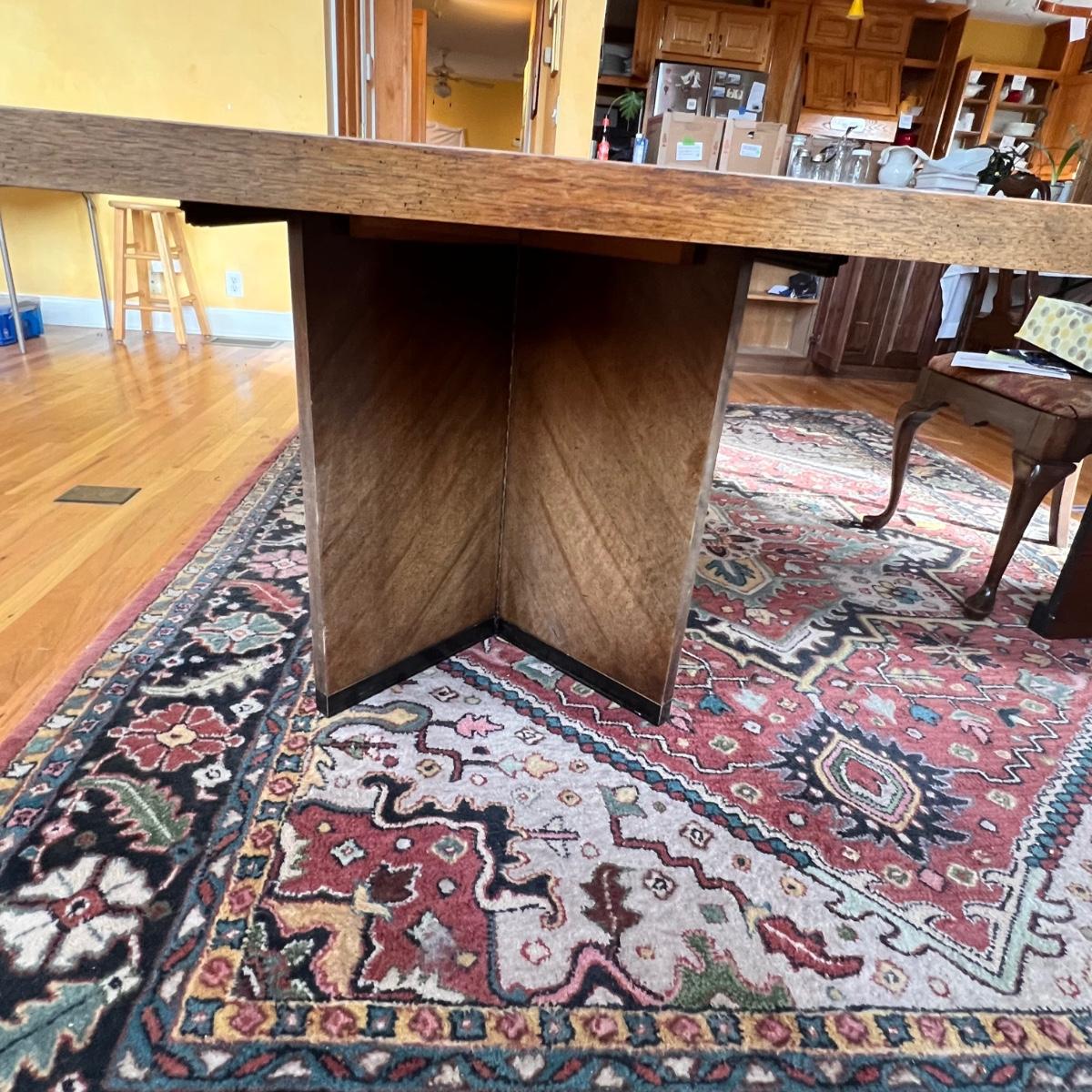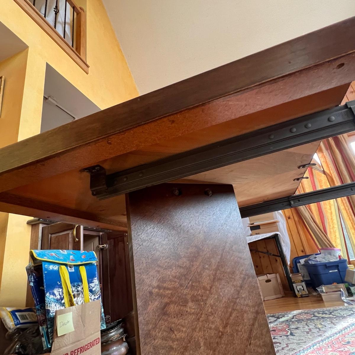 This gorgeous MCM table comes with two leaves which add 18” (per leaf) in length. Possibly walnut, it is solid wood, and the leaves slide in/out smoothly. Note that the leaves are a darker color, it’s possible the table has had some sun bleaching and does have very light areas that need some touch up. No mfg label found.