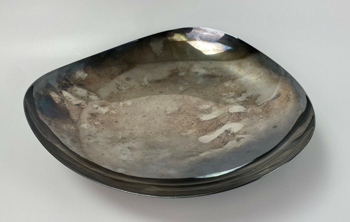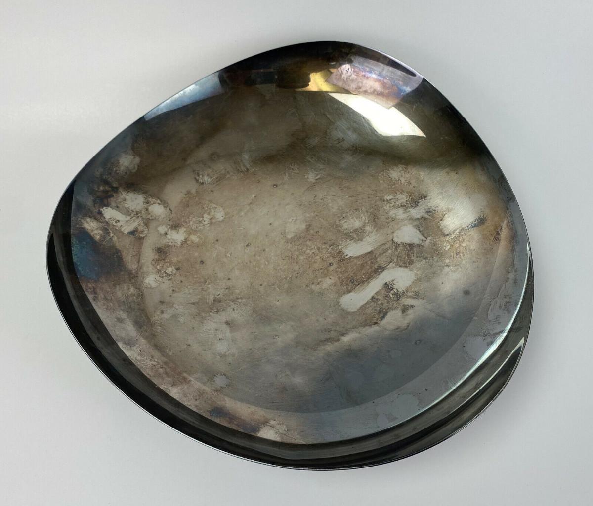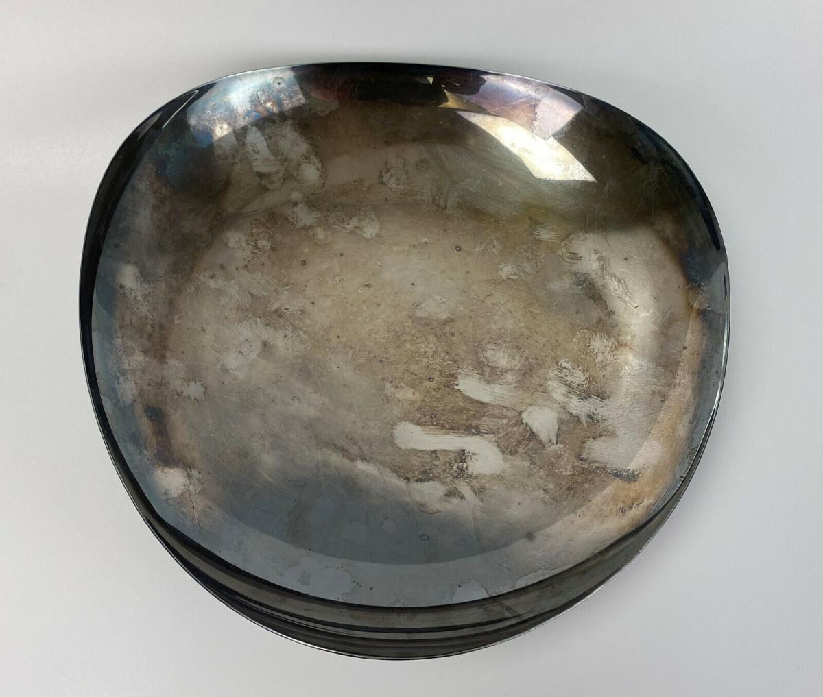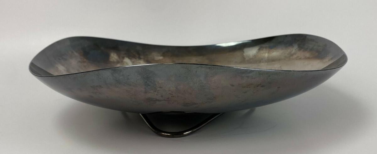 Here is a Modernist silverplate 12" centerpiece bowl from the Mid Century...produced by Fisher Silversmiths once of Providence, Rhode Island...Model K86...Very light surface scratches...I have left the patina as is.