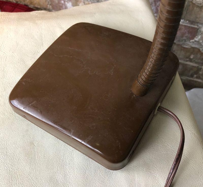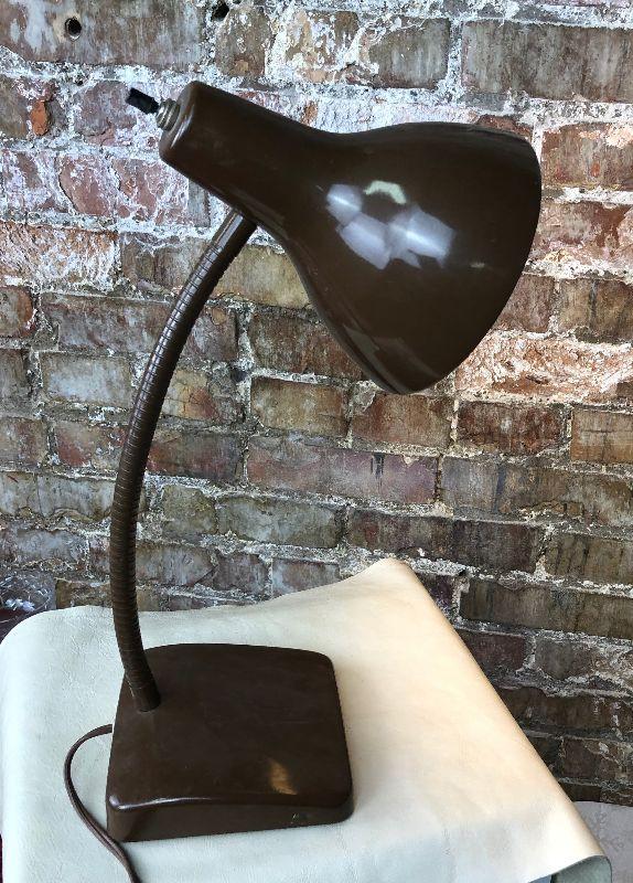 Cone shade on this retro Desk Lamp...Gooseneck..Adjustable...Incandescent...Baked brown enamel finish...Works...