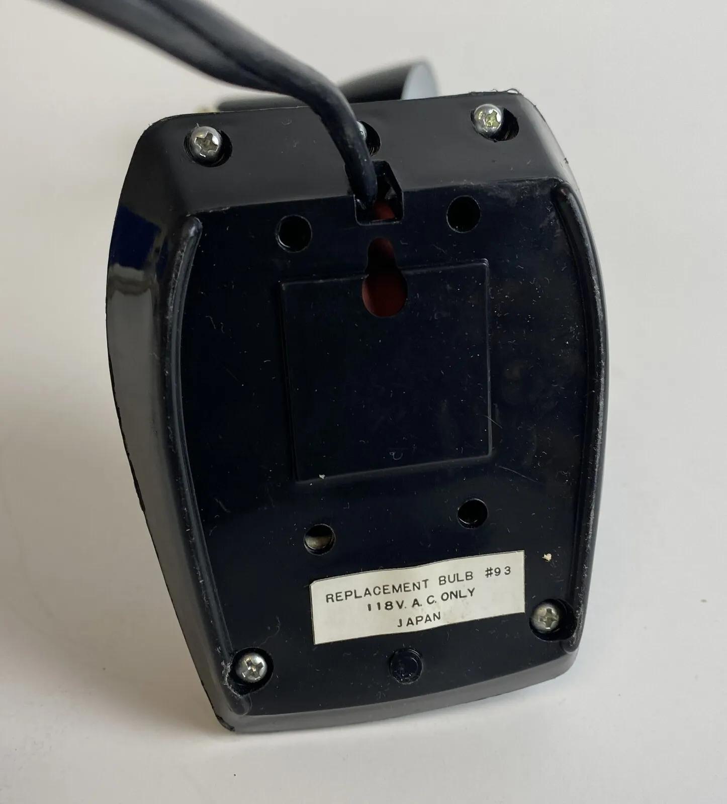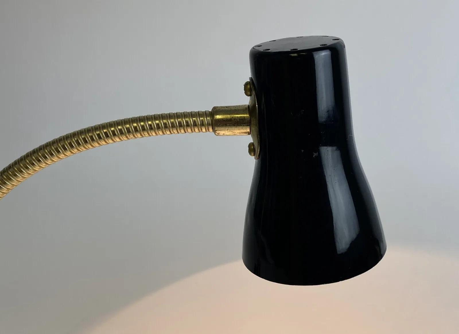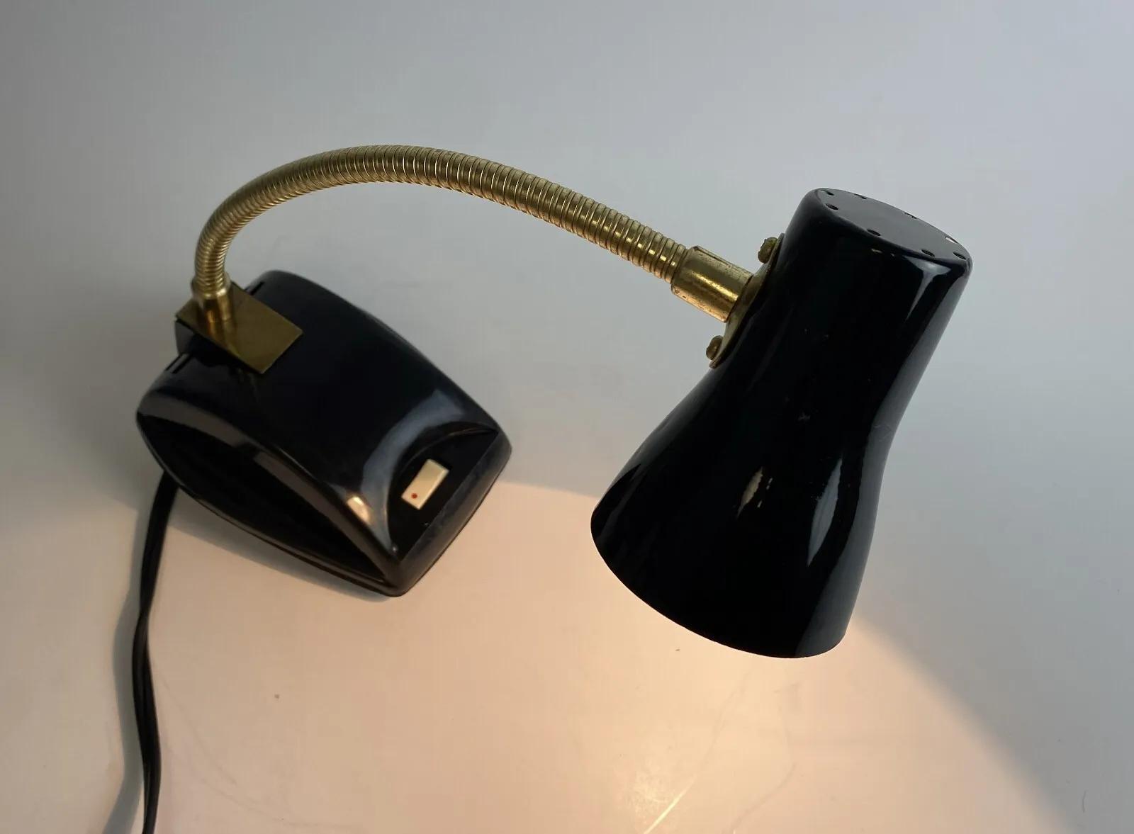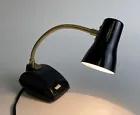 Here is a small gooseneck desk or wall mounted lamp from the Mid Century...Approx 11 1/2" high...Brass neck..Gloss black metal cone shade is 3 1/8 x 2 1/8"...Plastic base 3.75 x 3"...Working well...No bulb included...as shown.
