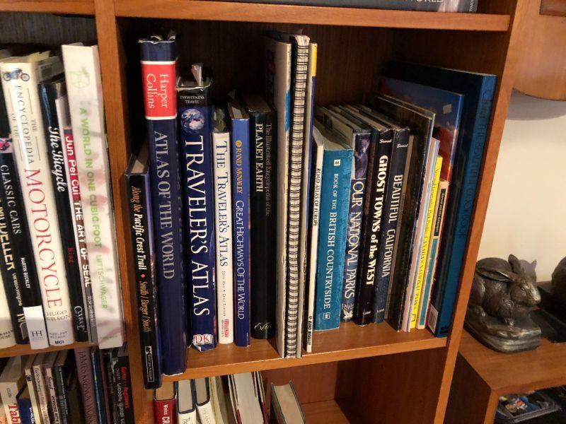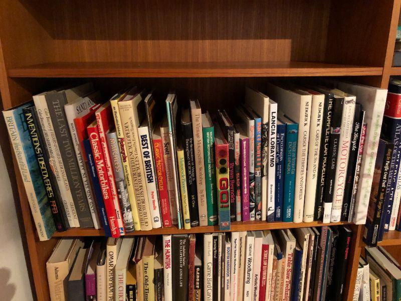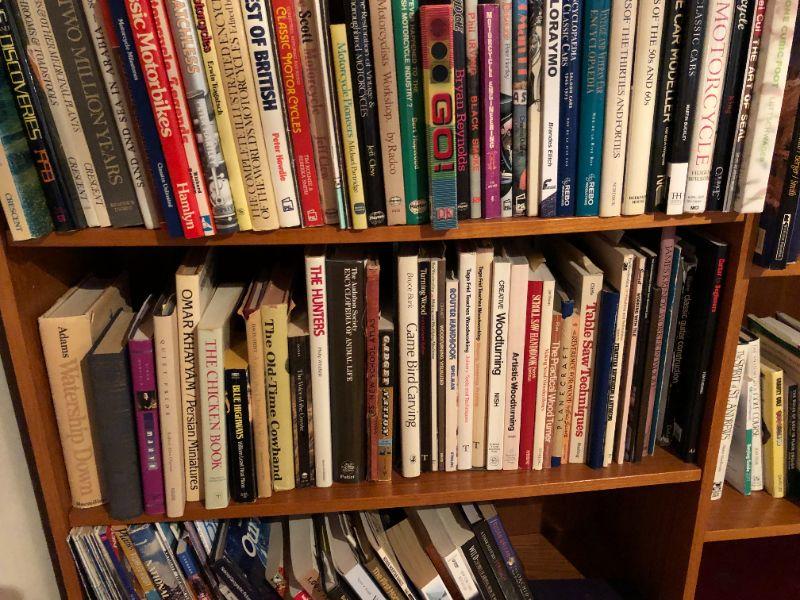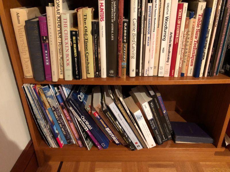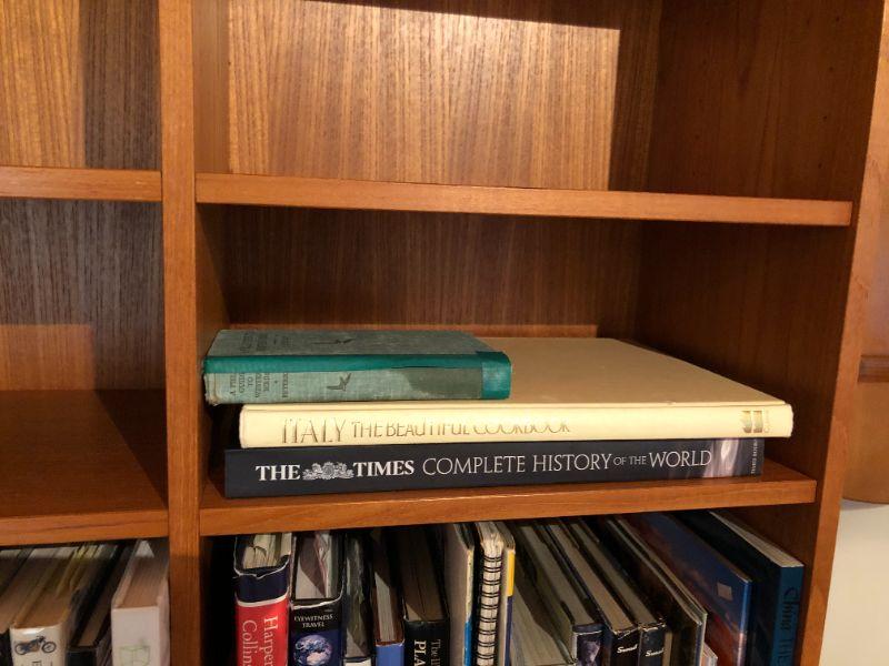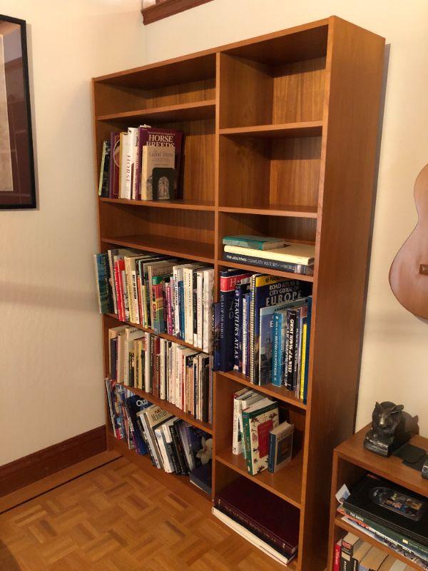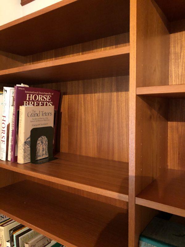 Absolutely beautiful mid century modern book shelf in excellent condition. The wood quality and beauty is top notch (likely hand made by the skilled estate owner, a gifted wood craftsman). The purchase of this shelf includes all the books contained within it (as many as you would like). Other shelves sold separately. Same dimensions as other large mid century book shelf.