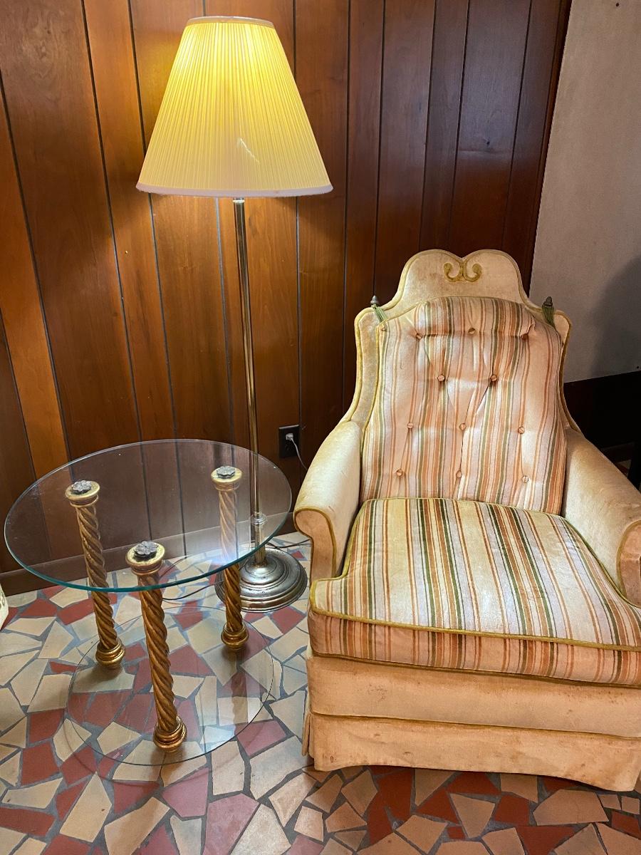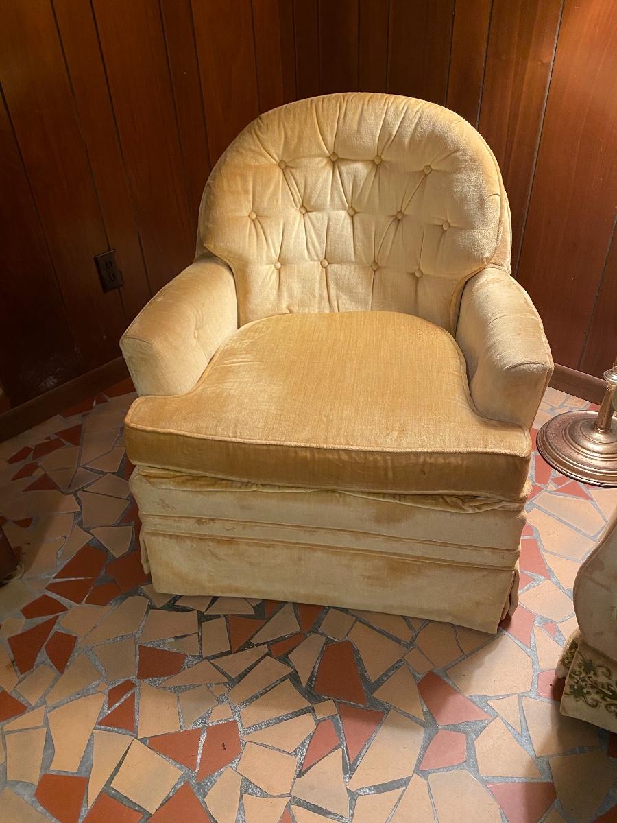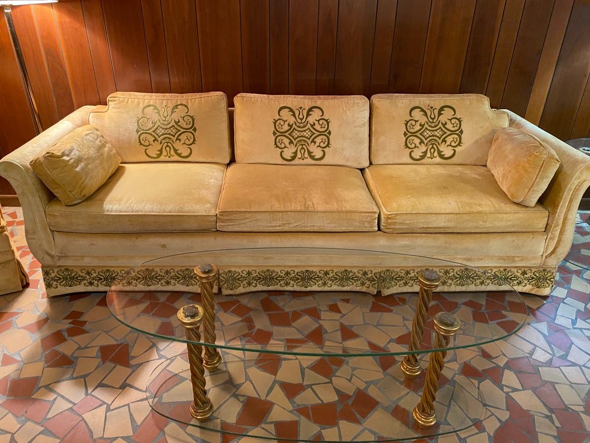 Mid century Mediterranean style sofa and two upholstered chairs. Includes gold velvet sofa with six reservable cushions & two bolster pillows; gold velvet rocking upholstered chair and high-back gold velvet upholstered chair. All in good condition with a few stains. Very comfortable and well made.