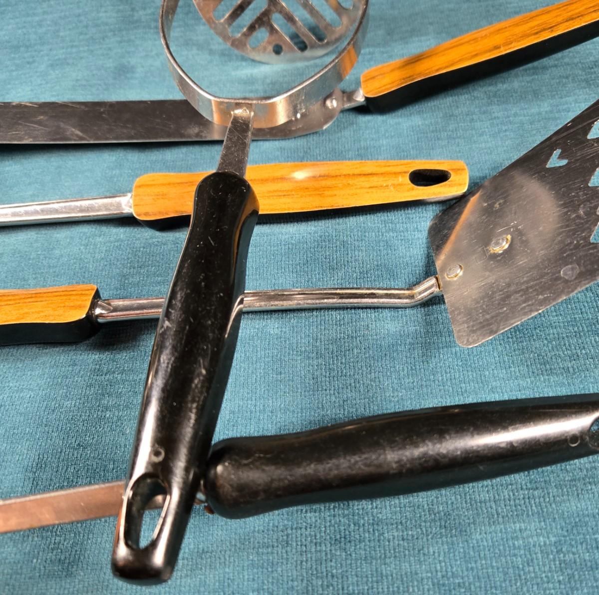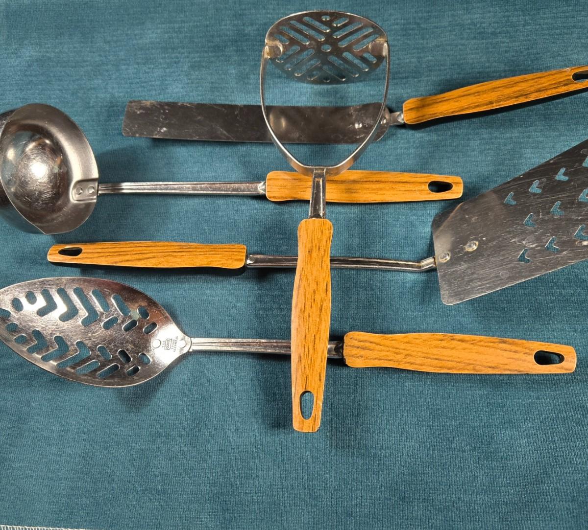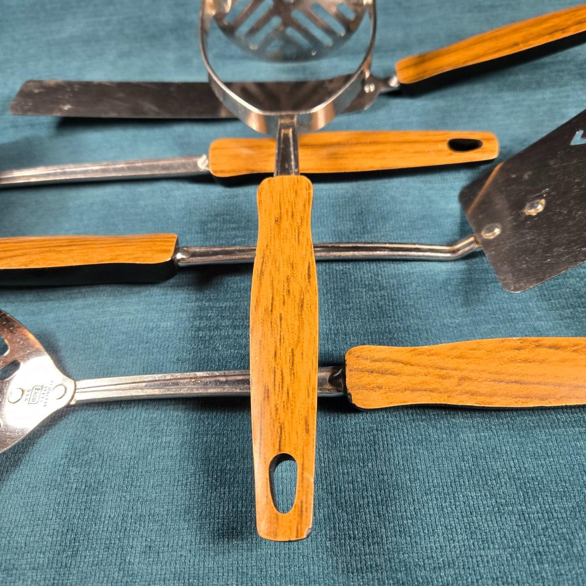 This is a set of 5 Mid Century Modern kitchen utensils. They are in very good condition for age and use. The handles are plastic - top is a faux woodgrain, backside is black. This is a nice addition for your Mid Century Kitchen.