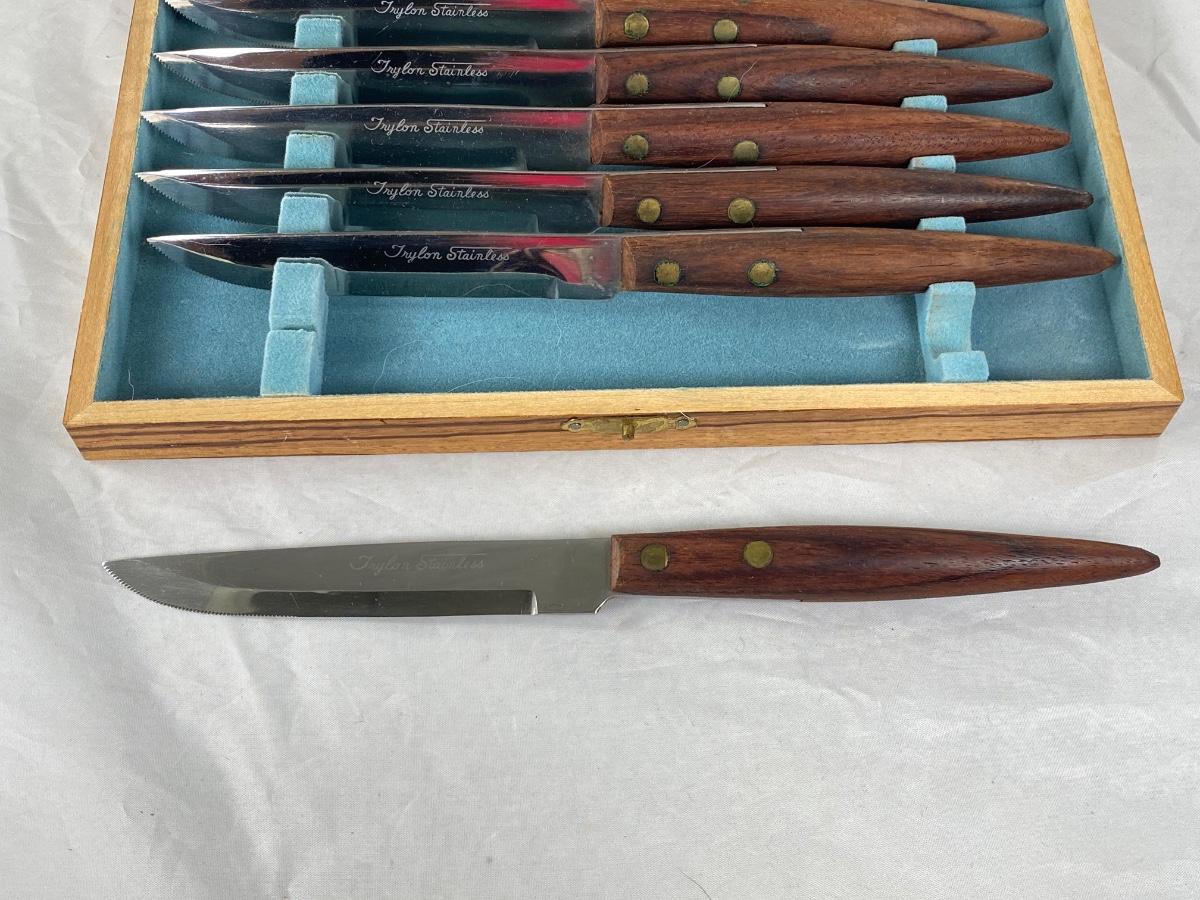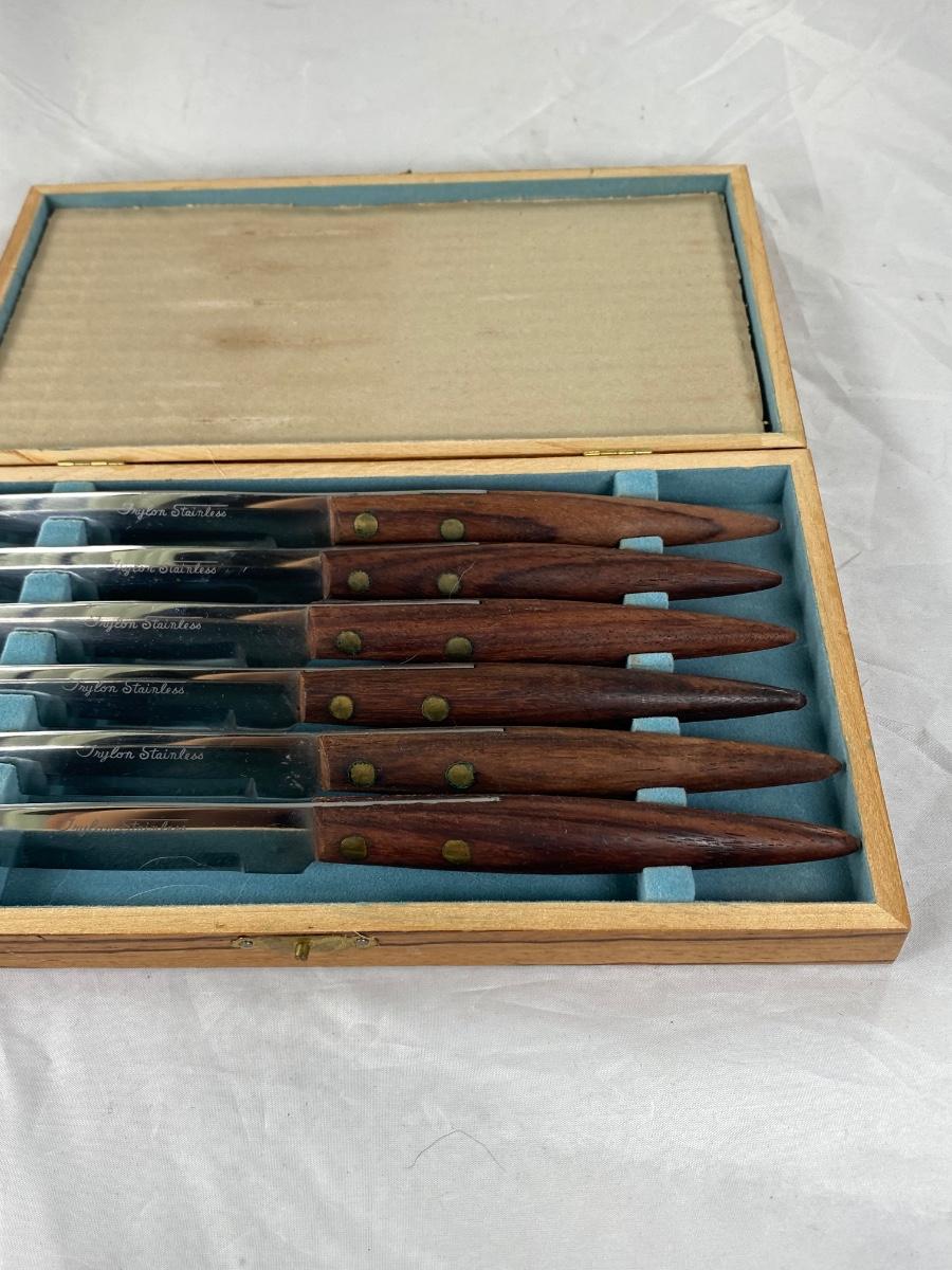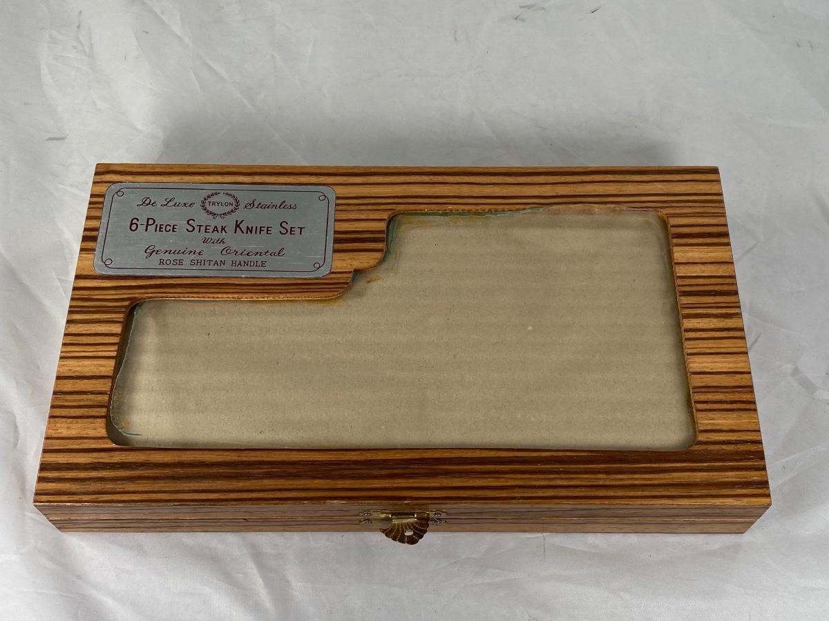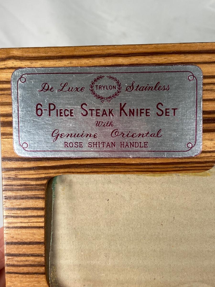 Set of 6 MCM wood handled steak knives with wood storage box. Handles are genuine Oriental rose shitan wood. In very good vintage condition. Barely used, if they were ever used.