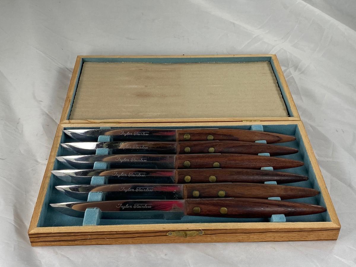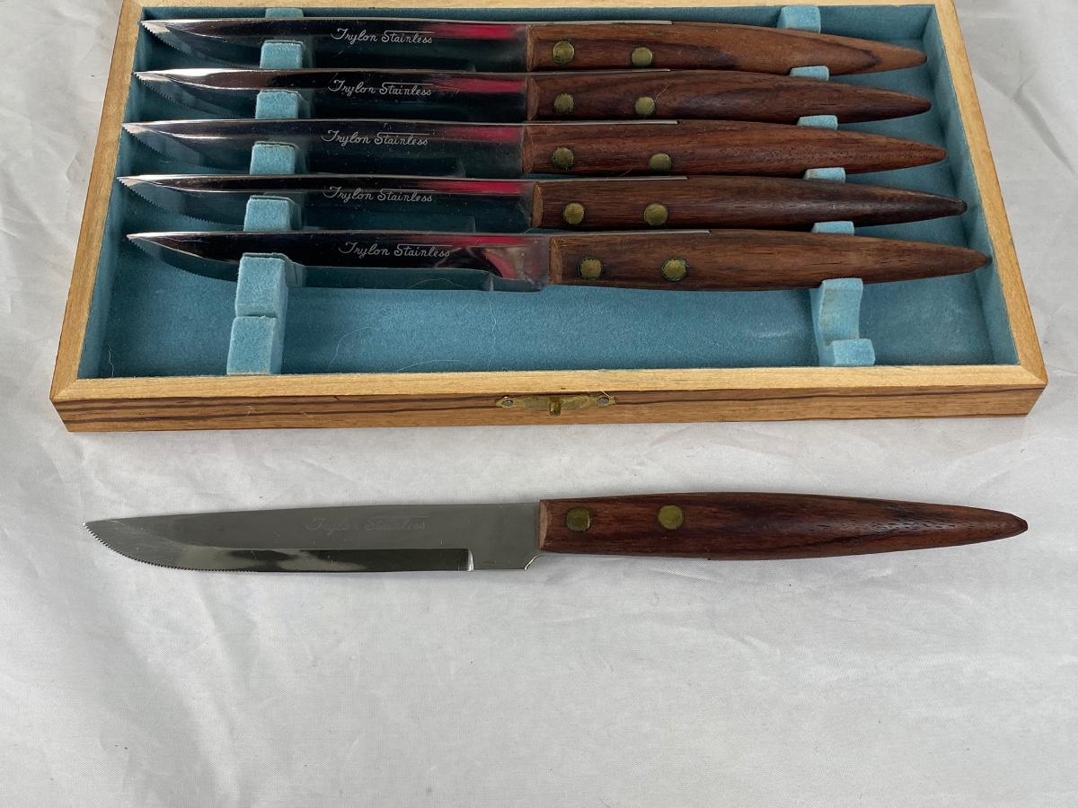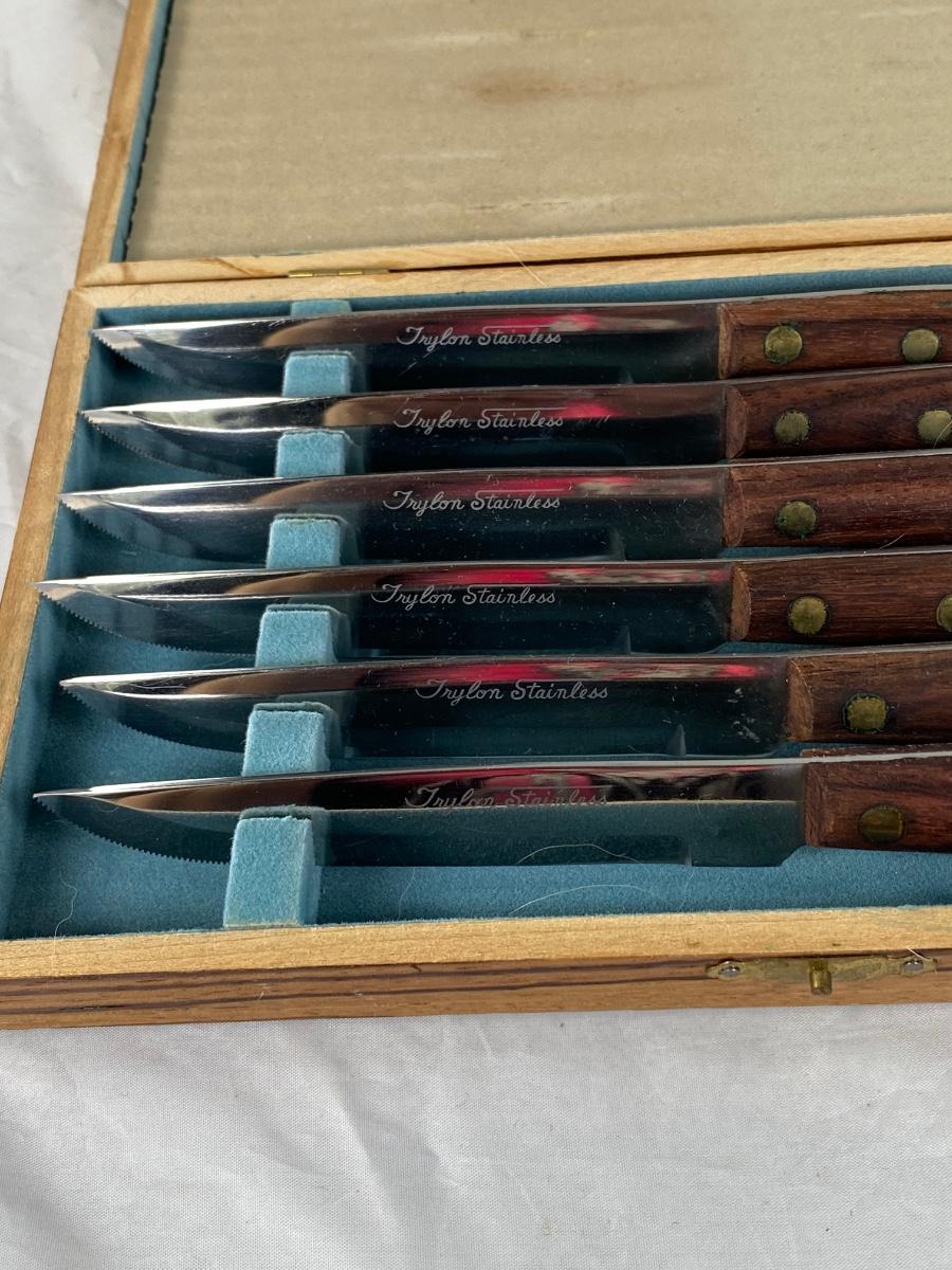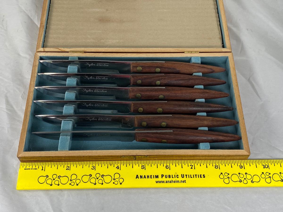 Set of 6 MCM wood handled steak knives with wood storage box. Handles are genuine Oriental rose shitan wood. In very good vintage condition. Barely used, if they were ever used.