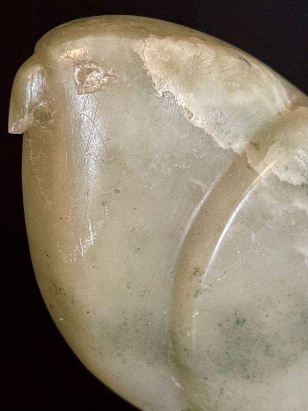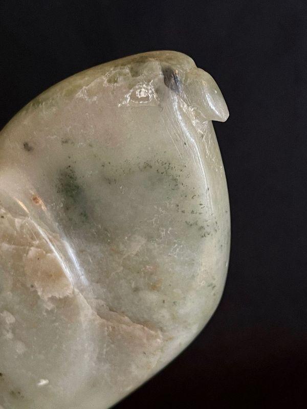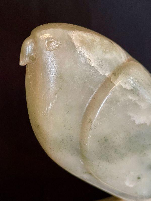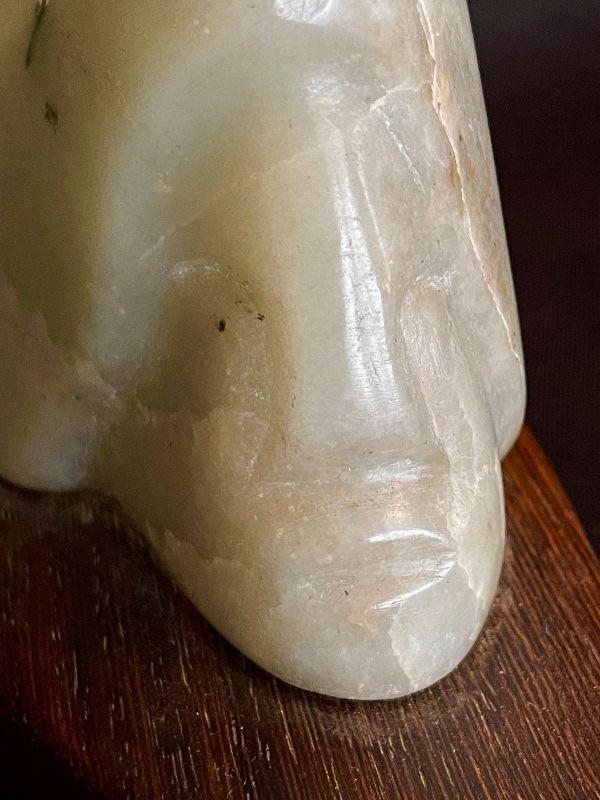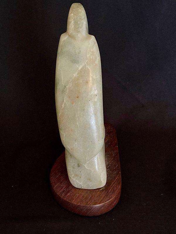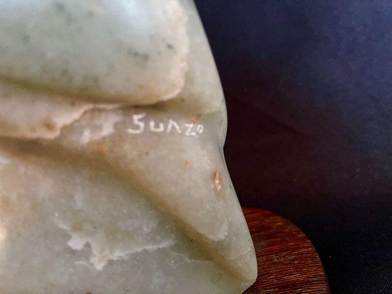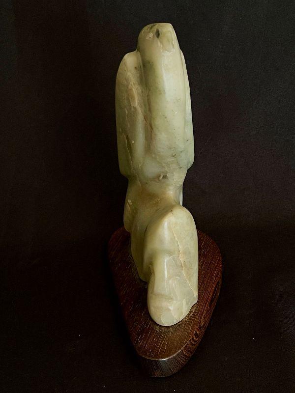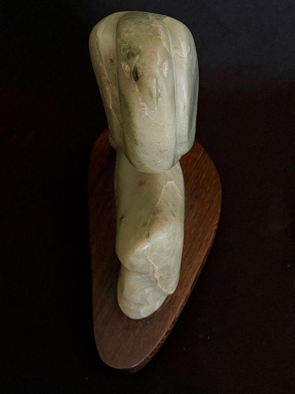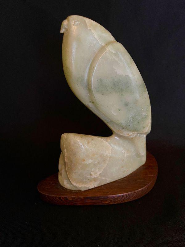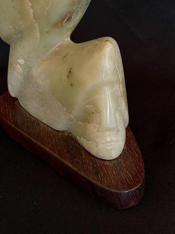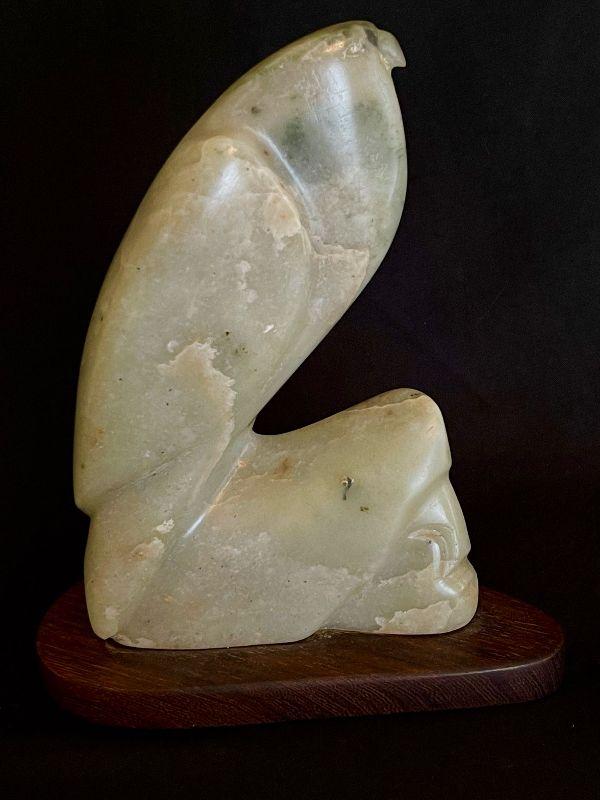 The subject item for auction sale is an alabaster stone sculpture sculpture of a bird of prey rendered profile in a variegated white to green stone with feather-like inclusions. The slightly abstracted bird shape rests on base, the front of which is fronted with a human face in profile. The whole of which is carved from a single piece and mounted to a shaped walnut base. The is one small ding about 1/8 inch long.