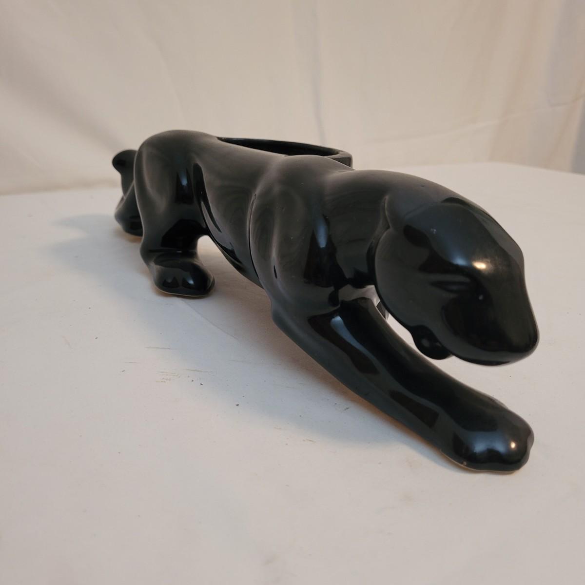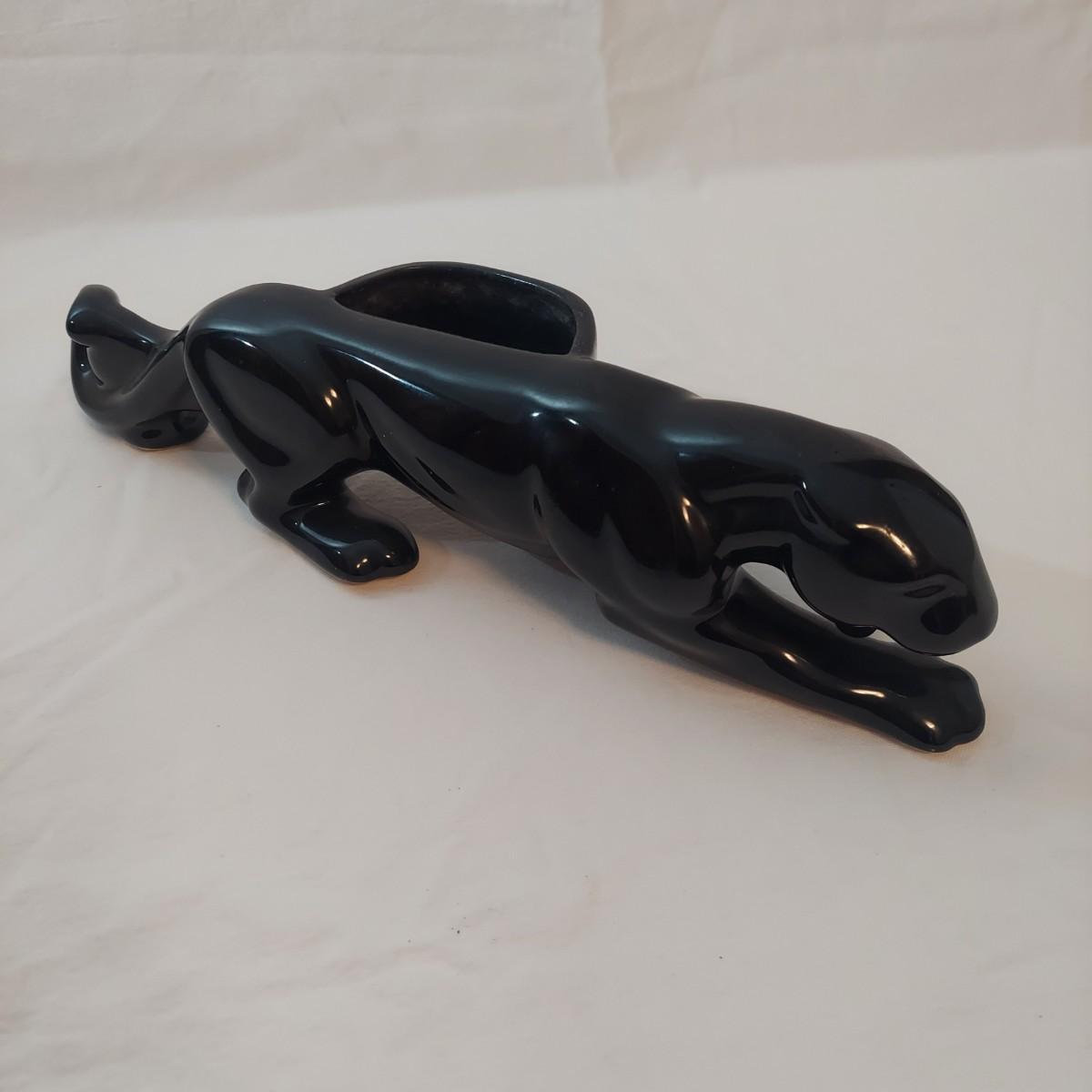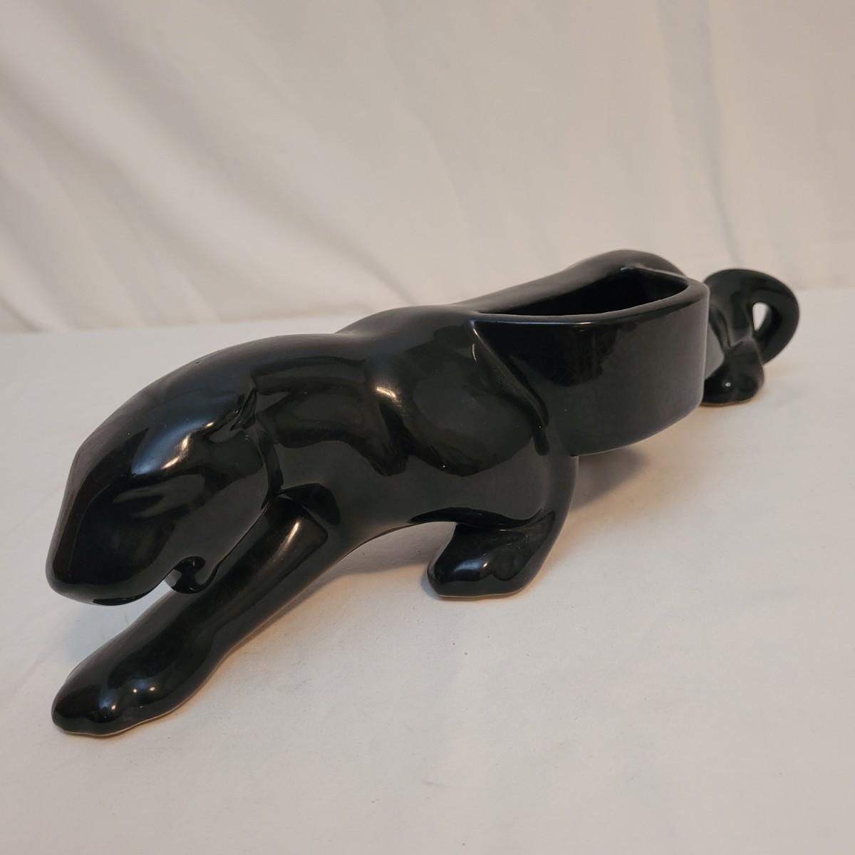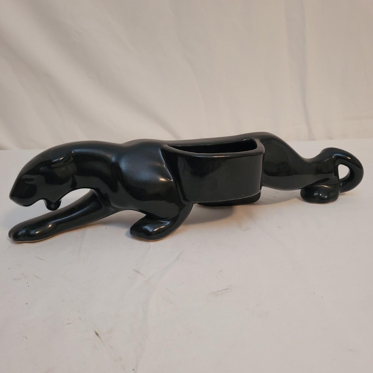 This lot includes a single mid century modern panther planter. The planter is made from ceramic and glazed in black. It depicts the panther prowling low to the ground and features a bowl shaped planter on its side.