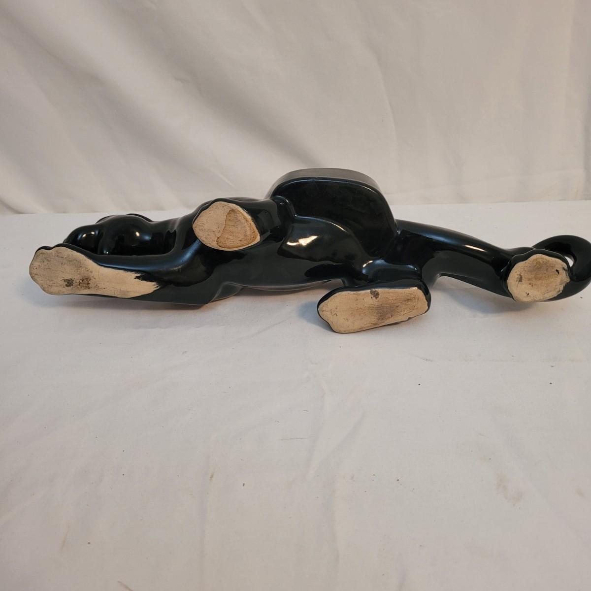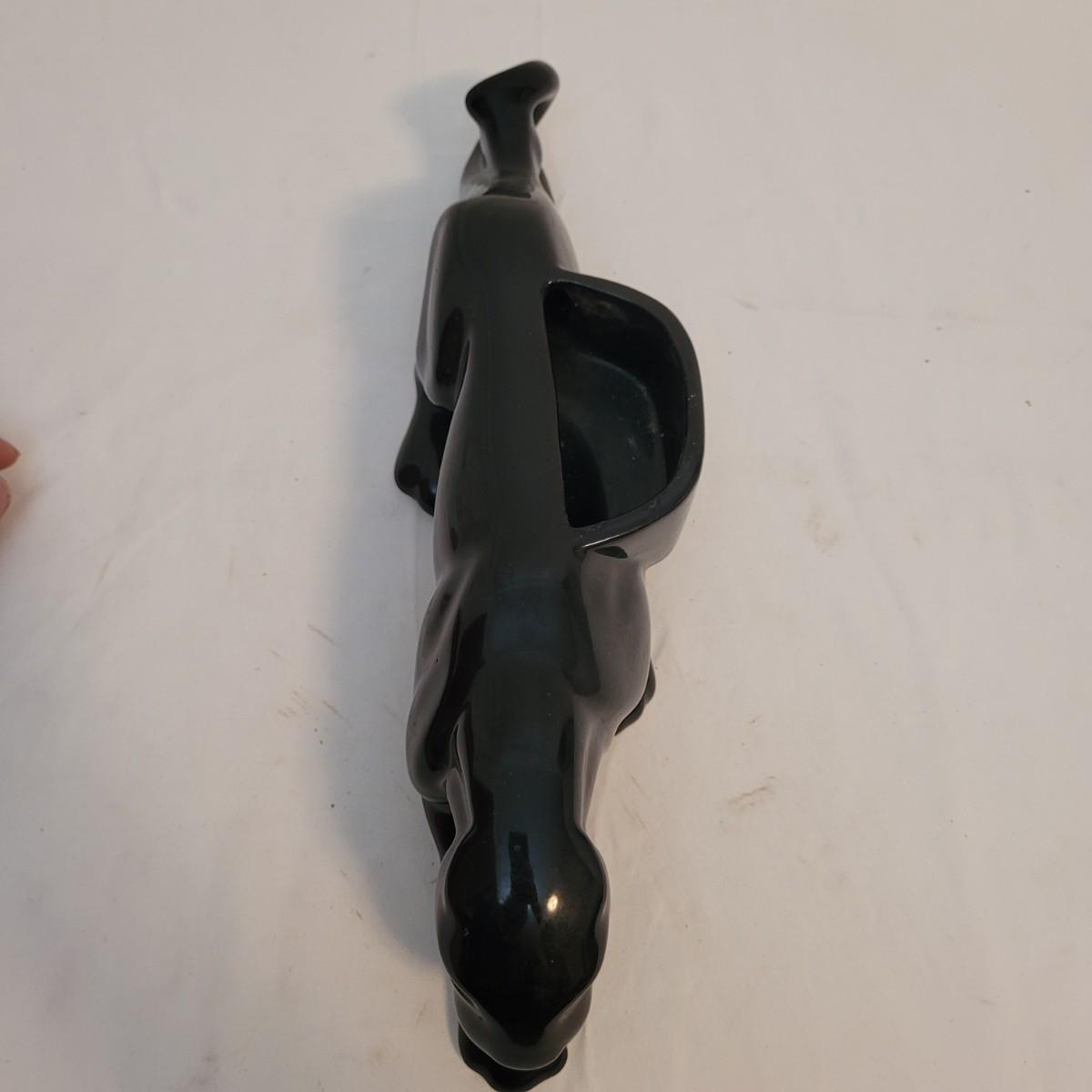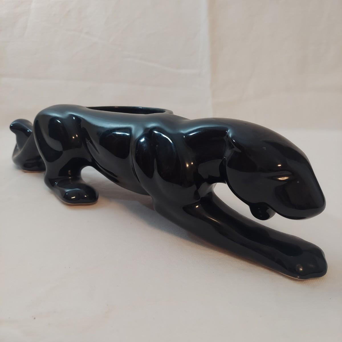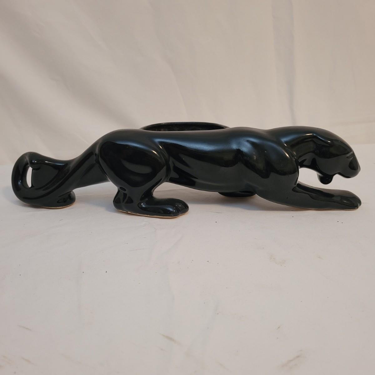 This lot includes a single mid century modern panther planter. The planter is made from ceramic and glazed in black. It depicts the panther prowling low to the ground and features a bowl shaped planter on its side.