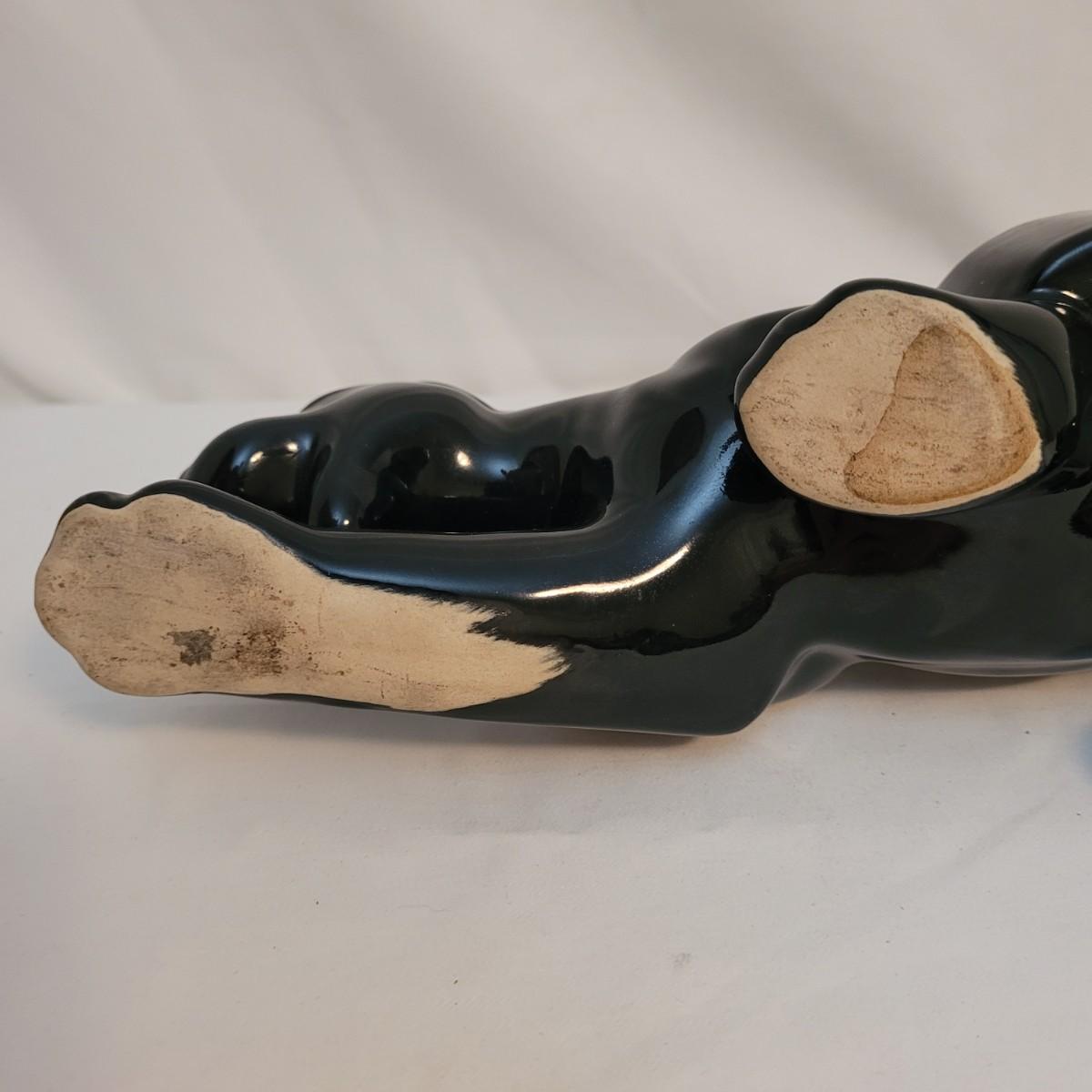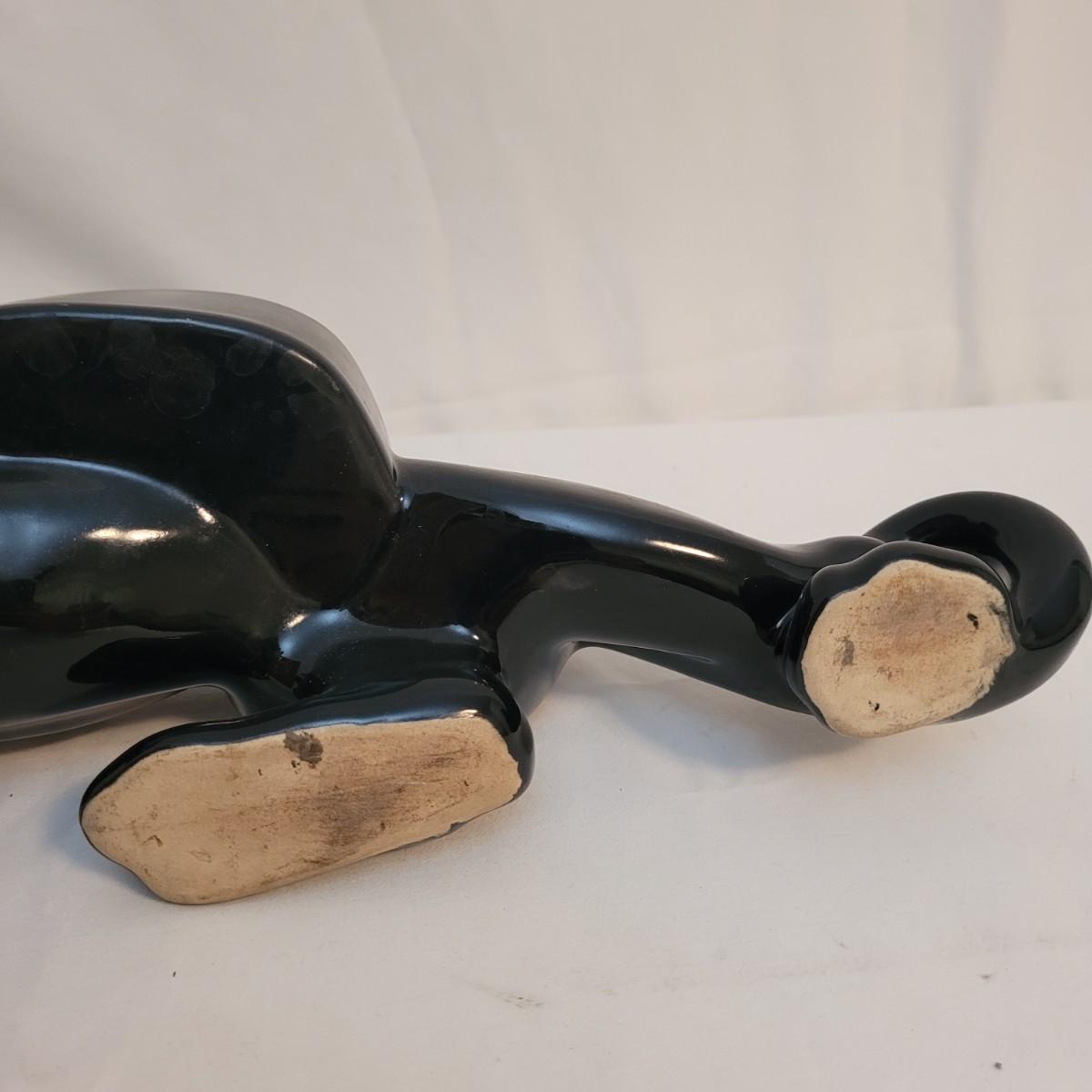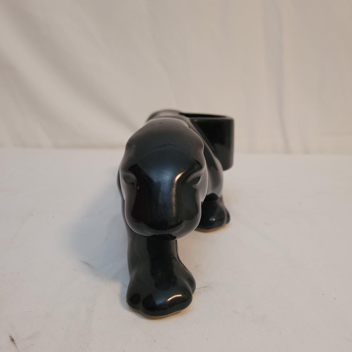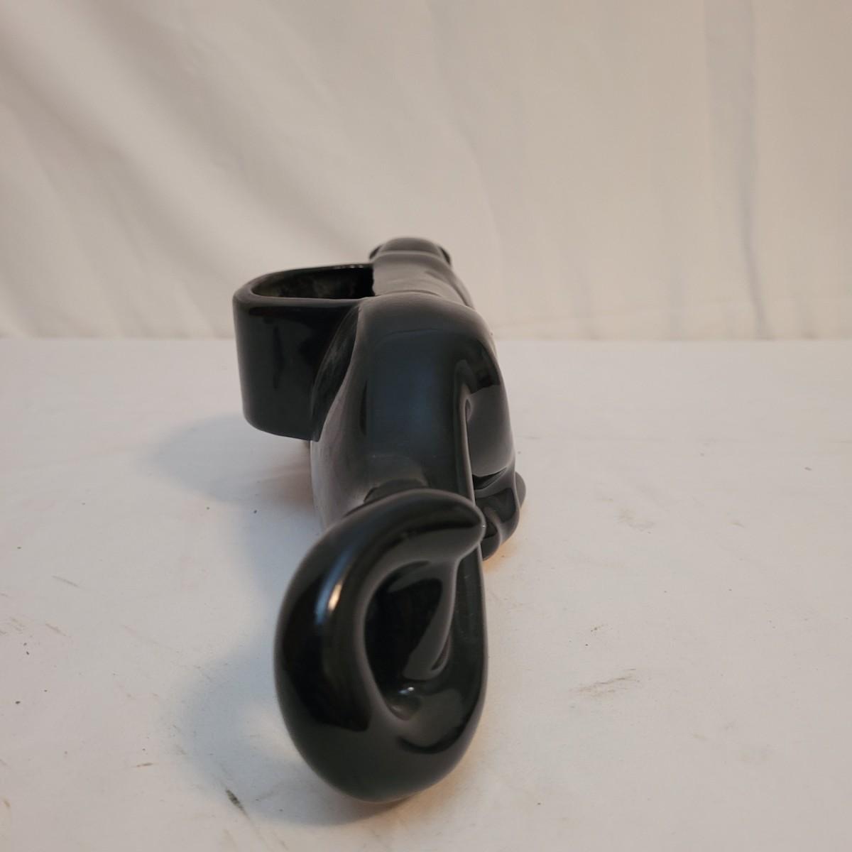 This lot includes a single mid century modern panther planter. The planter is made from ceramic and glazed in black. It depicts the panther prowling low to the ground and features a bowl shaped planter on its side.