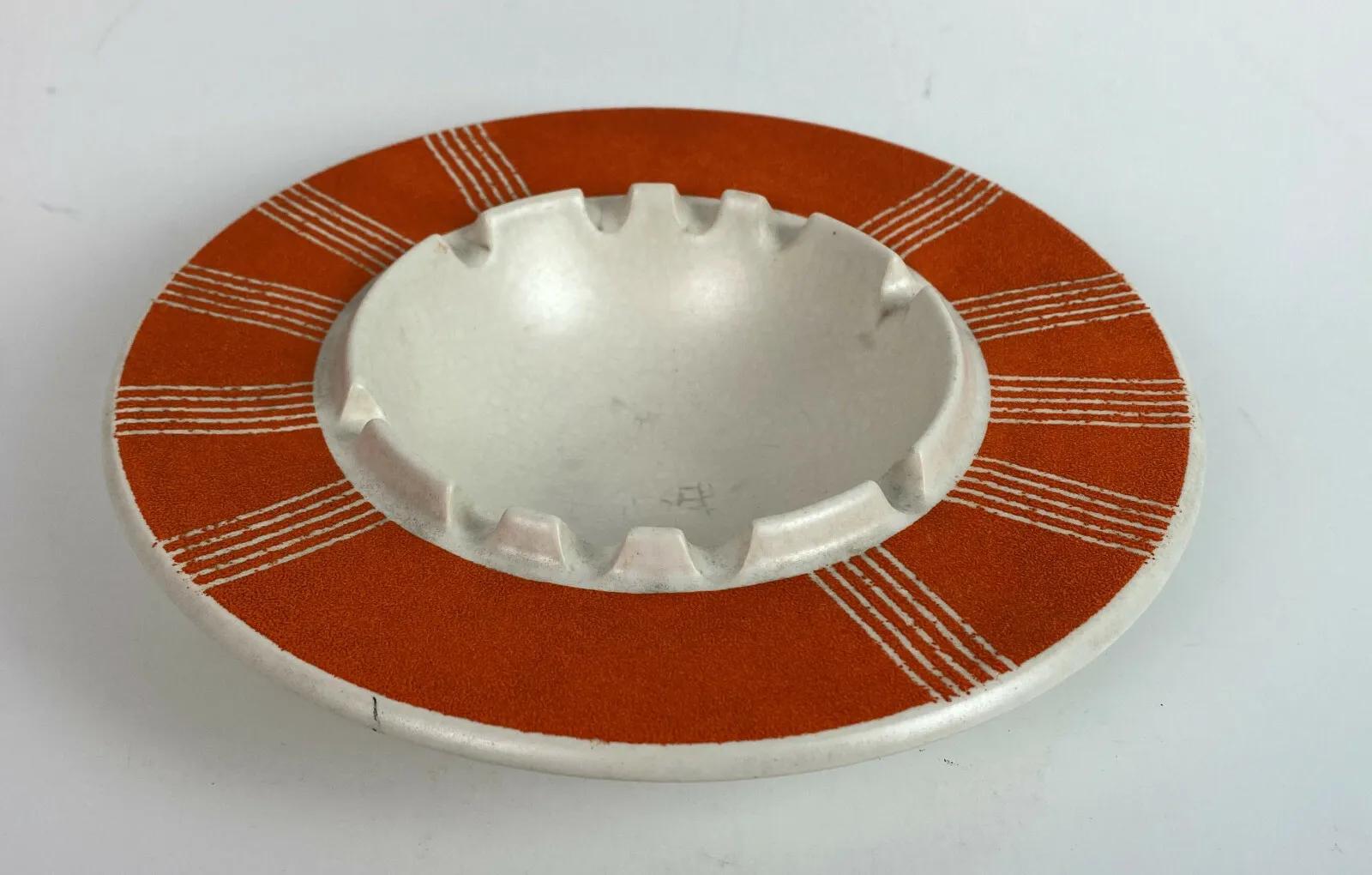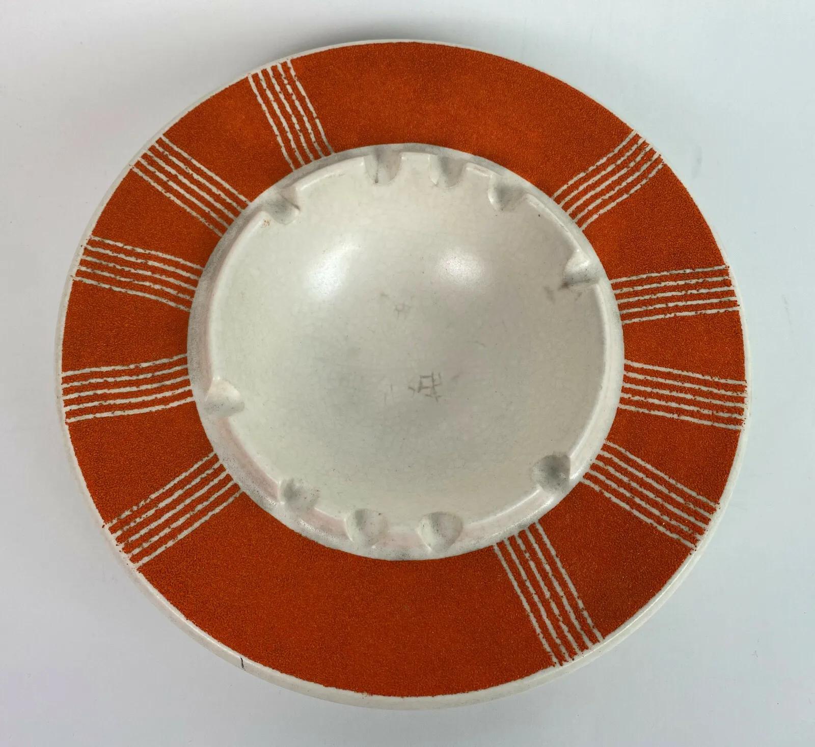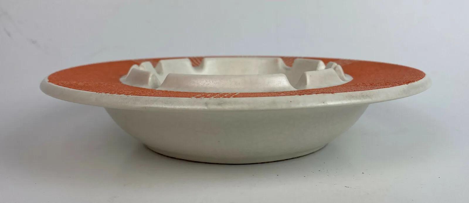 Good condition on this scarce piece from the Mid Century...an 8.25" diameter flying saucer-shaped ceramic ashtray with a plastic coated Modern design on top...No chips or cracks..only some very light normal use wear...as shown...Unknown pottery?