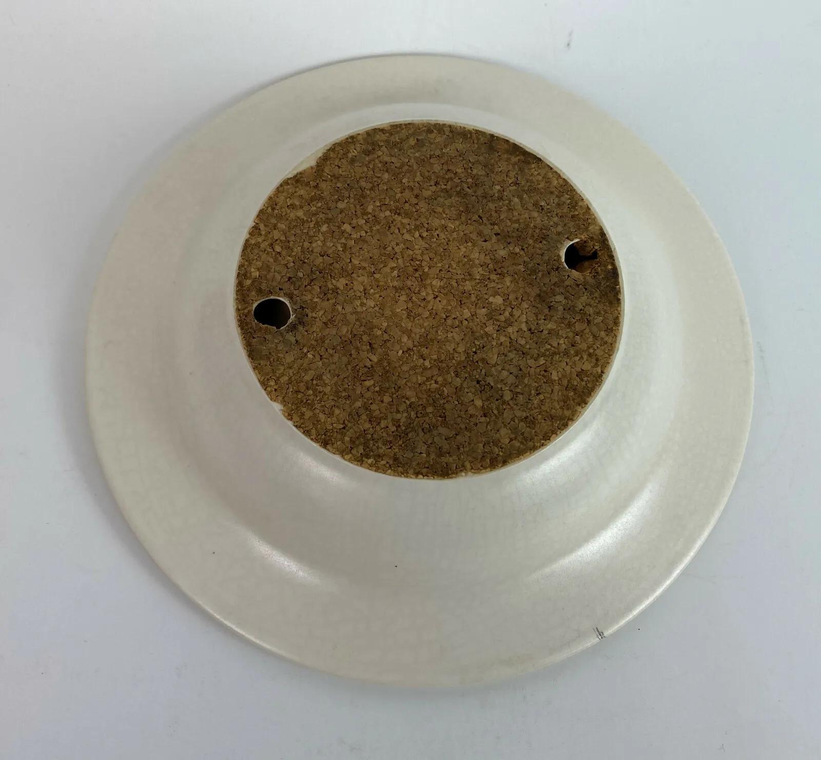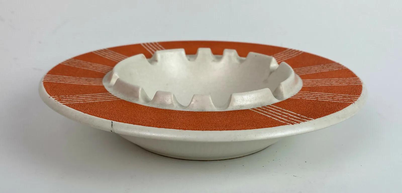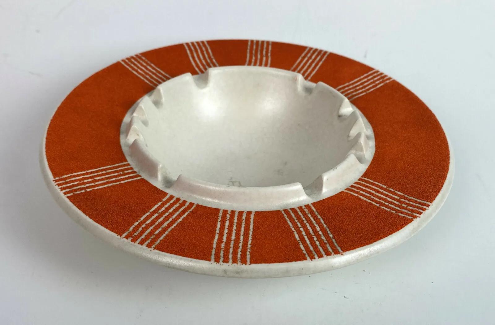 Good condition on this scarce piece from the Mid Century...an 8.25" diameter flying saucer-shaped ceramic ashtray with a plastic coated Modern design on top...No chips or cracks..only some very light normal use wear...as shown...Unknown pottery?