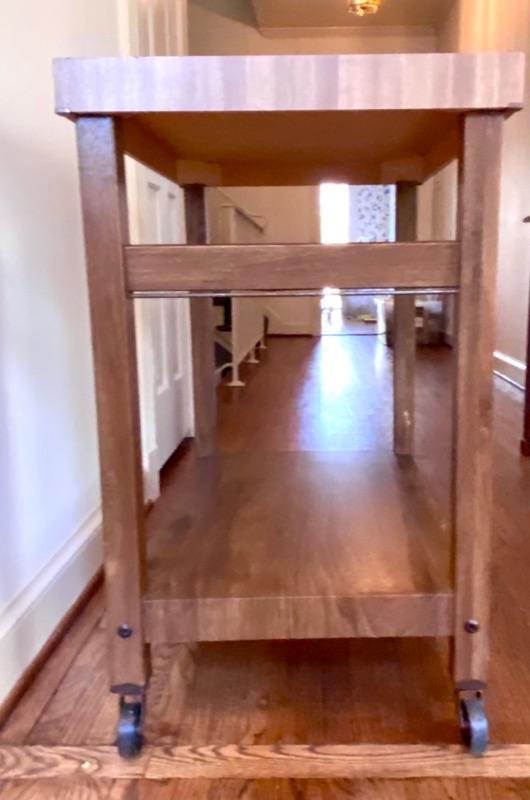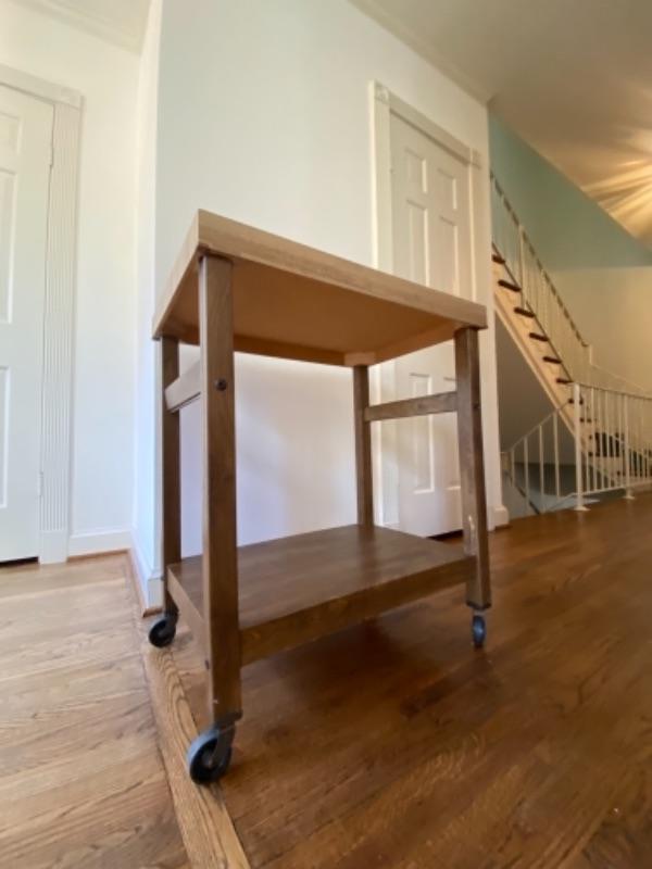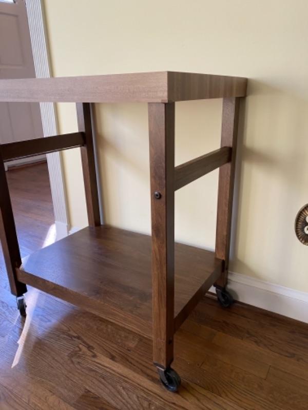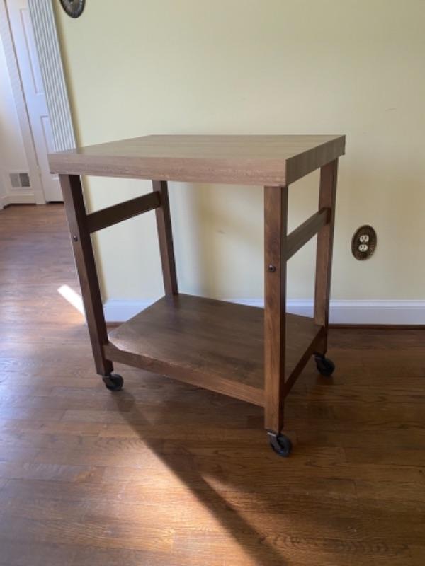 MOD wood rolling tv cart with coated “butcher block” “Rendura” coating Formica , two levels, hooded casters, great look. Sort of ash color.
