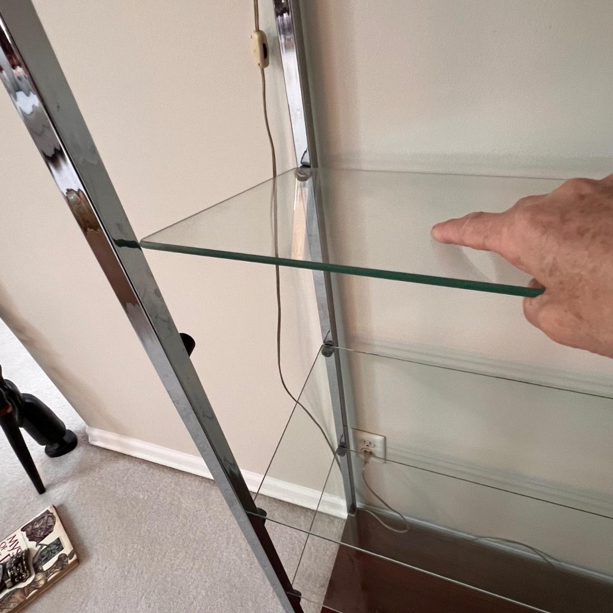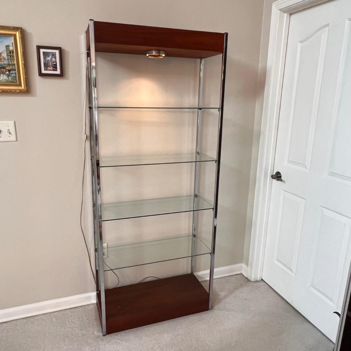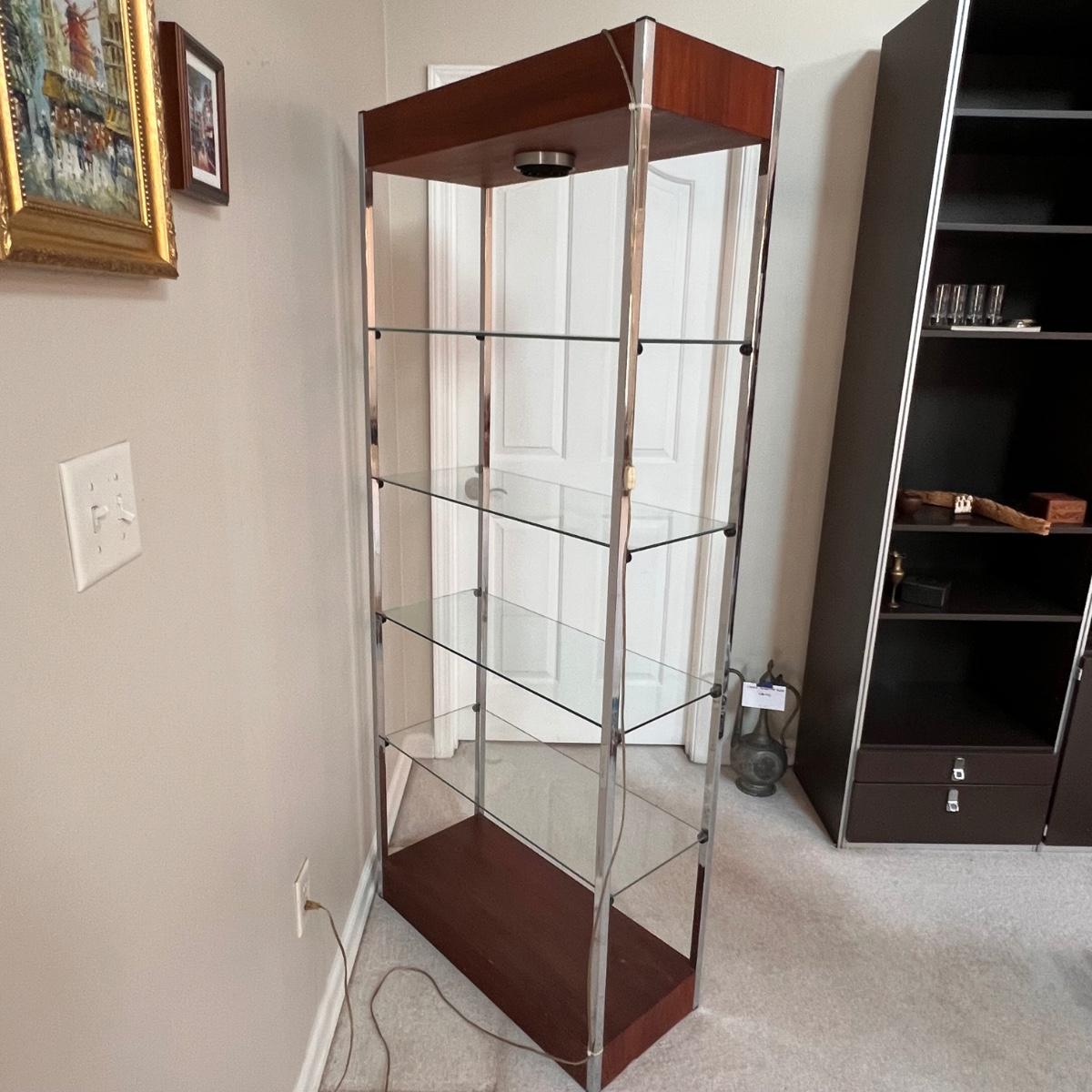This stylish MCM style shelf unit has four glass shelves that are removable to transport. The frame is chrome and beautiful striped wood for the top and bottom. The light has an in-line switch. Light turned on when unit was plugged in. Measures 30” x 13” x 72”H.