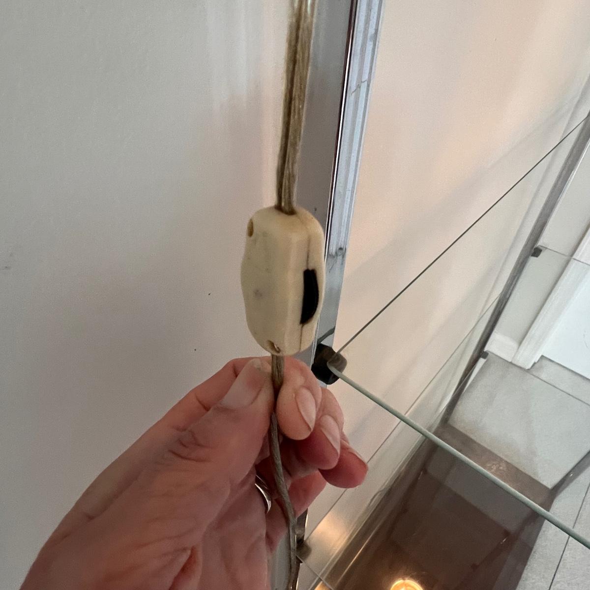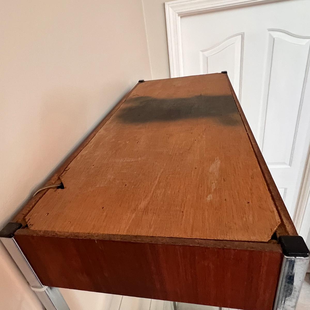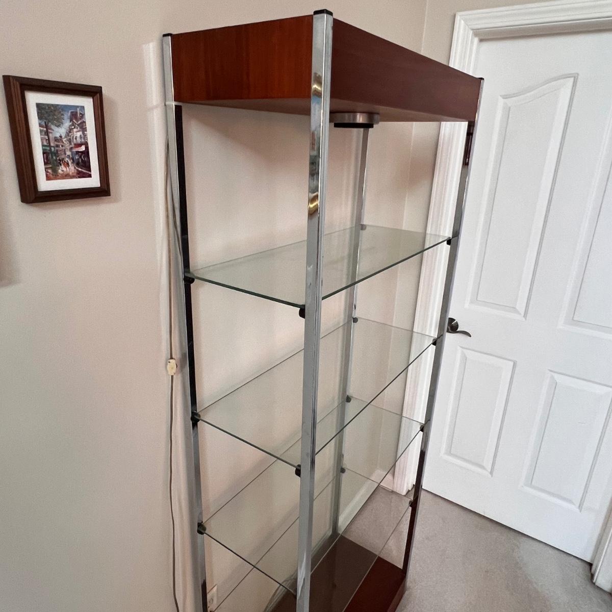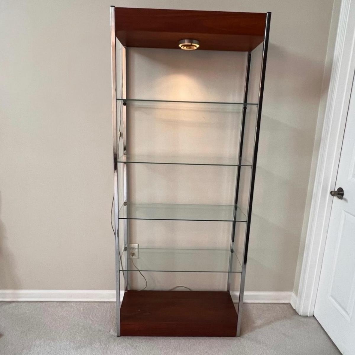 This stylish MCM style shelf unit has four glass shelves that are removable to transport. The frame is chrome and beautiful striped wood for the top and bottom. The light has an in-line switch. Light turned on when unit was plugged in. Measures 30” x 13” x 72”H.