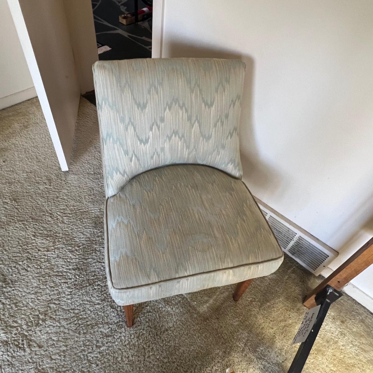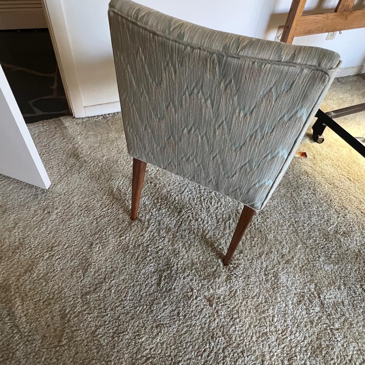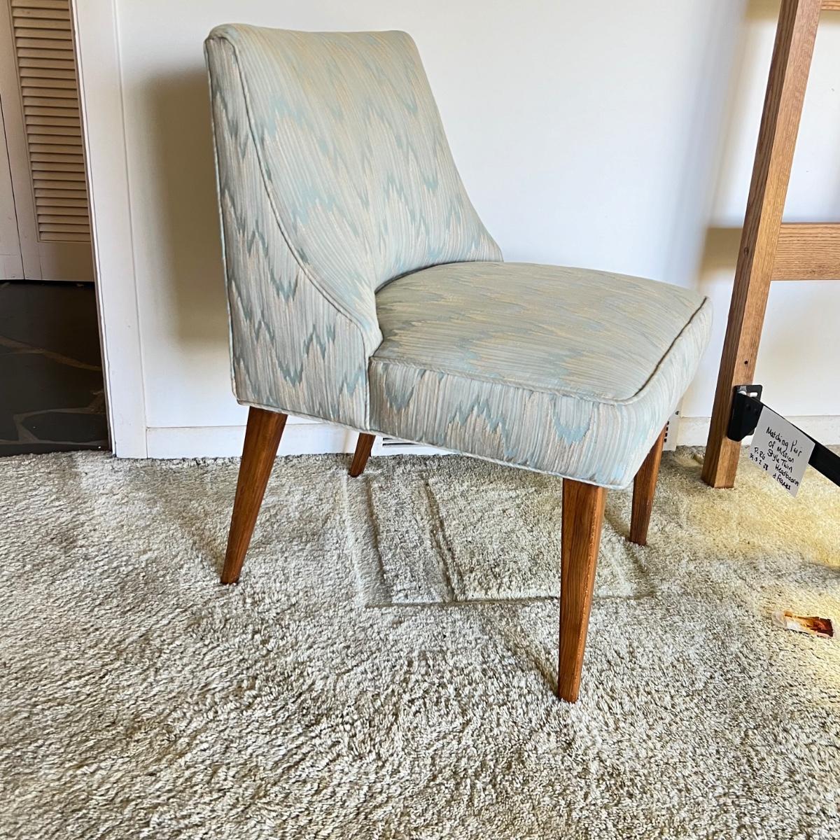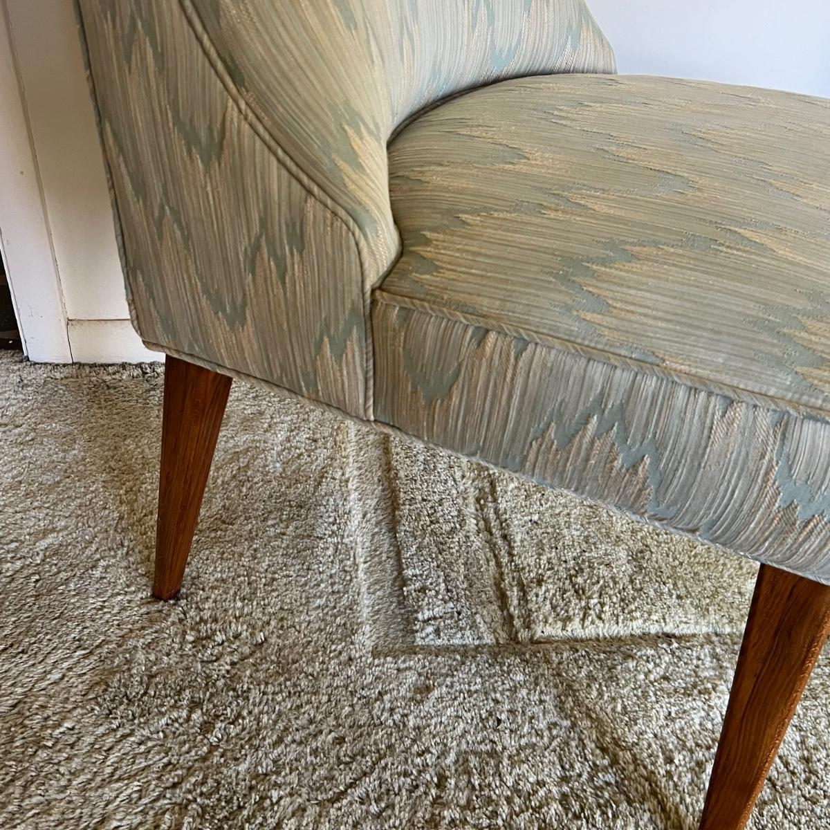 This MCM chair has an iridescent shine to its upholstery which has shades of pale blue and cream hues; there is a light water stain on the seat edge, see image.