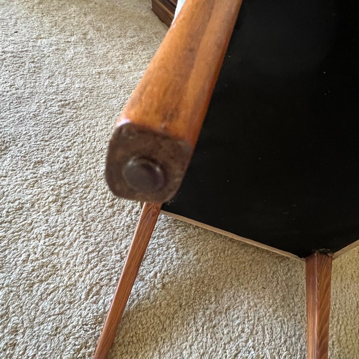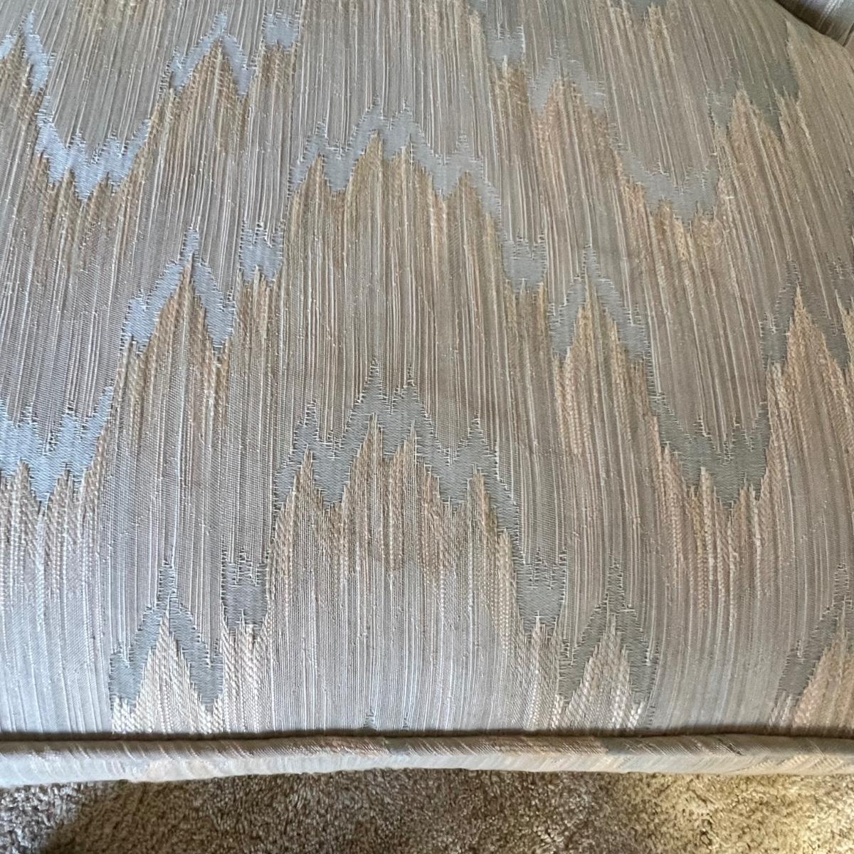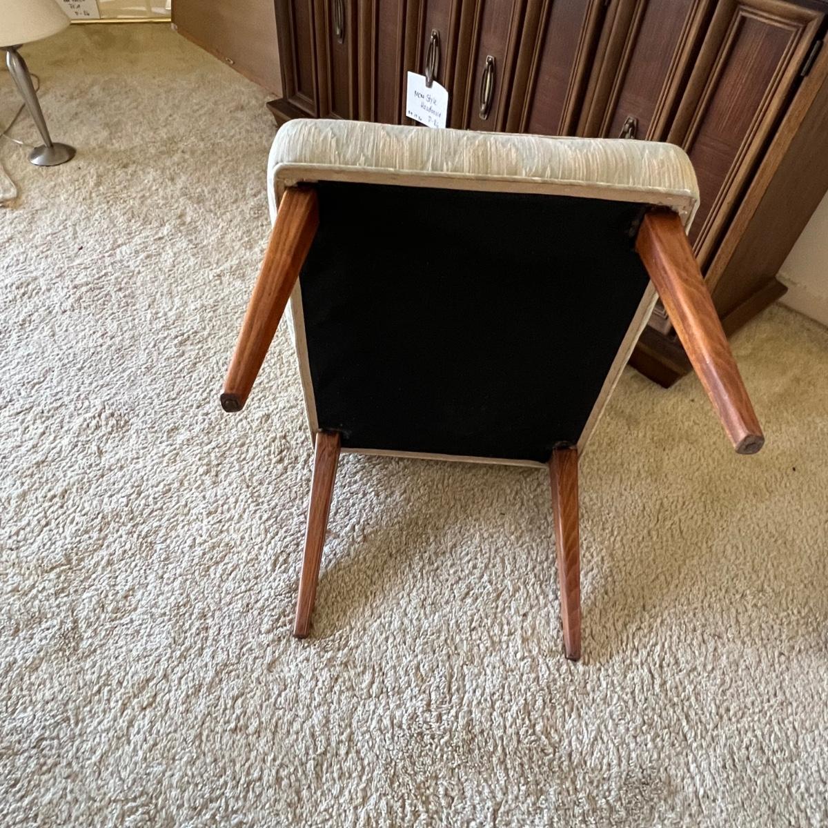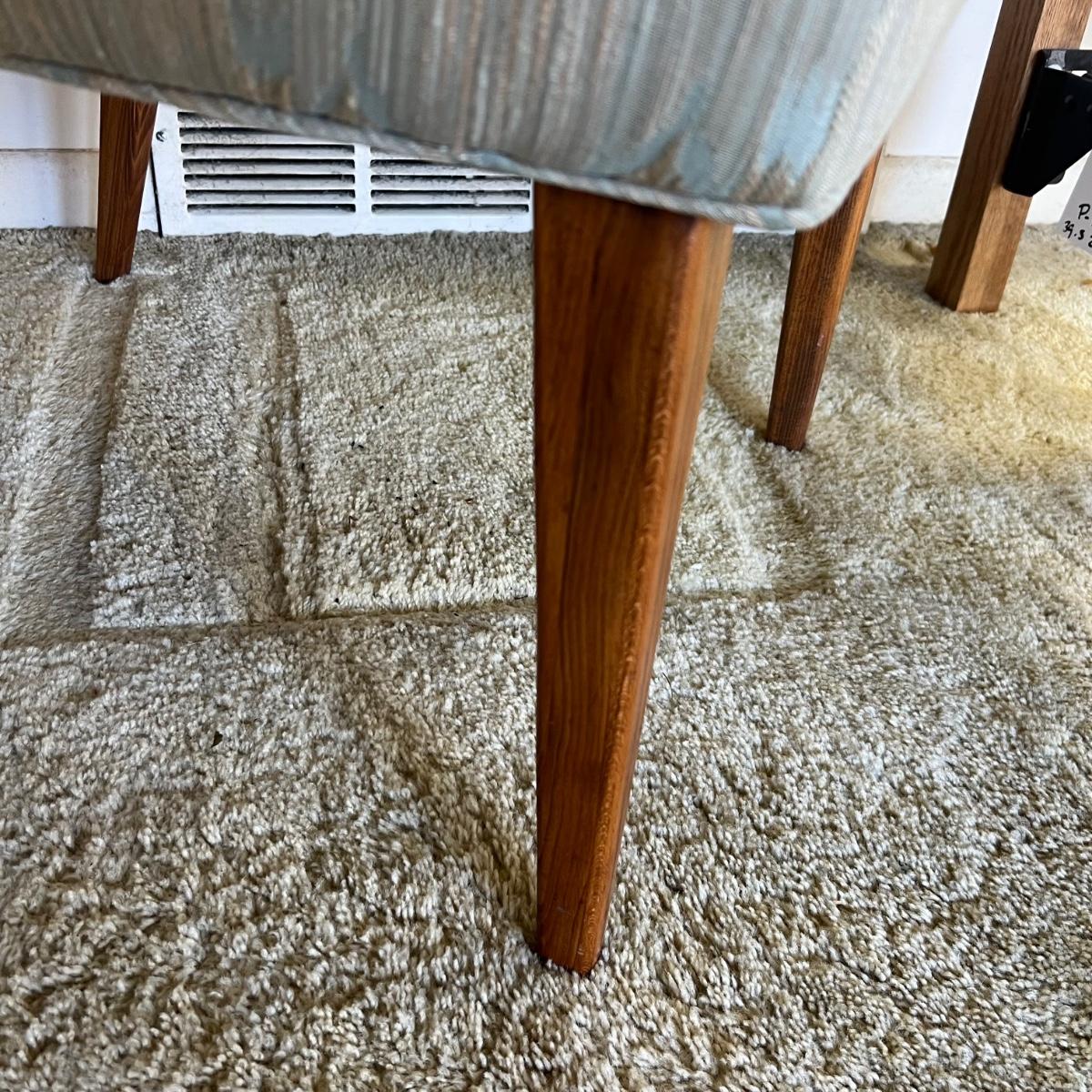 This MCM chair has an iridescent shine to its upholstery which has shades of pale blue and cream hues; there is a light water stain on the seat edge, see image.