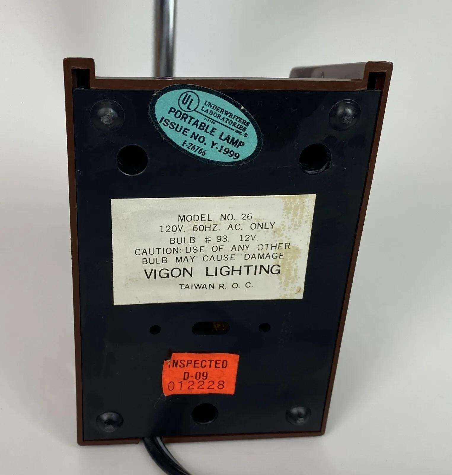 Very clean condition on this vintage 12" tall task light from the Vigon Lighting Company circa 1960's...articulated arm and cone shade...HI and LO setting...12v bulb...Working condition.