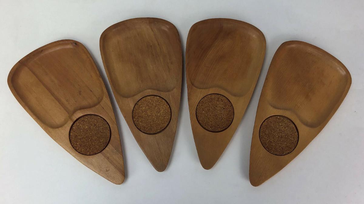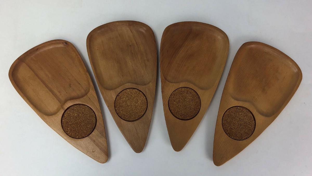 Here are a set of four(4) matching wooden Snack Plates from the Mid Century...with cork coaster inserts..Unknown maker? They each measure 10 1/4" x 5 1/2"...Excellent condition..No sign of use on this unique set of Space Age serving ware...Offered with no reserve...