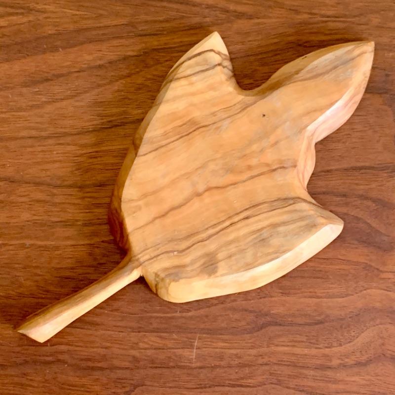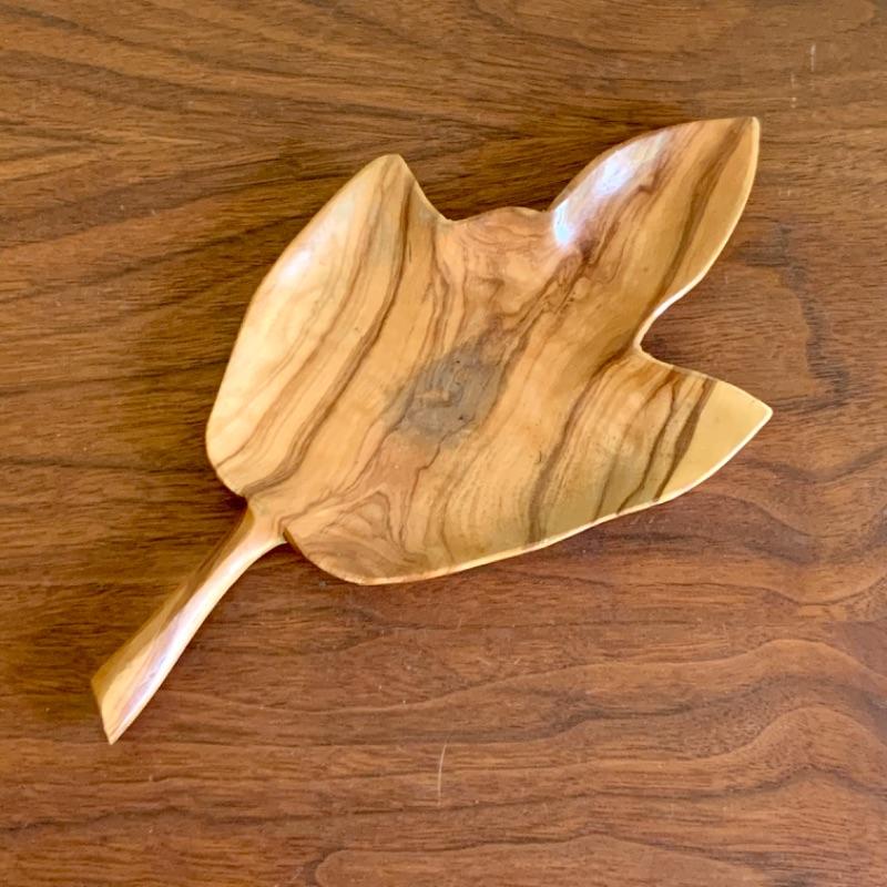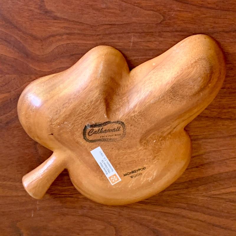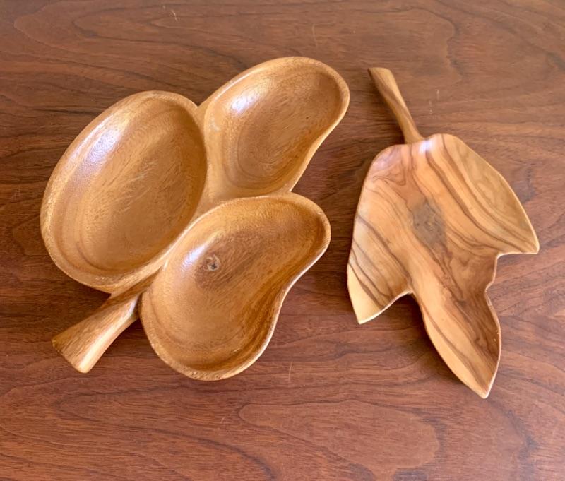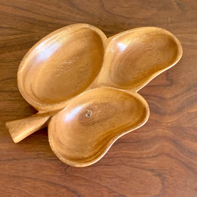 Divided bowl /dish by CalHawaii Monkeypod, 8” x 11”. Maple leaf shape, 5 1/2” x 10 1/2.” Wear typical for age. No cracks, chips.