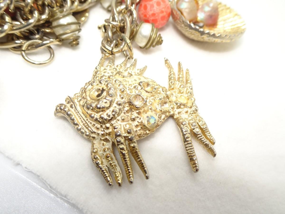 Mid Century Nautical Oversized Charm Bracelet, Seashells, Angel Fish, Eiffel Tower