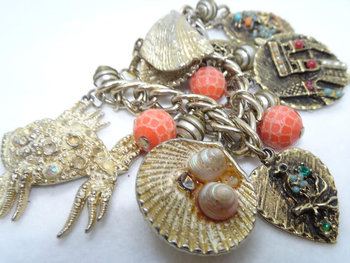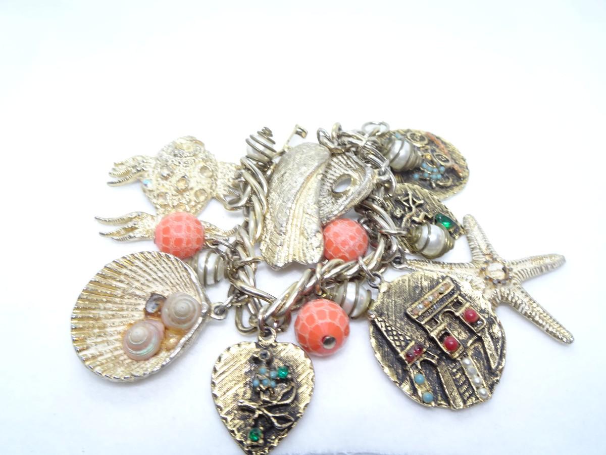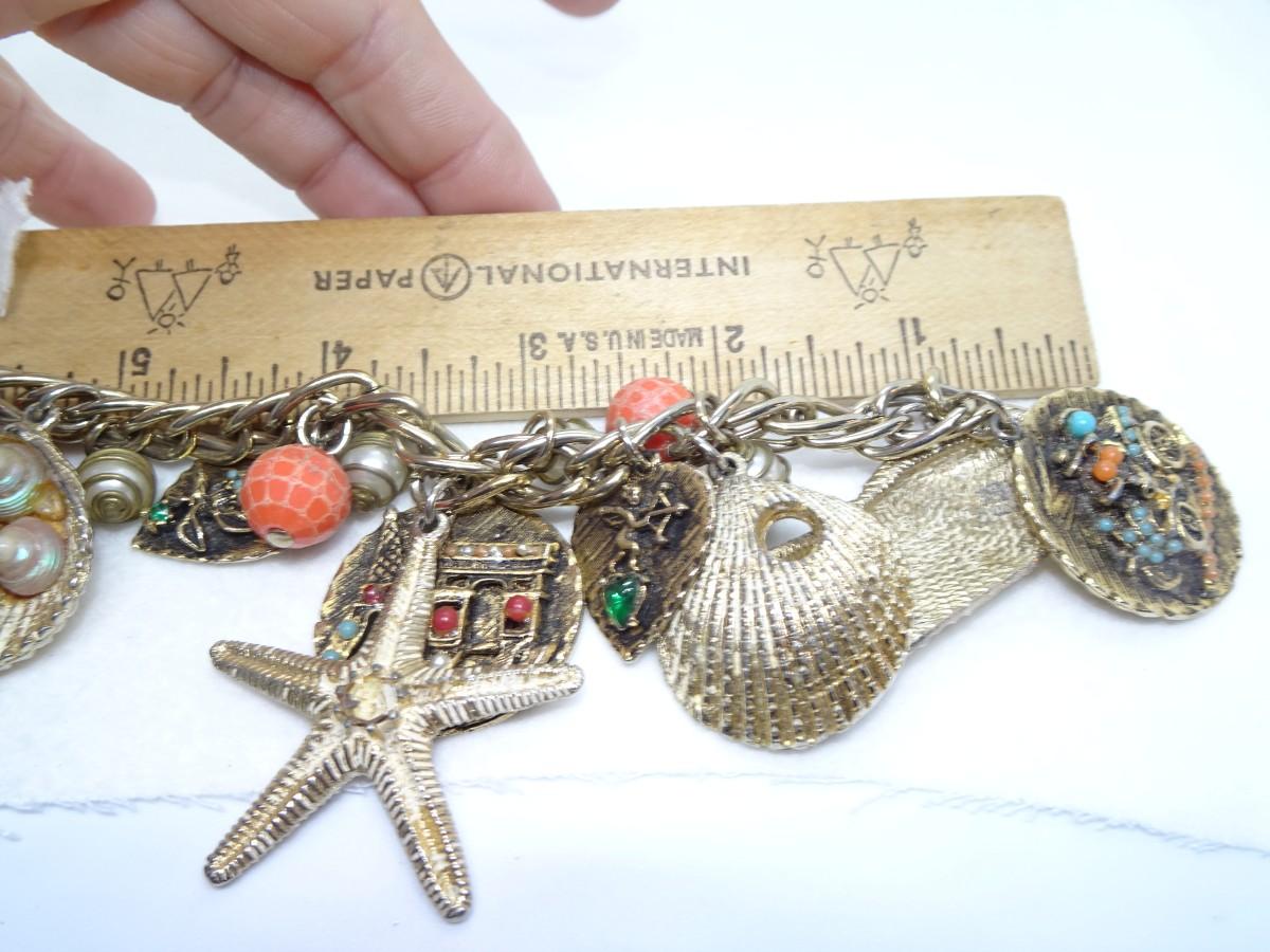 Mid Century Nautical Oversized Charm Bracelet, Seashells, Angel Fish, Eiffel Tower, Starfish