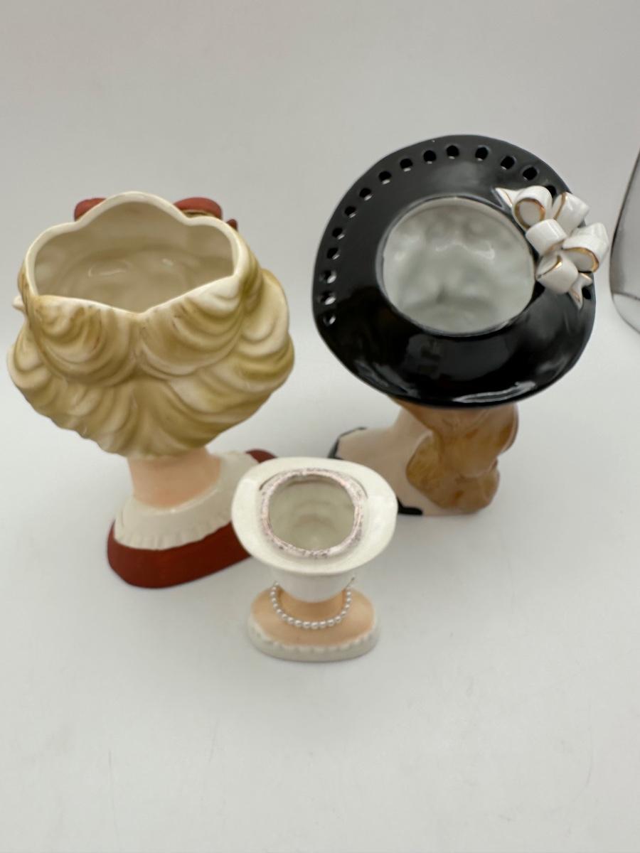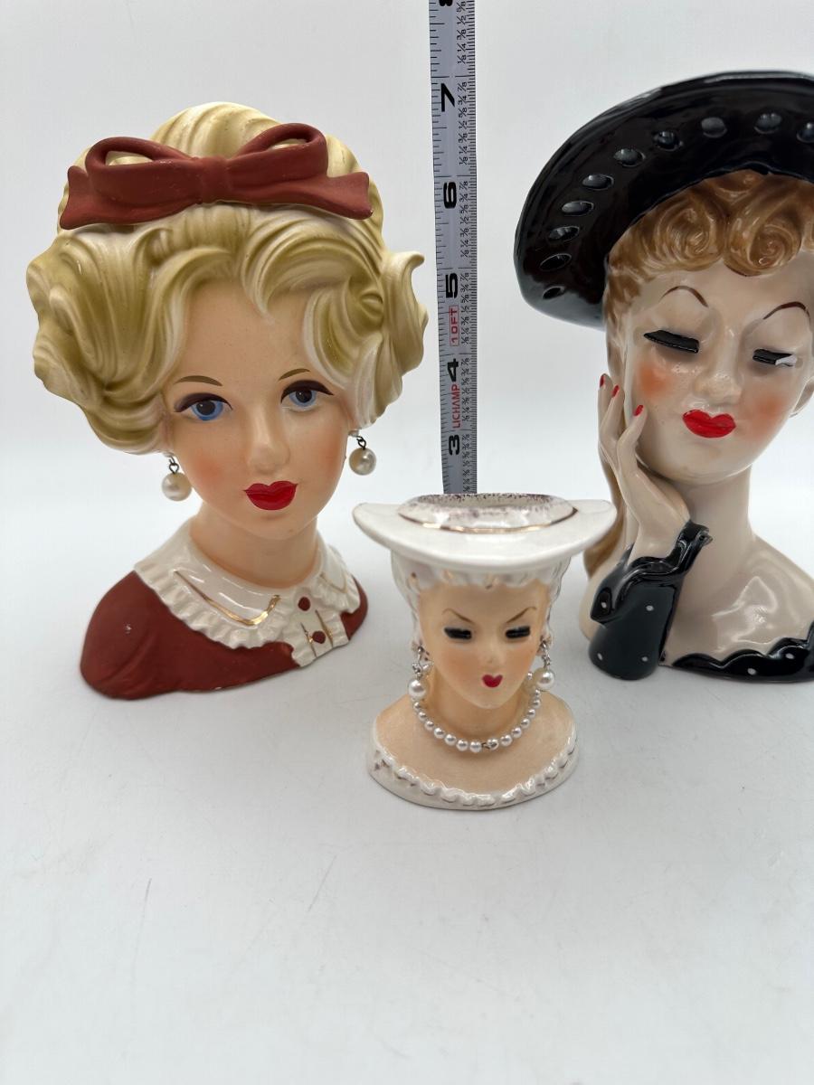 Richly hand painted vintage lady head vases. See pictures for eyelash condition on one. We’ve all been there, right ladies? Wink, wink!