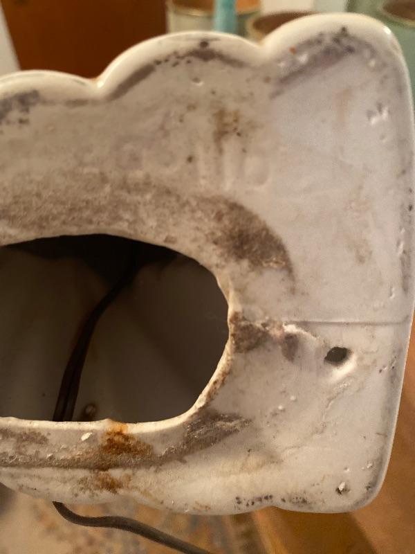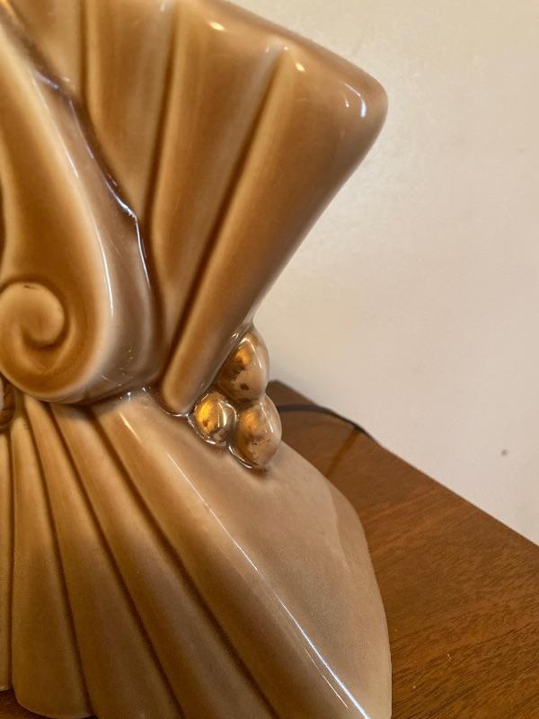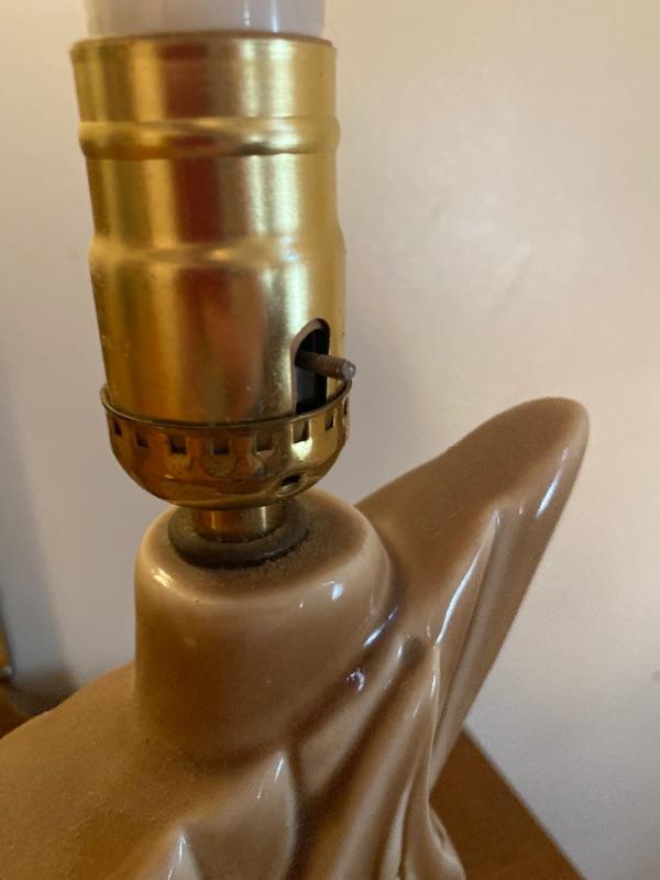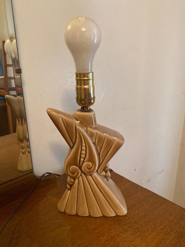 Vintage Mid Century Table Lamp. Beige and gold finished pottery. Gold accent has worn a bit. Needs a new knob to turn on/off so I couldn’t test it. No chips. Stands 11” at top of fixture and is about 6” wide. There is some numbers on the bottom but didn’t notice a maker.